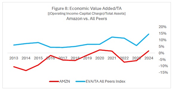 我们进一步根据产生利润的能力来考虑亚马逊的投资绩效,采用EVA/TA。在图8中,很明显亚马逊通常落后于同行,并且在过去五年中经历了有意义的相对下滑。