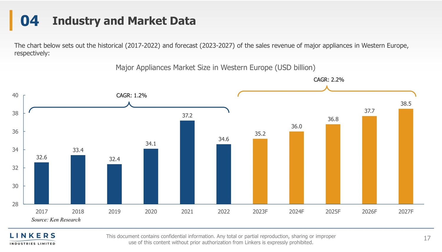 这份文件包含机密信息。未经链接者事先授权,任何全部或部分复制、共享或不当使用本内容的行为,均被明确禁止。西欧主要家电市场规模(十亿美元)04行业和市场数据17资料来源:Ken Research 32.63 3.43 2.43 4.13 7.23 4.635.2 36.03 6.83 7.7 38.5283032343638402017201820192020202120222023F 2024F 2025F 2026F 2027F CAGR:1.2%下图分别列出西欧主要家电销售收入的历史(2017-2022年)和预测(2023-2027年):CAGR:2.2%