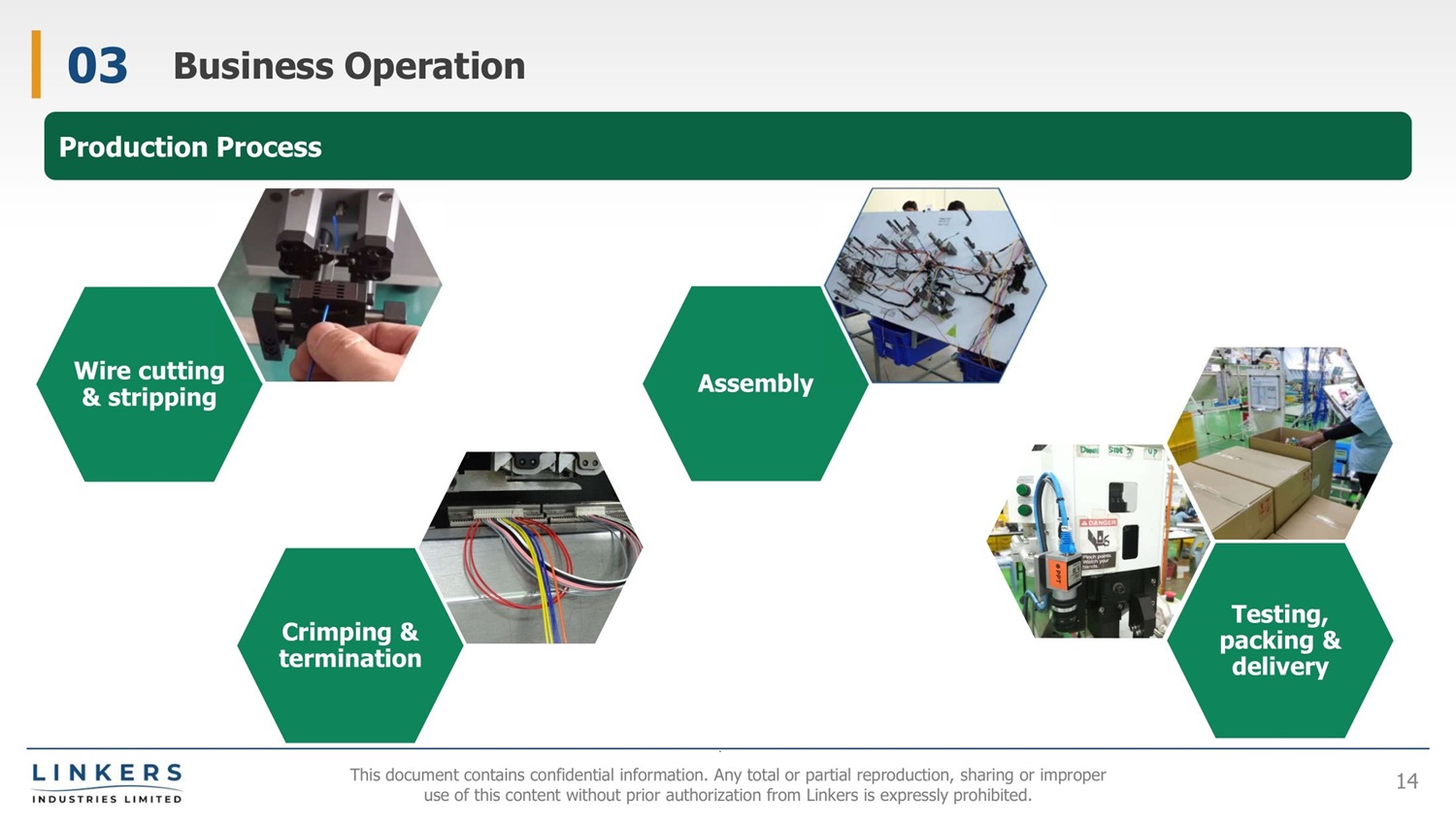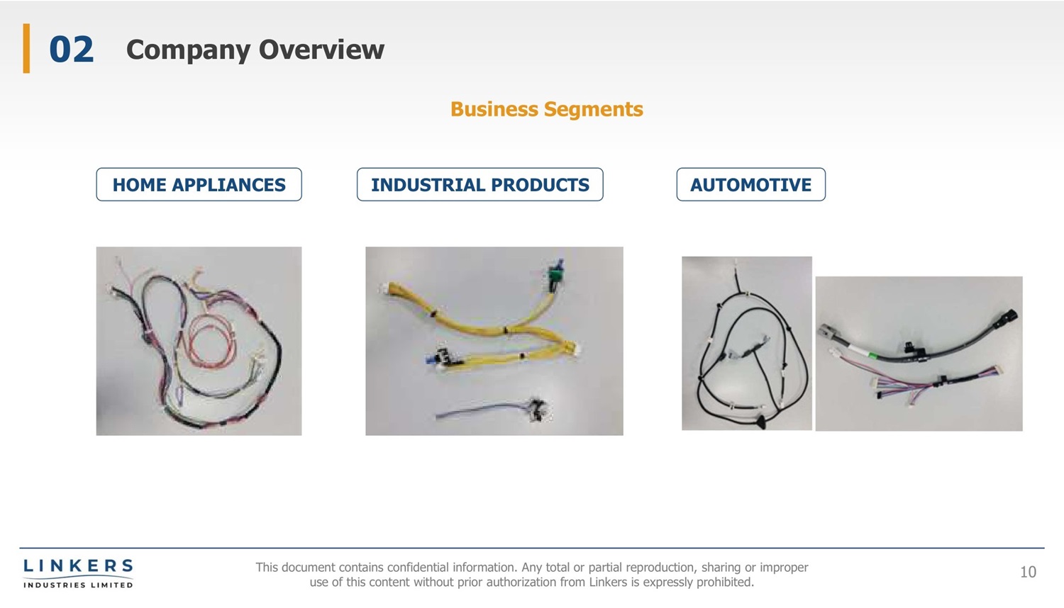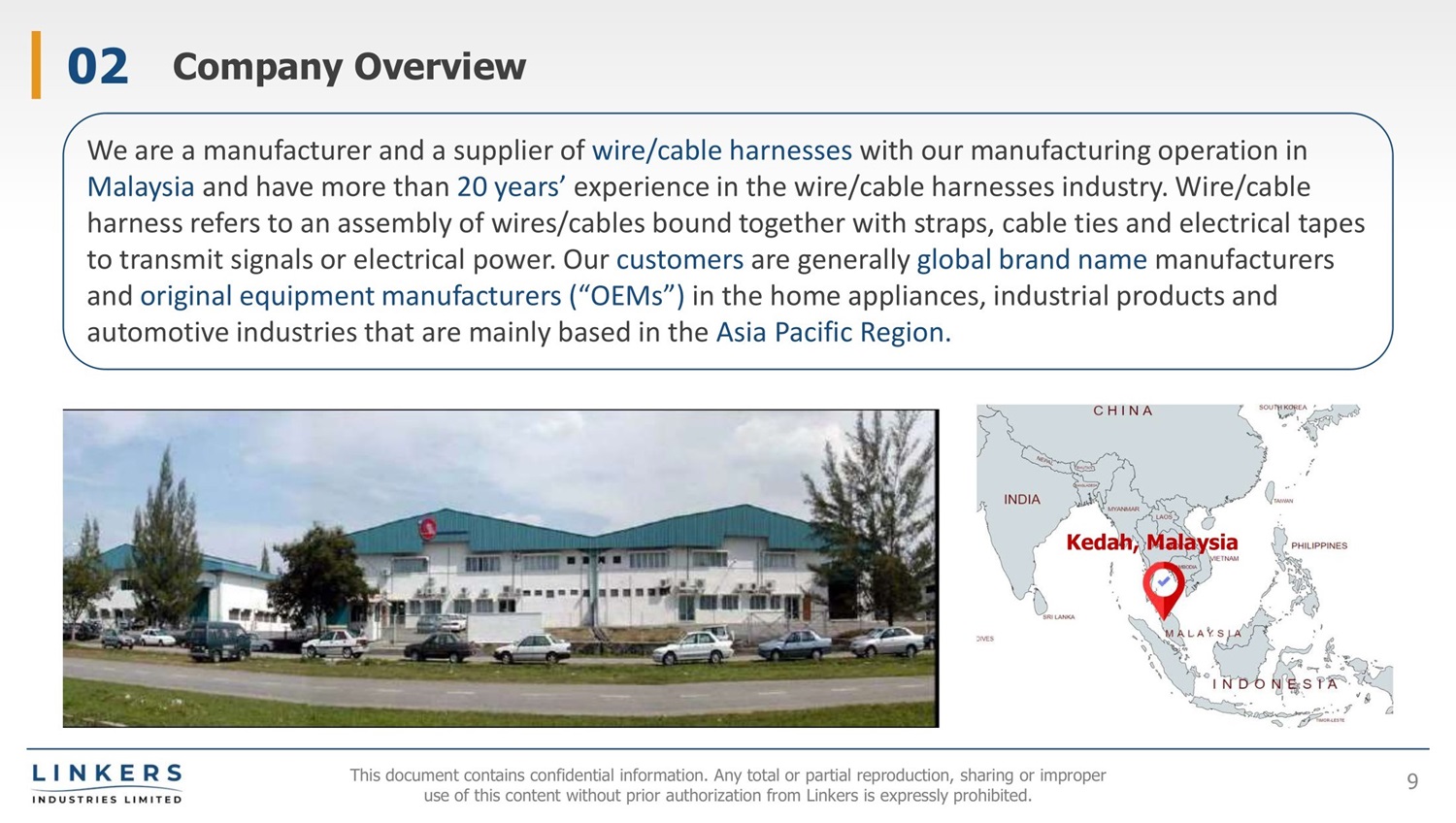 这份文件包含机密信息。未经链接者事先授权,任何全部或部分复制、共享或不当使用本内容的行为,均被明确禁止。02公司概况我们是电线/电缆线束的制造商和供应商,我们的制造业务位于马来西亚,在电线/电缆线束行业拥有20多年的经验。电线/电缆线束是指电线/电缆与带子、电缆扎带和电工胶带捆绑在一起,用以传输信号或电力的总成。我们的客户一般是主要以亚太地区为基地的家电、工业产品和汽车行业的全球品牌制造商和原始设备制造商(“OEM”)。9马来西亚吉打州