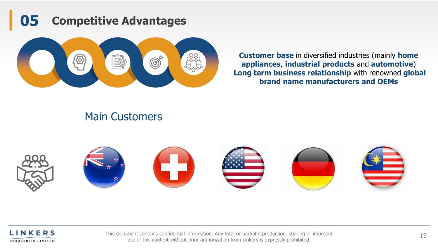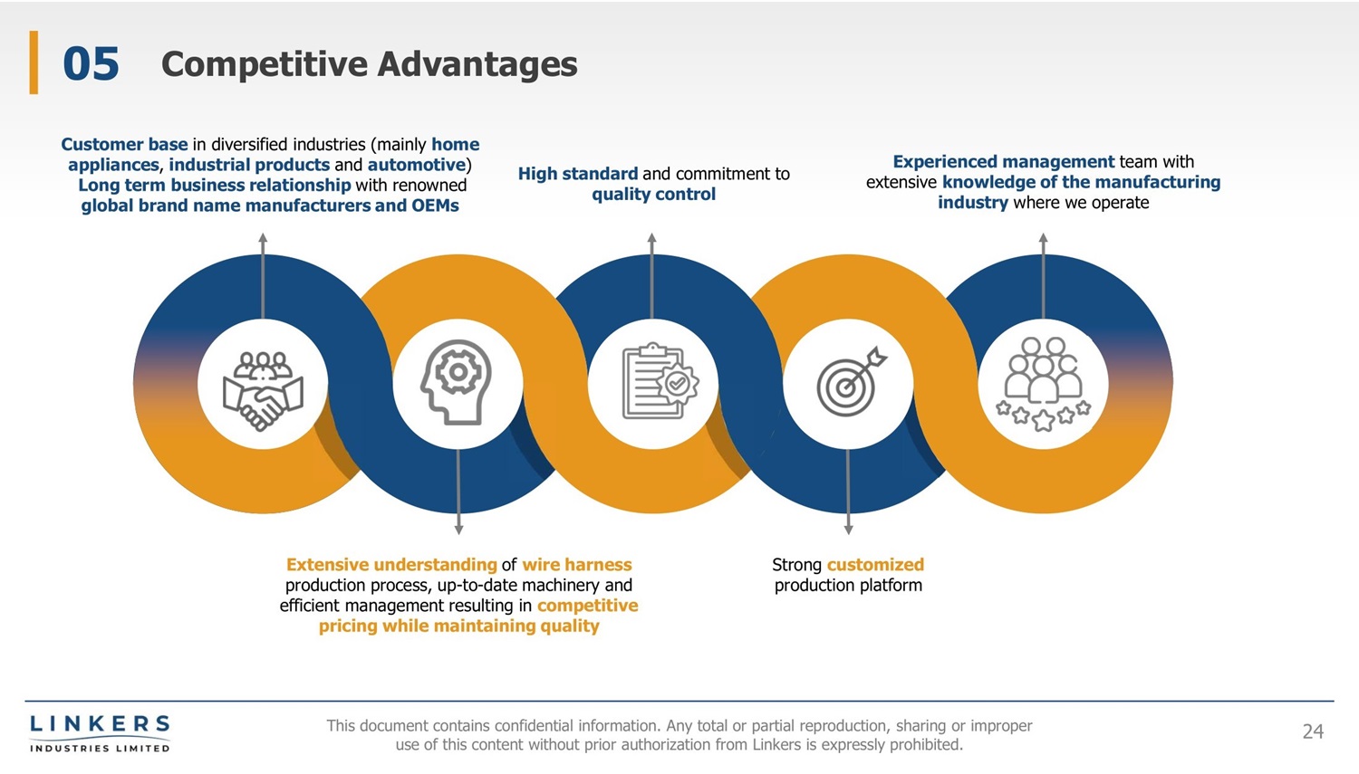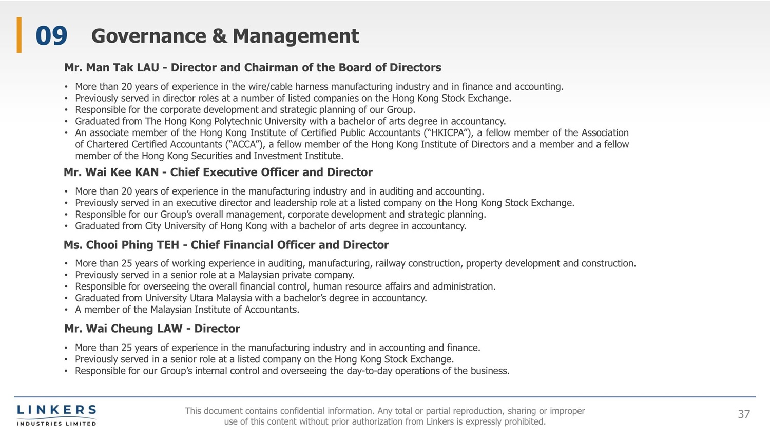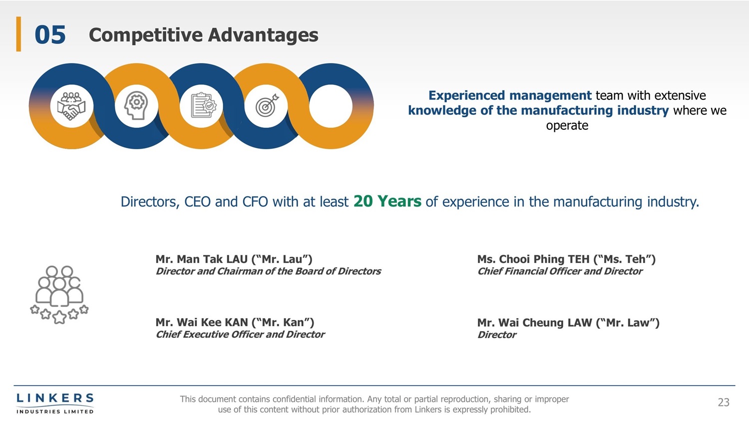 这份文件包含机密信息。未经链接者事先授权,任何全部或部分复制、共享或不当使用本内容的行为,均被明确禁止。05竞争优势23经验丰富的管理团队,对制造行业有广泛的了解,我们在该行业运营董事、首席执行官和首席财务官,在制造行业拥有至少20年的经验。Man Tak LaU先生(“Mr. Lau”)董事兼董事会主席Wai Kee KAN先生(“Mr. Kan”)行政总裁兼董事Chooi Phing TEH女士(“Ms. Teh”)首席财务官及董事Wai Cheung Mr. Law(“Mr. Law”)董事
