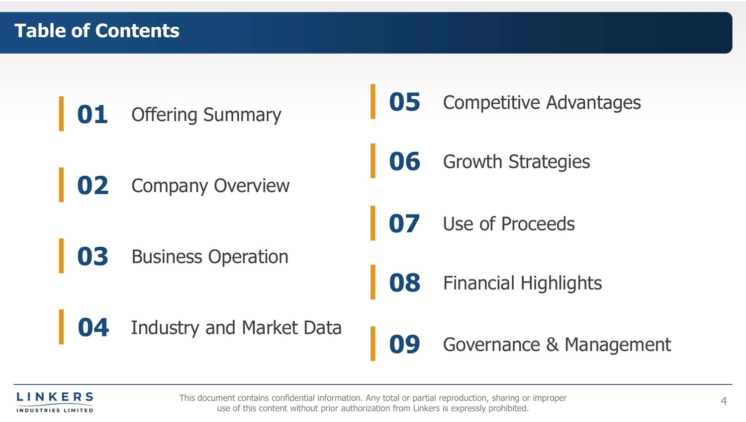 这份文件包含机密信息。未经链接者事先授权,任何全部或部分复制、共享或不当使用本内容的行为,均被明确禁止。自由写作招股说明书声明本自由写作招股说明书涉及拟议的首次公开发行A类普通股(“普通股”),面值为0美元。Linkers Industries Limited(“公司”)的每股00001美元,正在注册声明中注册,应与公司就本演示文稿所涉及的发售向美国证券交易委员会提交的注册声明中包含的初步招股说明书一起阅读,可通过以下网页链接访问:https://www.linkers-hk.com本演示文稿重点介绍了有关公司和本演示文稿所涉及的发售的基本信息。因为它是一个摘要,所以它没有包含您在投资我们的证券之前应该考虑的所有信息。公司已就本通讯所涉及的拟议发行向SEC提交了注册声明(包括初步招股说明书)。注册声明尚未生效。在您投资之前,您应该完整阅读注册声明中的招股说明书(包括其中描述的风险因素)以及我们向SEC提交的其他文件,以获得有关我们和拟议发行的更完整信息。您可以通过访问SEC网站http://www.sec.gov/上的EDGAR免费获得这些文件。或者,如果您联系Revere Securities LLC,地址为560 Lexington Ave,16 th Floor,New York,NY 10022,USA,我们或我们的承销商将安排向您发送注册声明,收件人:Authur DeFilippo,或通过电子邮件联系@ reveresecurities.com或电话+ 1(212)6882238。有关进一步的风险和披露,请参阅发行文件。不能保证会取得任何具体结果。投资可能是投机性的、缺乏流动性的,存在亏损的风险。3