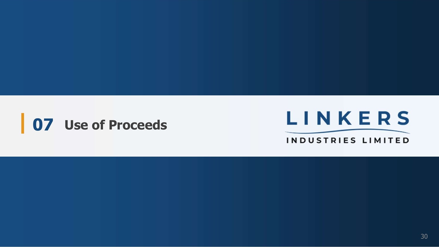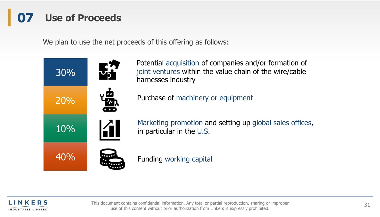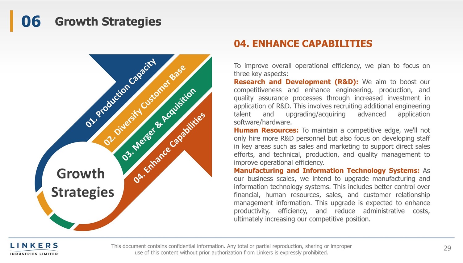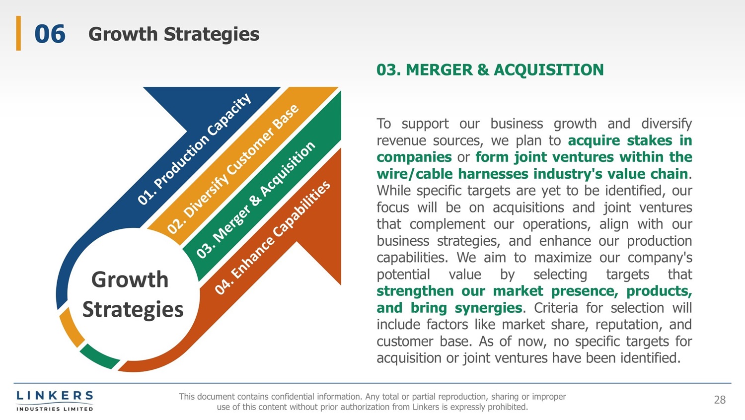 这份文件包含机密信息。未经链接者事先授权,任何全部或部分复制、共享或不当使用本内容的行为,均被明确禁止。为支持我们的业务增长和收入来源多样化,我们计划收购电线/电缆线束行业价值链内公司的股份或组建合资企业。虽然具体目标尚待确定,但我们的重点将是收购和合资,以补充我们的运营,与我们的业务战略保持一致,并增强我们的生产能力。我们的目标是通过选择能够加强我们的市场占有率、产品并带来协同效应的目标,最大限度地发挥我们公司的潜在价值。选择的标准将包括市场份额、声誉和客户基础等因素。截至目前,尚未确定收购或合资的具体目标。03.MERGER & ACQISITION 06增长策略28增长策略