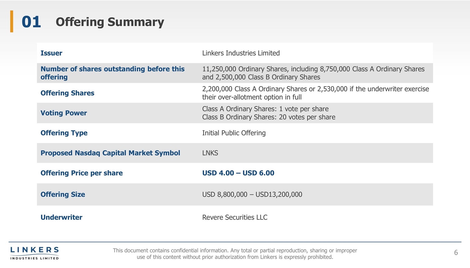 这份文件包含机密信息。未经链接者事先授权,任何全部或部分复制、共享或不当使用本内容的行为,均被明确禁止。01发行摘要Linkers Industries Limited发行人11,250,000股普通股,包括8,750,000股A类普通股和2,500,000股B类普通股本次发行前已发行股份数量2,200,000股A类普通股或2,530,000股,如果承销商在全额发售股份中行使超额配股权A类普通股:每股1票B类普通股:每股20票投票权首次公开发行股票类型LNKS提议的纳斯达克资本市场代码4.00美元– 6.00美元发售价每股8,800,000美元– 13,200,000美元发行规模Revere Securities LLC承销商6