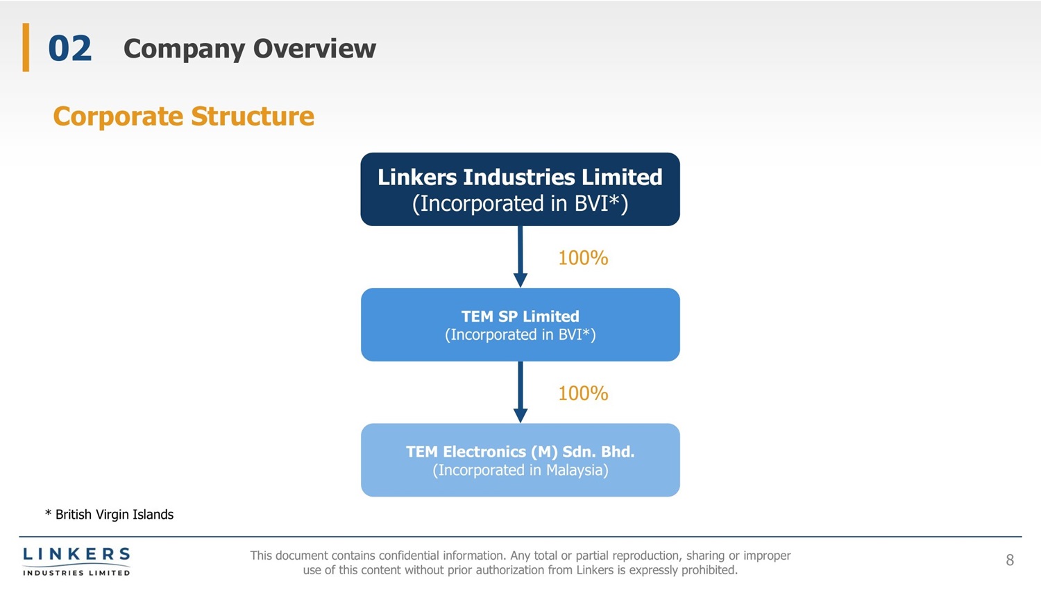 这份文件包含机密信息。未经链接者事先授权,任何全部或部分复制、共享或不当使用本内容的行为,均被明确禁止。02公司概况公司Structure Linkers Industries Limited(Incorporated in BVI *)TEM SP Limited(Incorporated in BVI *)TEM Electronics(M)Sdn。有限公司。(于马来西亚注册成立)100% 100% 8 *英属维尔京群岛