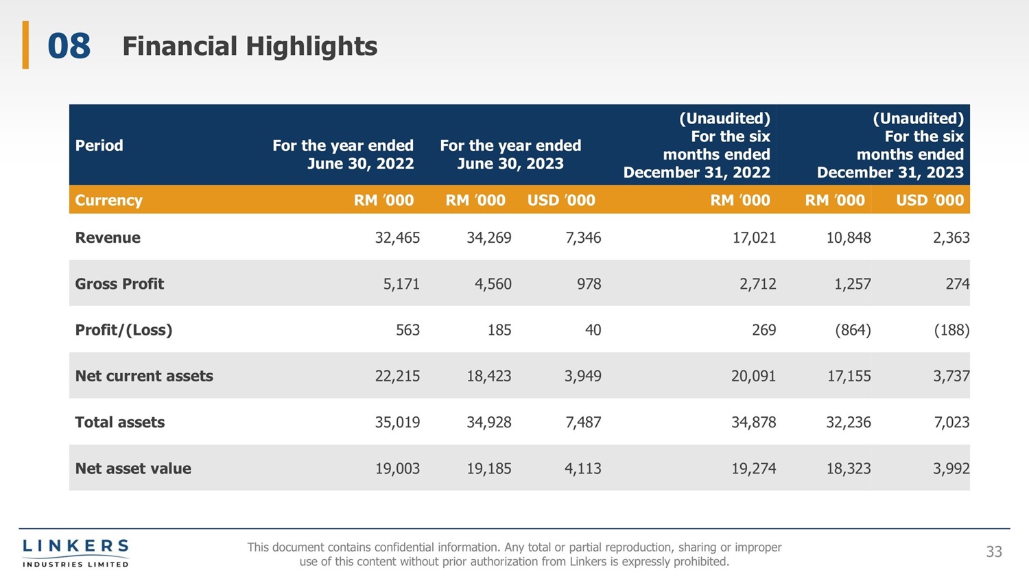 这份文件包含机密信息。未经链接者事先授权,任何全部或部分复制、共享或不当使用本内容的行为,均被明确禁止。08截至2023年12月31日止六个月财务摘要(未经审核)截至2022年12月31日止六个月截至2023年6月30日止年度财务摘要(未经审核),2022期间USD‘000 RM’000 RM‘000 RM’000 RM'000货币2,36310,84817,0217,34634,26932,465收入2741,2572,7129784,5605,171毛利(188)(864)26940185563利润/(亏损)3,73717,15520,0913,94918,42322,215净流动资产7,02332,23634,8787,48734,92835,019总资产3,99218,32319,2744,11319,18519,003资产净值33
