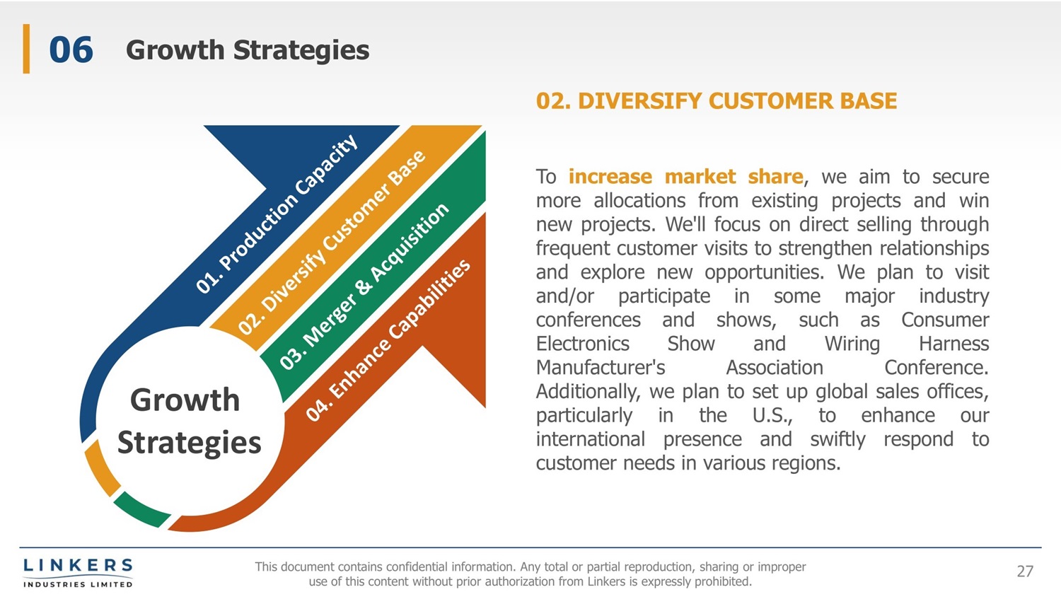 这份文件包含机密信息。未经链接者事先授权,任何全部或部分复制、共享或不当使用本内容的行为,均被明确禁止。为提高市场份额,我们的目标是从现有项目中获得更多分配并赢得新项目。我们将通过频繁的客户拜访来专注于直销,以加强关系并探索新的机会。我们计划参观和/或参加一些重大的行业会议和展会,例如消费电子展和线束制造商协会会议。此外,我们计划设立全球销售办事处,特别是在美国,以增强我们的国际影响力,并迅速响应各地区的客户需求。06增长策略2702。多样化客户基础增长策略
