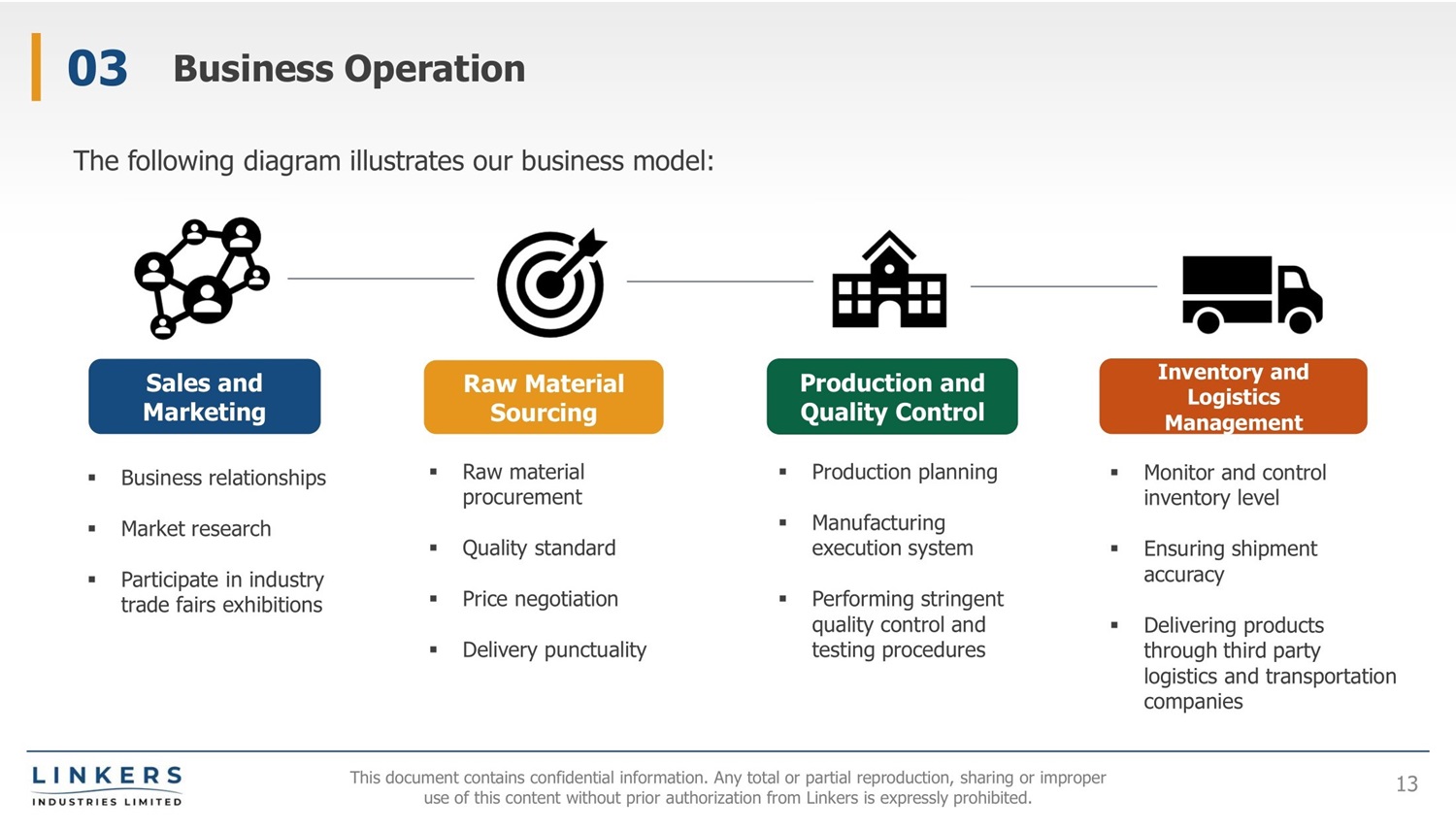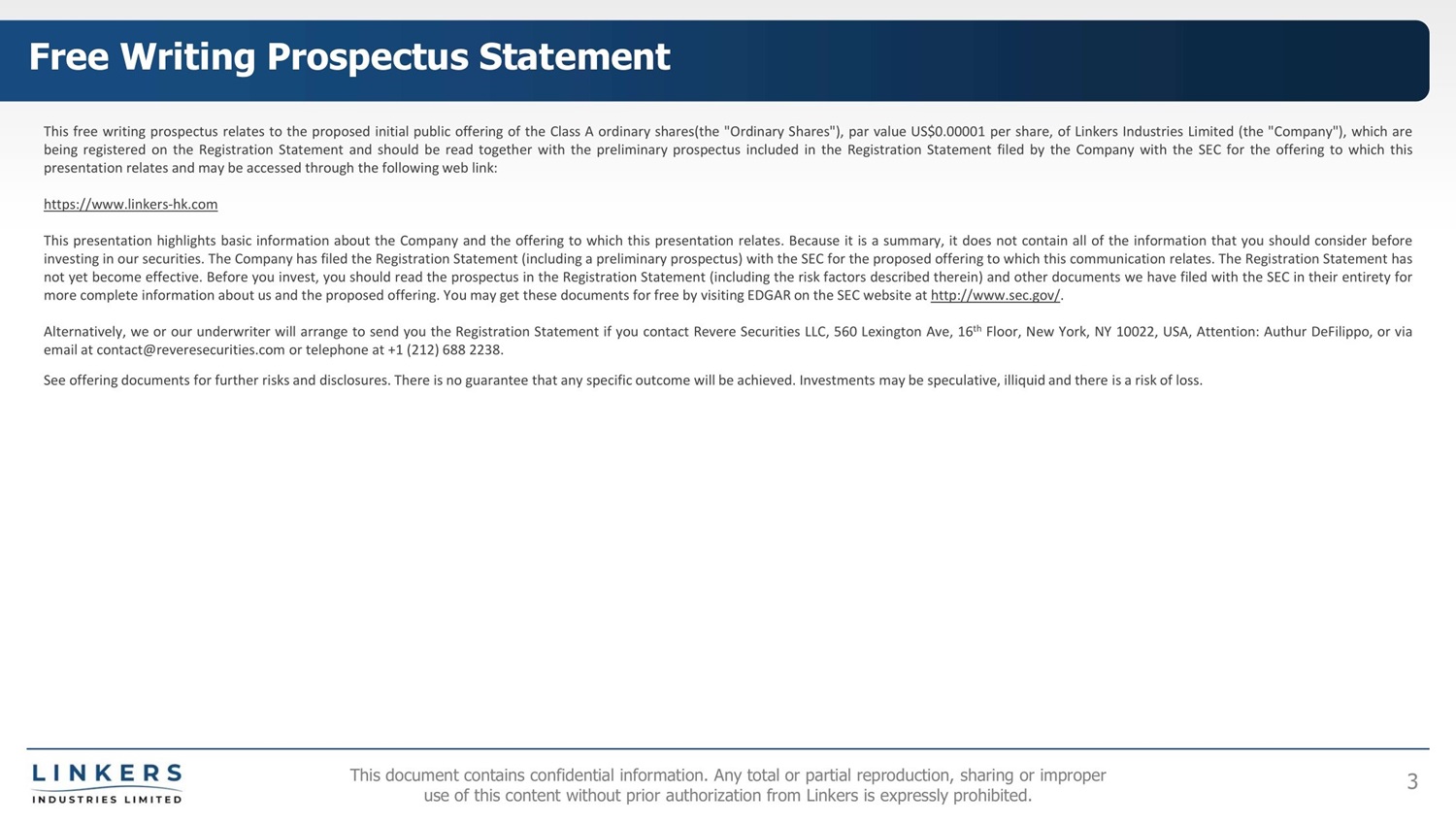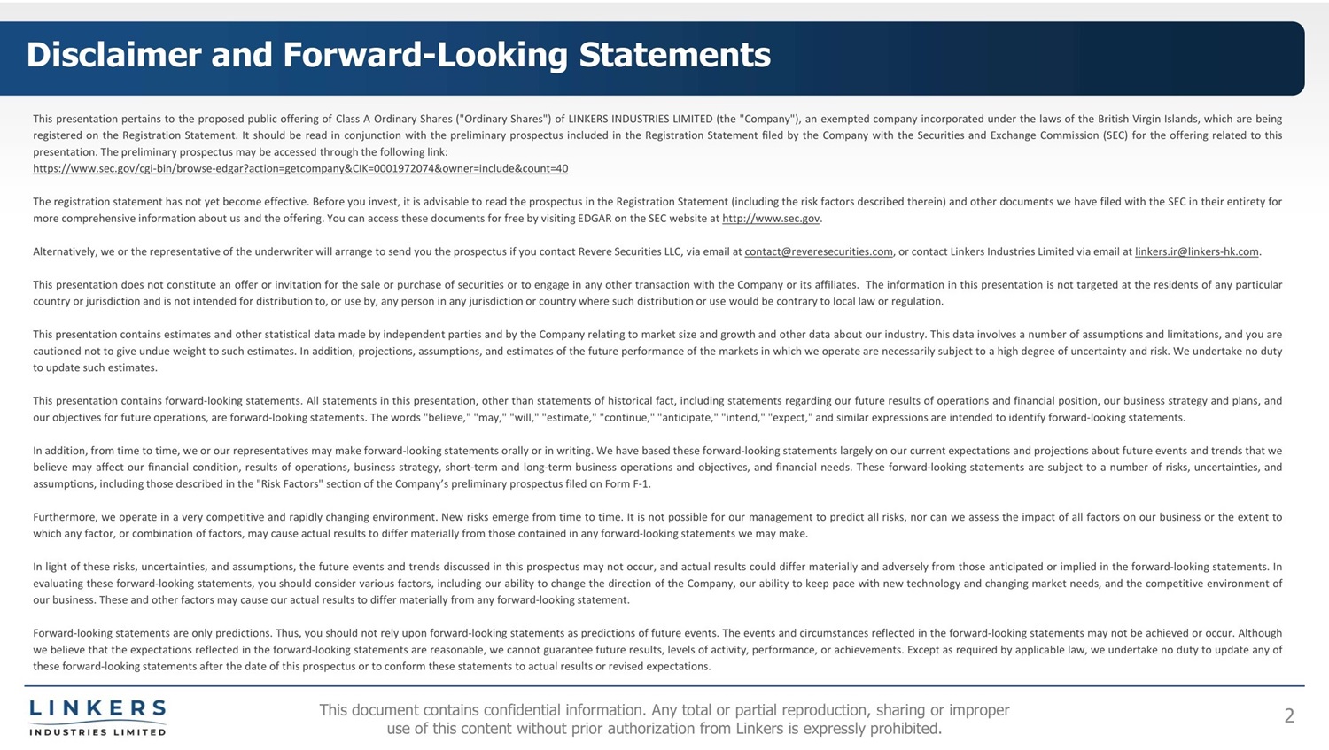 这份文件包含机密信息。未经链接者事先授权,任何全部或部分复制、共享或不当使用本内容的行为,均被明确禁止。免责声明和前瞻性陈述本演示文稿涉及LINKERS INDUSTRIES LIMITED(“公司”)的拟议公开发行A类普通股(“普通股”),该公司是一家根据英属维尔京群岛法律注册成立的豁免公司,正在注册声明上注册。该文件应与公司向美国证券交易委员会(SEC)提交的注册声明中包含的初步招股说明书一起阅读,该注册声明与本次演示文稿相关。初步招股说明书可通过以下链接查阅:https://www.sec.gov/cgi-bin/browse-edgar?action=getcompany&cIK=0001972074&owner=include&count=40注册声明尚未生效。在您投资之前,最好阅读注册声明中的招股说明书(包括其中描述的风险因素)以及我们向SEC提交的其他文件的全文,以获得有关我们和此次发行的更全面的信息。您可以通过访问SEC网站http://www.sec.gov上的EDGAR免费访问这些文件。或者,如果您联系Revere Securities LLC,我们或承销商代表将安排向您发送招股说明书,通过电子邮件联系@ reveresecurities. com,或通过电子邮件联系Linkers Industries Limited,地址为linkers. ir @ linkers-hk. com。本演示不构成出售或购买证券或与公司或其关联公司进行任何其他交易的要约或邀请。本演示文稿中的信息不针对任何特定国家或司法管辖区的居民,也不打算分发给任何司法管辖区或国家的任何人或由其使用,如果此类分发或使用将违反当地法律或法规。本演示文稿包含独立方和公司做出的与市场规模和增长相关的估计和其他统计数据以及有关我们行业的其他数据。这些数据涉及许多假设和限制,请注意不要对这些估计给予不应有的权重。此外,对我们经营所在市场未来表现的预测、假设和估计必然受到高度不确定性和风险的影响。我们不承担更新此类估计的义务。本演示文稿包含前瞻性陈述。本演示文稿中的所有陈述,除历史事实陈述外,包括关于我们未来经营业绩和财务状况、我们的业务战略和计划以及我们未来经营目标的陈述,均为前瞻性陈述。“相信”、“可能”、“将”、“估计”、“继续”、“预期”、“打算”、“预期”和类似表述旨在识别前瞻性陈述。此外,我们或我们的代表可能会不时以口头或书面形式作出前瞻性陈述。我们的这些前瞻性陈述主要基于我们目前对未来事件和趋势的预期和预测,我们认为这些事件和趋势可能会影响我们的财务状况、经营业绩、业务战略、短期和长期业务运营和目标以及财务需求。这些前瞻性陈述受到许多风险、不确定性和假设的影响,包括公司以表格F-1提交的初步招股说明书中“风险因素”部分所述的风险、不确定性和假设。此外,我们在竞争非常激烈且瞬息万变的环境中运营。新的风险不时出现。我们的管理层不可能预测所有风险,我们也无法评估所有因素对我们业务的影响,也无法评估任何因素或因素组合在多大程度上可能导致实际结果与我们可能做出的任何前瞻性陈述中包含的结果存在重大差异。鉴于这些风险、不确定性和假设,本招股说明书中讨论的未来事件和趋势可能不会发生,实际结果可能与前瞻性陈述中的预期或暗示存在重大不利差异。在评估这些前瞻性陈述时,您应该考虑各种因素,包括我们改变公司方向的能力、我们跟上新技术和不断变化的市场需求的能力,以及我们业务的竞争环境。这些因素和其他因素可能导致我们的实际结果与任何前瞻性陈述存在重大差异。前瞻性陈述只是预测。因此, 你不应该依赖前瞻性陈述作为对未来事件的预测。前瞻性陈述中反映的事件和情况可能无法实现或发生。尽管我们认为前瞻性陈述中反映的预期是合理的,但我们无法保证未来的结果、活动水平、业绩或成就。除适用法律要求外,我们不承担在本招股说明书日期之后更新任何这些前瞻性陈述或使这些陈述符合实际结果或经修订的预期的义务。2