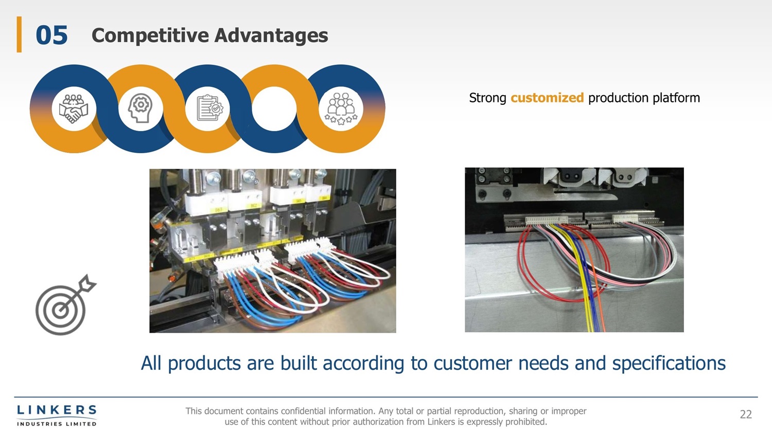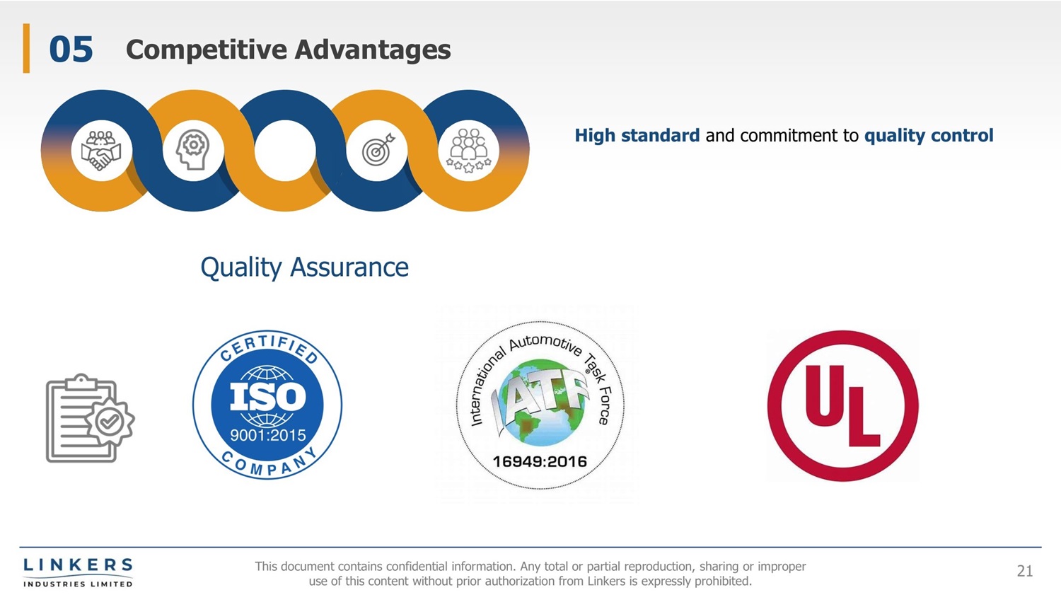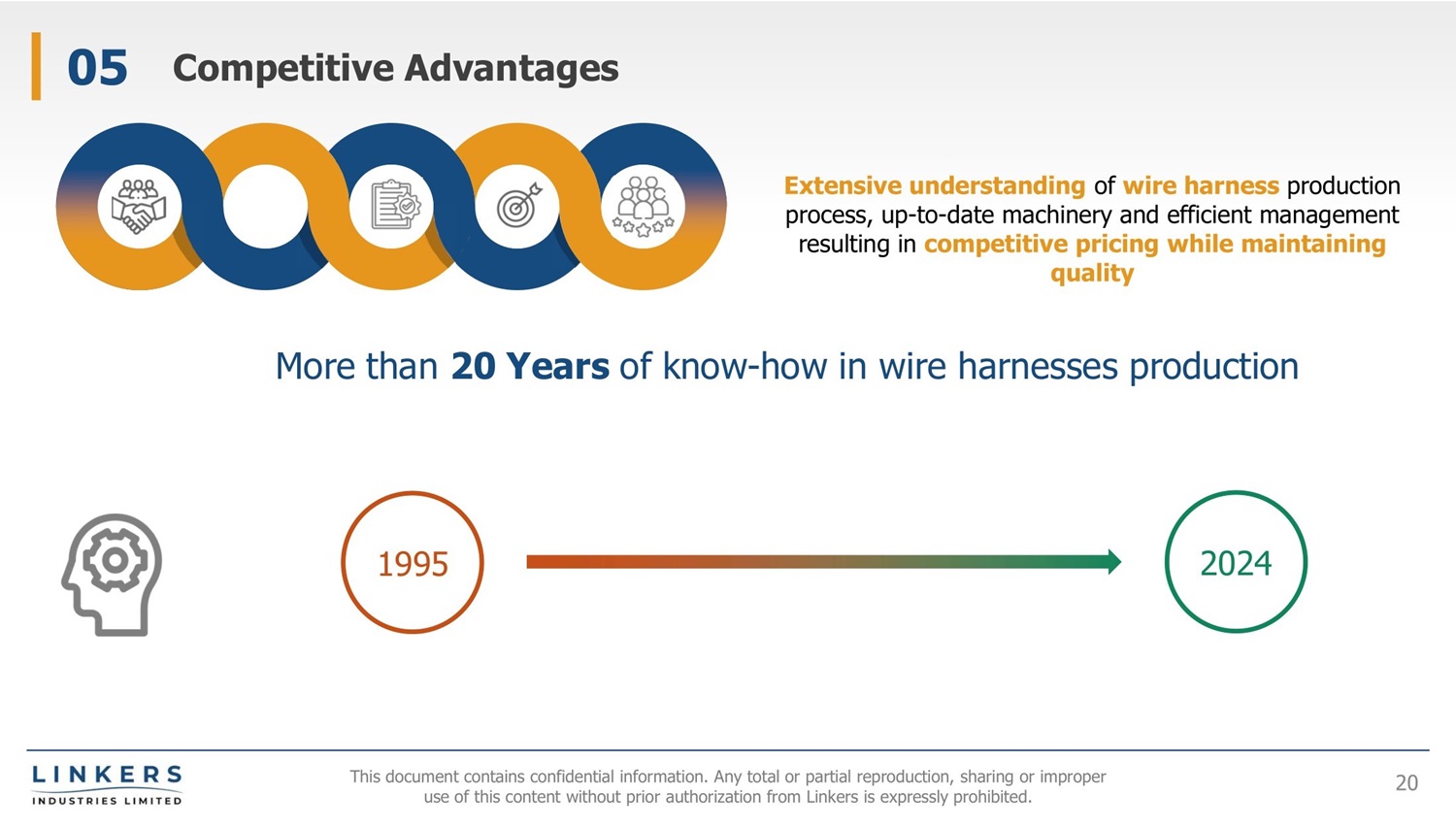 这份文件包含机密信息。未经链接者事先授权,任何全部或部分复制、共享或不当使用本内容的行为,均被明确禁止。05竞争优势20对线束生产工艺的广泛理解、最新的机械和高效的管理,在保持质量的同时带来有竞争力的价格20多年的线束生产诀窍20241995
