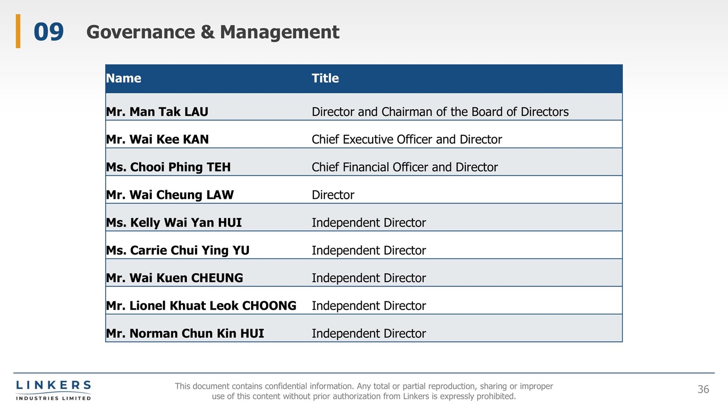 这份文件包含机密信息。未经链接者事先授权,任何全部或部分复制、共享或不当使用本内容的行为,均被明确禁止。09治理与管理36标题名称董事、董事会主席刘文德先生行政总裁兼董事郑伟记先生及首席财务官女士及董事Chooi Phing TEH女士董事郑伟翔先生法律独立董事郑伟荣女士独立董事郑伟坤先生独立董事郑伟坤先生独立董事Lionel Khuat Leok CHOONG先生独立董事郑伟坚先生