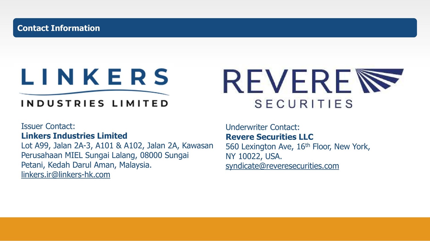 这份文件包含机密信息。未经链接者事先授权,任何全部或部分复制、共享或不当使用本内容的行为,均被明确禁止。发行人联系人:Linkers Industries Limited Lot A99,Jalan 2A-3,A101 & A102,Jalan 2A,Kawasan Perusahaan MIEL Sungai Lalang,08000 Sungai Petani,Kedah Darul Aman,Malaysia. linkers.ir @ linkers-HK承销商联系人:Revere Securities LLC 560 Lexington Ave,16 th Floor,New York,NY 10022,USA. syndicate@reveresecurities.com联系方式