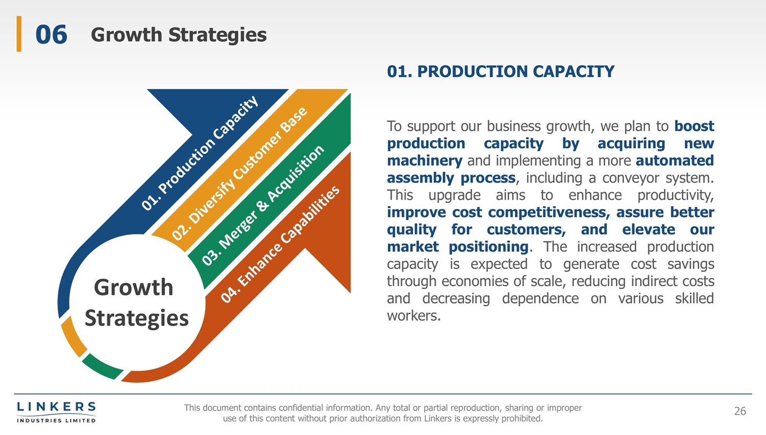 这份文件包含机密信息。未经链接者事先授权,任何全部或部分复制、共享或不当使用本内容的行为,均被明确禁止。06增长策略2601。生产能力为支持我们的业务增长,我们计划通过购置新机器和实施更自动化的装配流程,包括输送系统,来提高产能。此次升级旨在提升生产力,提高成本竞争力,为客户保证更好的质量,提升我们的市场定位。预计增加的产能将通过规模经济产生成本节约,降低间接成本并减少对各种技术工人的依赖。增长策略