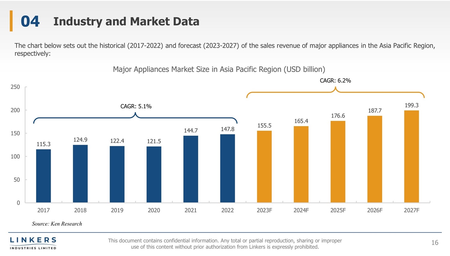 这份文件包含机密信息。未经链接者事先授权,任何全部或部分复制、共享或不当使用本内容的行为,均被明确禁止。04行业与市场数据16115.31 24.91 22.41 21.51 44.71 47.81 55.5 165.41 76.6 187.7 199.30 50100150200250201720182019202020212022 2023F 2024F 2025F 2026F 2027F亚太地区主要家电市场规模(十亿美元)CAGR:5.1% CAGR:6.2%下图分别列出了亚太地区主要家电销售收入的历史(2017-2022)和预测(2023-2027):来源:Ken Research