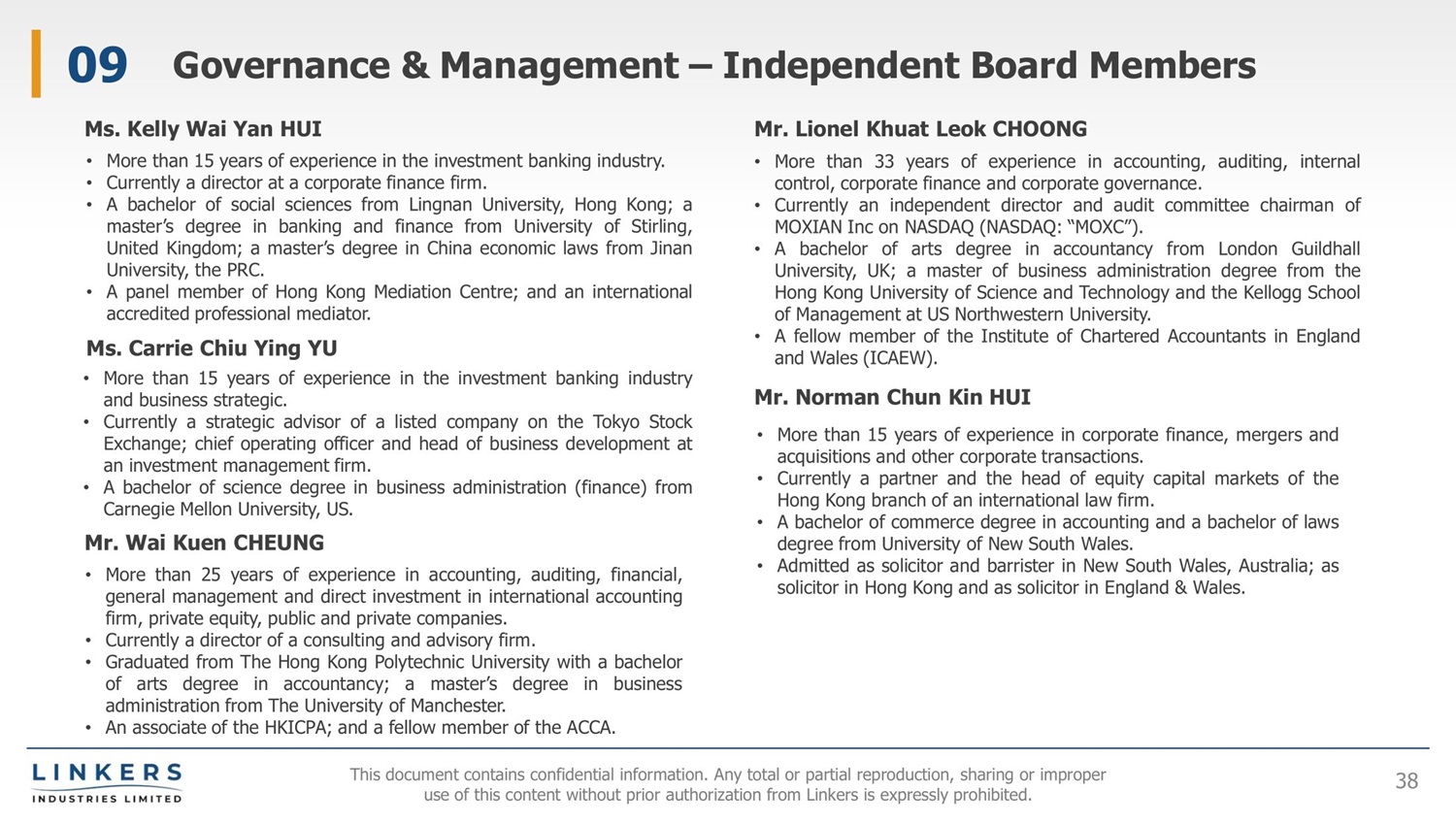 这份文件包含机密信息。未经链接者事先授权,任何全部或部分复制、共享或不当使用本内容的行为,均被明确禁止。09治理与管理37 Man Tak LAU-董事兼董事会主席• M矿石20多年电线/电缆线束制造行业及财务和会计经验。•曾在港交所多家上市公司担任董事职务。•负责本集团的企业发展和战略规划。•毕业于香港理工大学,获会计学文学学士学位。•香港会计师公会(“HKICPA”)准会员、特许公认会计师公会(“ACCA”)资深会员、香港董事学会资深会员及香港证券及投资学会资深会员及资深会员。Mr. Wai Kee KAN-行政总裁兼董事•在制造业及审计和会计领域拥有超过20年的经验。•曾在港交所上市公司担任执行董事和领导职务。• R esponsible为我们集团的整体管理、企业发展和战略规划。•毕业于香港城市大学,获会计学文学学士学位。Chooi Ping TEH女士-首席财务官、董事• 25年以上审计、制造、铁路建设、物业开发建设等工作经验。•此前曾在一家马来西亚私营公司担任高级职务。•负责监督整体财务控制、人力资源事务和行政管理。•毕业于马来西亚Utara大学,获得会计学学士学位。•马来西亚会计师协会成员。Wai Cheung Mr. Law-Director •在制造业及会计和金融领域拥有超过25年的经验。•此前曾在港交所上市公司担任高级职务。• R esponsible为我们集团的内部控制和监督业务的日常运营。