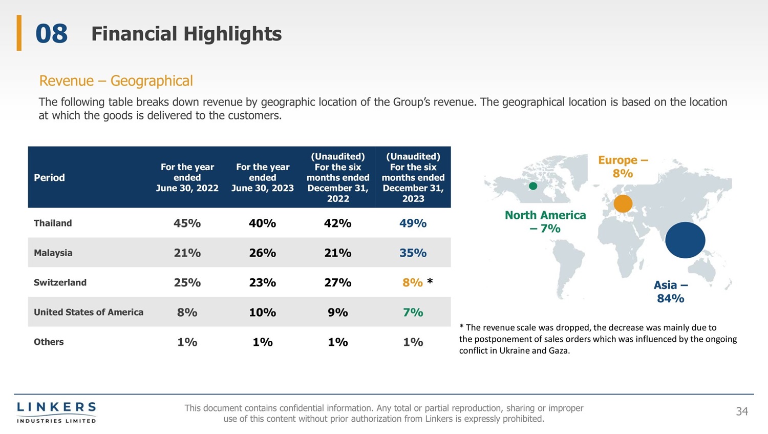 这份文件包含机密信息。未经链接者事先授权,任何全部或部分复制、共享或不当使用本内容的行为,均被明确禁止。08财务摘要收入–地域下表按集团收入的地理位置对收入进行了细分。地理位置以货物交付给客户的地点为准。34(未经审核)截至2023年12月31日止六个月(未经审核)截至2022年12月31日止六个月截至2023年6月30日止年度截至2022年6月30日止期间49% 42% 40% 45%泰国35% 21% 26% 21%马来西亚8% * 27% 23% 25%瑞士7% 9% 10% 8%美国1% 1% 1% 1% 1%其他亚洲– 84%欧洲–8%北美–7% *收入规模下降,减少的主要原因是受乌克兰和加沙持续冲突的影响,销售订单推迟。