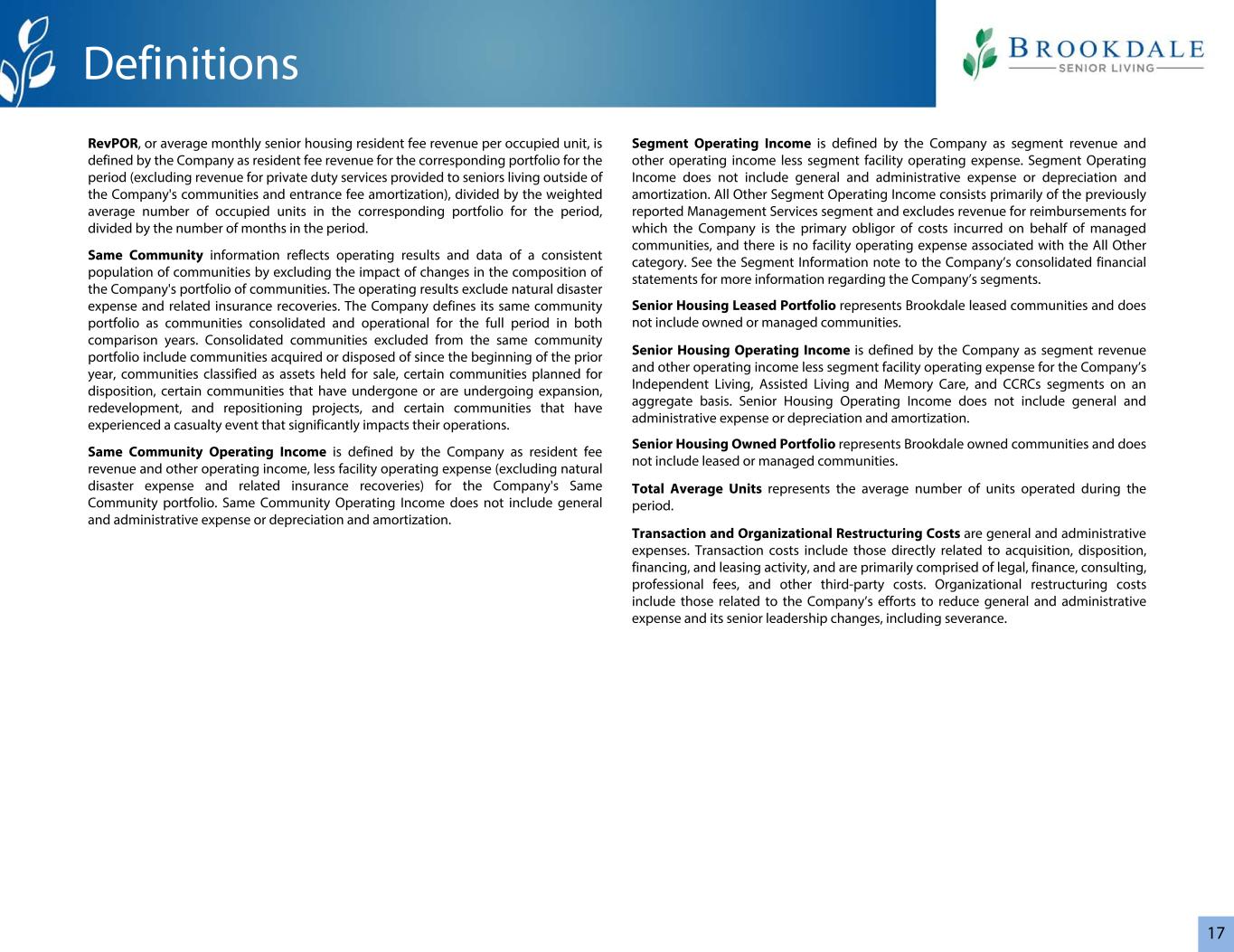 17 RevPOR,即每月平均每被占用单位的老年住房居民费收入,由公司定义为该期间相应组合的居民费收入(不包括向居住在公司社区以外的老年人提供的私人值班服务的收入和入场费摊销),除以该期间相应组合的加权平均被占用单位数,再除以该期间的月数。相同的社区信息通过排除公司的社区组合构成变化的影响,反映了一致的社区人口的运营结果和数据。经营业绩不含自然灾害费用及相关保险追偿。该公司将其相同的社区投资组合定义为在两个比较年份的整个期间合并和运营的社区。同一社区组合中排除的合并社区包括自上一年年初以来获得或处置的社区、归类为持有待售资产的社区、计划处置的某些社区、已经或正在进行扩建、重建和重新定位项目的某些社区,以及经历了对其运营产生重大影响的伤亡事件的某些社区。同一社区运营收入由公司定义为居民费用收入和其他运营收入,减去公司同一社区投资组合的设施运营费用(不包括自然灾害费用和相关保险赔偿)。同一社区运营收入不包括一般和管理费用或折旧和摊销。分部营业收入由公司定义为分部收入和其他营业收入减去分部设施营业费用。分部营业收入不包括一般和管理费用或折旧和摊销。所有其他分部营业收入主要包括先前报告的管理服务分部,不包括公司作为主要承付方的代管社区发生的成本的报销收入,并且没有与所有其他类别相关的设施运营费用。有关公司分部的更多信息,请参阅公司合并财务报表的分部信息附注。Senior Housing Leased Portfolio代表Brookdale租赁社区,不包括自有或管理的社区。老年住宅运营收入是公司定义为公司独立生活、辅助生活医疗和记忆护理以及CCRCs分部的分部收入和其他运营收入减去分部设施运营费用后的汇总口径。高级住宅运营收入不包括一般和管理费用或折旧和摊销。Senior Housing Owned Portfolio代表Brookdale拥有的社区,不包括租赁或管理的社区。总平均单位数表示该期间运营的平均单位数。交易和组织重组成本是一般和管理费用。交易费用包括与购置、处置、融资和租赁活动直接相关的费用,主要由法律、财务、咨询、专业费用和其他第三方费用组成。组织重组成本包括与公司努力减少一般和行政费用以及包括遣散费在内的高级领导层变动有关的成本。定义