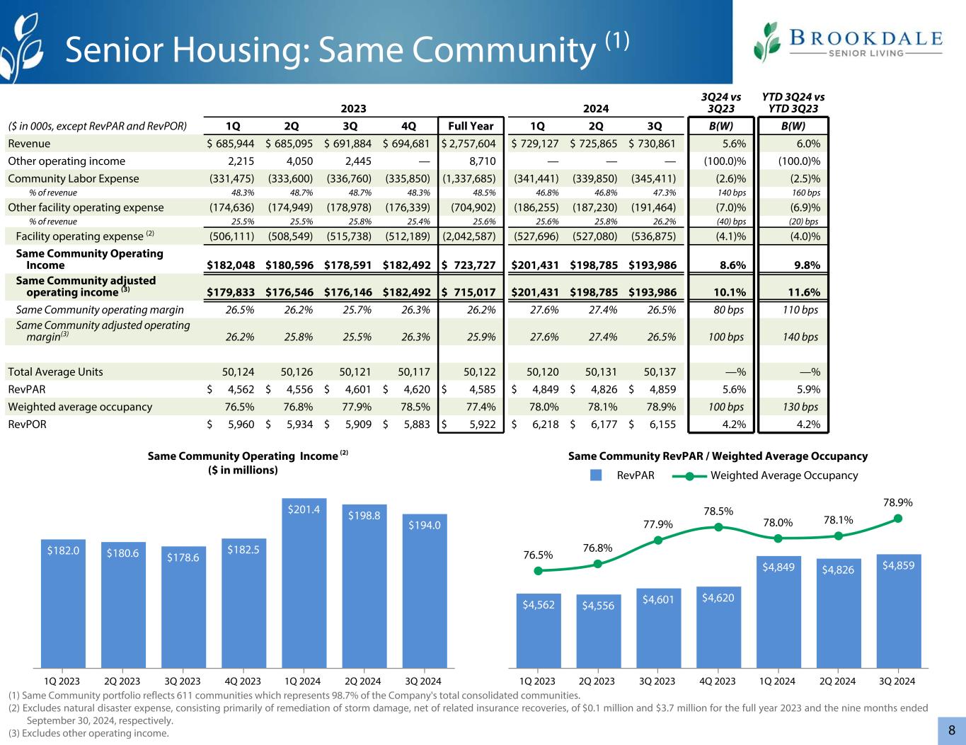 820232024 3Q24 vs 3Q23 YTD 3Q24 vs YTD 3Q23($ in 000s,RevPAR除外和RevPOR)1Q 2Q 3Q 4Q全年1Q 2Q Q3 B(W)B(W)收入$ 685,944 $ 685,095 $ 691,884 $ 694,681 $ 2,757,604 $ 729,127 $ 725,865 $ 730,8615.6% 6.0%其他营业收入2,2154,0502,445 — 8,710 ————(100.0)%(100.0)%社区人工费用(331,475)(333,600)(336,760)(335,850)(1,337,685)(341,441)(339,850)(345,411)(2.6)%(2.5)%%收入48.3% 48.7% 48.3% 48.5% 46.8% 46.8% 47.3% 140个基点160个基点%(6.9)%%收入25.5% 25.5% 25.8% 25.4% 25.6% 25.6% 25.8% 26.2%(40)bps(20)bps设施运营费用(2)(506,111)(508,549)(515,738)(512,189)(2,042,587)(527,696)(527,080)(536,875)(4.1)%(4.0)% Same Community Operating Income $ 182,048 $ 180,596 $ 178,591 $ 182,492 $ 723,727 $ 201,431 $ 198,785 $ 193,9868.6% 9.8% Same Community Adjusted Operating Income(3)$ 179,833 $ 176,546 $ 176,146 $ 182,492 $ 715% 25.7% 26.3% 26.2% 27.6% 27.4% 26.5% 80个基点110个基点同社区调整后营业利润率(3)26.2% 25.8% 25.5% 26.3% 25.9% 27.6% 27.4% 26.5% 100个基点140个基点平均单位总数50,12450,12650,12150,11750,12250,12050,13150,137 —% —% RevPAR $ 4,562 $ 4,556 $ 4,601 $ 4,620 $ 4,585 $ 4,849 $ 4,826 $ 4,8595.6% 5.9%加权平均入住率76.5% 76.8% 77.9% 78.5% 77.4% 78.0% 78.1% 78.9% 100个基点130个基点RevPOR $ 5,960 $ 5,934 $ 5,909 $ 5,883 $ 5,922 $ 6,218 $ 6,177 $ 6,1554.2% 4.2%同社区营业收入(百万美元)$ 182.0 $ 180.6 $ 178.6 $ 18 2.5 $ 201.4 $ 198.8 $ 194.0 1Q20232Q2023Q3 Q3 2023Q4 20231Q20242Q20243Q2024同社区RevPAR/加权平均入住率$ 4,562 $ 4,556 $ 4,601 $ 4,620 $ 4,849 $ 4,826 $ 4,85976.5% 76.8% 77.9% 78.5% 78.0% 78.1% 78.9% RevPAR加权平均入住率1Q20232Q20232Q20233Q20234Q20242Q20243Q2024老年反映611个社区,占公司合并社区总数的98.7%。(2)不包括自然灾害费用,主要包括2023年全年和截至2024年9月30日止九个月的风暴损害补救措施,扣除相关保险赔偿,分别为10万美元和370万美元。(3)不包括其他经营收入。(2)