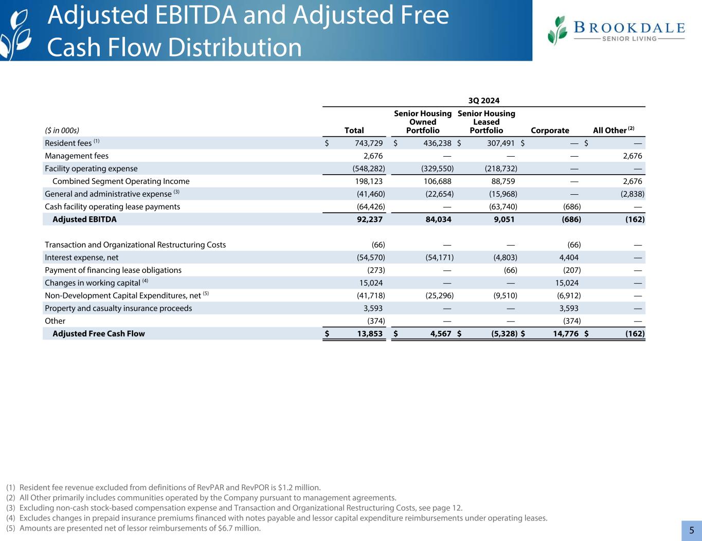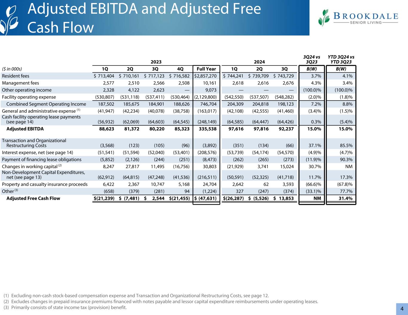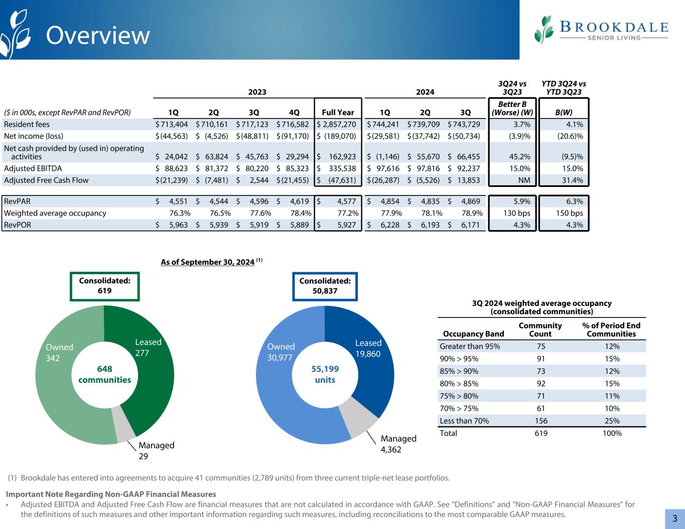 3管理4,362个拥有30,977个租赁19,860个管理29个拥有342个租赁277648个社区55,199个单位(1)Brookdale已签订协议,从三个当前的三重净租赁组合中收购41个社区(2,789个单位)。关于非GAAP财务指标的重要说明•调整后EBITDA和调整后自由现金流是不按照GAAP计算的财务指标。有关此类措施的定义以及有关此类措施的其他重要信息,包括与最具可比性的GAAP措施的对账,请参见“定义”和“非GAAP财务措施”。20232024 3Q24 vs 3Q23 YTD 3Q24 vs YTD 3Q23($ in 000s,RevPAR除外和RevPOR)1Q 2Q 3Q 4Q全年1Q 2Q 3Q Better B(Worse)(W)B(W)居民费用$ 713,404 $ 710,161 $ 717,123 $ 716,582 $ 2,857,270 $ 744,241 $ 739,709 $ 743,729 $ 2,227,6793.7% 4.1%净收益(亏损)$(44,563)$(4,526)$(48,811)$(91,170)$(189,070)$(29,581)$(37,742)$(50,734)(3.9)%(20.6)%经营活动提供的现金净额$ 24,042 $ 63,824 $ 45,763 $ 29,294 $ 162,923 $(1,85,323 $ 335,538 $ 97,616 $ 97,816 $ 92,23715.0% 15.0%调整后自由现金流$(21,239)$(7,481)$ 2,544 $(21,455)$(47,631)$(26,287)$(5,526)$ 13,853 NM 31.4% RevPAR $ 4,551 $ 4,544 $ 4,596 $ 4,619 $ 4,577 $ 4,854 $ 4,835 $ 4,8695.9% 6.3%加权平均入住率76.3% 76.5% 77.6% 78.4% 77.2% 77.9% 78.1% 78.9% 130个基点150个基点RevPOR $ 5,963 $ 5,939 $ 5,919 $ 5,889 $ 5,927 $ 6,228 $ 6,193小区)占用带小区计数%期末小区大于95% 7512% 90% > 95% 9115% 85% > 90% 7312% 80% > 85% 9215% 75% > 80% 7111% 70% > 75% 61 10%小于70% 15625%合计619100%截至2024年9月30日概览(1)合并:50,837合并:619