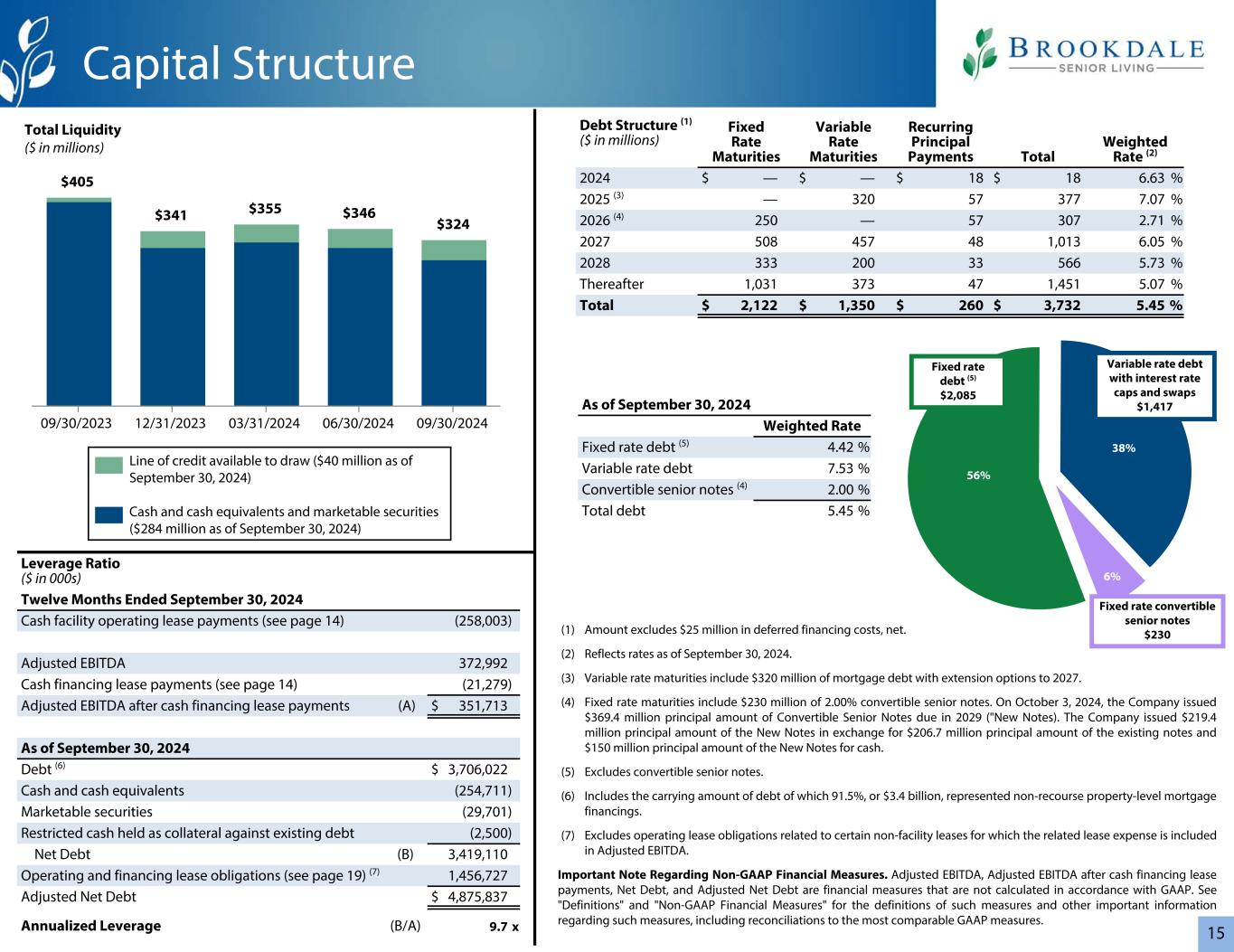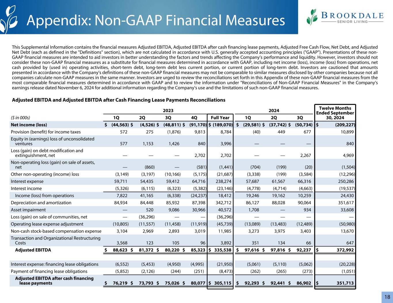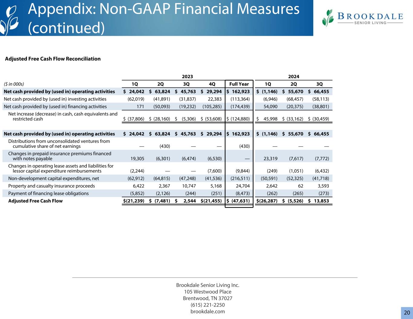 3管理4,362个拥有30,977个租赁19,860个管理29个拥有342个租赁277648个社区55,199个单位(1)Brookdale已签订协议,从三个当前的三重净租赁组合中收购41个社区(2,789个单位)。关于非GAAP财务指标的重要说明•调整后EBITDA和调整后自由现金流是不按照GAAP计算的财务指标。有关此类措施的定义以及有关此类措施的其他重要信息,包括与最具可比性的GAAP措施的对账,请参见“定义”和“非GAAP财务措施”。20232024 3Q24 vs 3Q23 YTD 3Q24 vs YTD 3Q23($ in 000s,RevPAR除外和RevPOR)1Q 2Q 3Q 4Q全年1Q 2Q 3Q Better B(Worse)(W)B(W)居民费用$ 713,404 $ 710,161 $ 717,123 $ 716,582 $ 2,857,270 $ 744,241 $ 739,709 $ 743,729 $ 2,227,6793.7% 4.1%净收益(亏损)$(44,563)$(4,526)$(48,811)$(91,170)$(189,070)$(29,581)$(37,742)$(50,734)(3.9)%(20.6)%经营活动提供的现金净额$ 24,042 $ 63,824 $ 45,763 $ 29,294 $ 162,923 $(1,85,323 $ 335,538 $ 97,616 $ 97,816 $ 92,23715.0% 15.0%调整后自由现金流$(21,239)$(7,481)$ 2,544 $(21,455)$(47,631)$(26,287)$(5,526)$ 13,853 NM 31.4% RevPAR $ 4,551 $ 4,544 $ 4,596 $ 4,619 $ 4,577 $ 4,854 $ 4,835 $ 4,8695.9% 6.3%加权平均入住率76.3% 76.5% 77.6% 78.4% 77.2% 77.9% 78.1% 78.9% 130个基点150个基点RevPOR $ 5,963 $ 5,939 $ 5,919 $ 5,889 $ 5,927 $ 6,228 $ 6,193小区)占用带小区计数%期末小区大于95% 7512% 90% > 95% 9115% 85% > 90% 7312% 80% > 85% 9215% 75% > 80% 7111% 70% > 75% 61 10%小于70% 15625%合计619100%截至2024年9月30日概览(1)合并:50,837合并:619