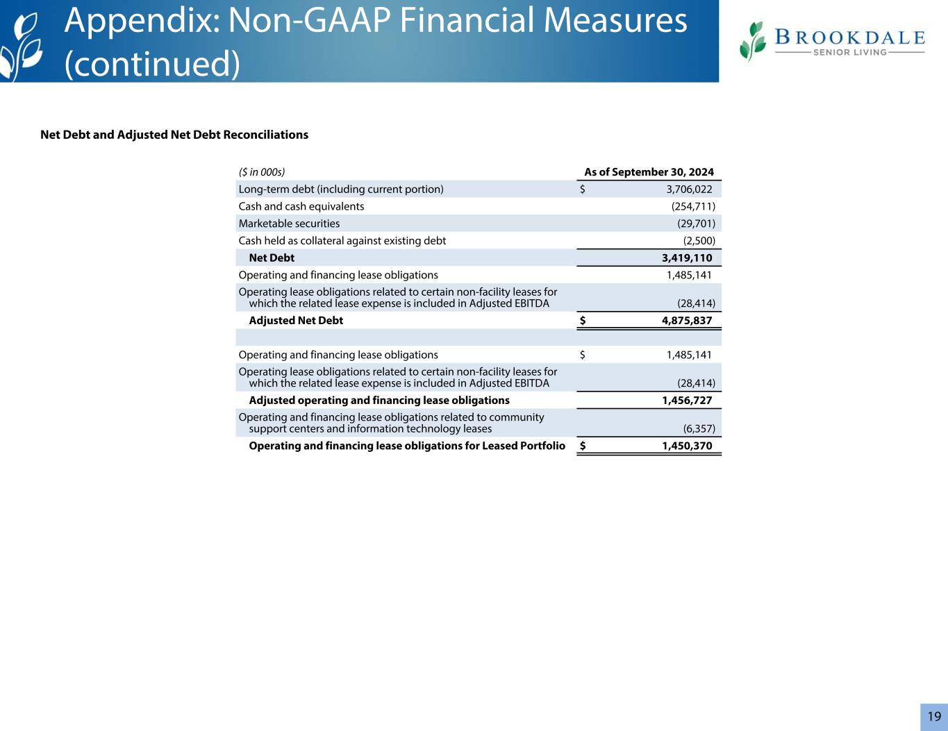 16调整后EBITDA是一种非GAAP业绩衡量标准,公司将其定义为净收入(亏损),不包括:福利/所得税拨备、营业外收入/费用项目以及折旧和摊销;并进一步调整以排除与非现金、非运营、交易、成本削减或组织重组项目相关的收入/费用,管理层不认为这些项目是公司基本核心经营业绩的一部分,并且管理层认为这些项目会影响不同时期业绩的可比性。对于此处列出的期间,这些其他项目包括非现金减值费用、经营租赁费用调整、非现金股票补偿费用、出售社区的收益/损失以及交易和组织重组成本。调整后的自由现金流是一种非公认会计准则流动性衡量指标,公司将其定义为之前由(用于)经营活动提供的净现金:来自未合并企业的累计净收益份额的分配、由应付票据融资的预付保险费的变化、租赁终止的经营租赁资产和负债的变化、设施经营租赁终止的损益支付/收到的现金,以及经营租赁下的出租人资本支出补偿;加:财产和意外伤害保险收益和可退还入场费的收益,扣除退款;减:非开发资本支出和融资租赁义务的支付。调整后净债务是一种非公认会计准则财务指标,公司将其定义为净债务,加上经营和融资租赁义务。经营和融资租赁义务不包括与某些非设施租赁相关的经营租赁义务,相关租赁费用已计入调整后EBITDA。合并分部营业收入由公司定义为居民费用和管理费收入以及公司的其他营业收入,减去设施运营费用。合并分部营业收入不包括一般和管理费用或折旧和摊销。社区劳务费是设施运营费用的组成部分,包括正常和加班工资和工资、奖金、带薪休假和假期工资、工资税、合同工、员工福利和工人补偿。开发资本支出是指用于社区扩建、重大社区重建和重新定位项目以及开发新社区的资本支出。开发资本支出的金额列报为扣除出租人偿还的净额。利息覆盖率是根据过去12个月的自有投资组合营业收入调整后隐含的5%管理费和资本支出350美元/单位,除以过去12个月的财产水平和公司债务利息支出计算得出的。租赁覆盖率的计算依据是过去12个月的租赁组合运营收入,不包括居民费用收入、其他运营收入和在该期间处置的社区的设施运营费用,调整后隐含的5%管理费和资本支出为350美元/个,除以过去12个月的经营租赁和融资租赁的现金设施租赁付款,不包括在该期间处置的社区、社区支持中心、信息技术系统和设备、车辆和其他设备的租赁的现金租赁付款。租赁组合运营收入由公司定义为居民费用收入和其他运营收入,减去公司老年住房租赁组合的设施运营费用。租赁投资组合营业收入不包括一般和管理费用或折旧和摊销。净债务是一种非公认会计准则财务指标,公司将其定义为债务总额和信用额度上的未偿余额,减去非限制性现金、有价证券以及作为现有债务抵押品持有的现金。NM的意思是没有意义。非开发性资本支出由企业和社区层面的资本支出组成,包括与公司社区的维护、翻新、升级和其他主要建筑基础设施项目相关的资本支出。非开发性资本支出不包括用于社区扩建、重大社区重建和重新定位项目以及开发新社区的资本支出(即开发性资本支出)。非开发性资本支出的金额列报为扣除出租人偿还的净额。自有投资组合营业收入由公司定义为居民手续费收入和其他营业收入, 减去公司老年住房自有投资组合的设施运营费用。自有投资组合营业收入不包括一般和管理费用或折旧和摊销。RevPAR,或平均每月每可用单位的老年住房居民费用收入,由公司定义为该期间相应组合的居民费用收入(不包括向居住在公司社区之外的老年人提供的私人服务收入和入场费摊销),除以该期间相应组合的加权平均可用单位数,再除以该期间的月数。定义