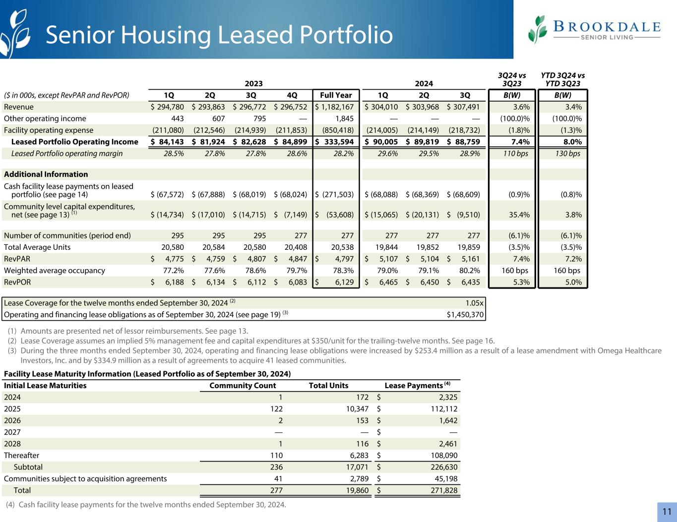 1120232024 3Q24 vs 3Q23 YTD 3Q24 vs YTD 3Q23($ in 000s,RevPAR除外和RevPOR)1Q 2Q 3Q 4Q全年1Q 2Q Q3 B(W)B(W)收入$ 294,780 $ 293,863 $ 296,772 $ 296,752 $ 1,182,167 $ 304,010 $ 303,968 $ 307,4913.6% 3.4%其他营业收入443607795 — 1,845 ————(100.0)%(100.0)%设施营业费用(211,080)(212,546)(214,939)(211,853)(850,418)(214,005)(214,149)(218,732)(1.8)%(1.3)%租赁投资组合营业收入$ 84,143 $ 81,924 $ 82,628 $ 84,899 $ 333,594 $ 90,005 $ 89,819 $ 8828.2% 29.6% 29.5% 28.9% 110bps 130bps额外信息租赁组合的现金融资租赁付款(见第14页)$(67,572)$(67,888)$(68,019)$(68,024)$(271,503)$(68,088)$(68,369)$(68,609)(0.9)%(0.8)%社区一级资本支出,净额(见第13页)(1)$(14,734)$(17,010)$(14,715)$(7,149)$(53,608)$(15,065)$(20,131)$(9,510)35.4% 3.8%社区数量(期末)295295295277277277277277277277(6.1)%(6.1)%平均单位总数20,58020,58420,58020,40820,53819,84419,85219,859(3.5)%(3.5)% RevPAR $ 4,775 $ 4,759 $ 4,807 $ 4,847 $ 4,797 $ 5,107 $ 5,104 $ 5,1617.4% 7.2%加权平均入住率77.2% 77.6% 78.6%bps RevPOR 6,188美元6,134美元6,112美元6,083美元6,129美元6,465美元6,450美元6,4355.3% 5.0%截至2024年9月30日止十二个月的租赁覆盖率(2)1.05x截至2024年9月30日的经营和融资租赁债务(见第19页)(3)1,450,370美元的设施租赁到期信息(截至9月30日的租赁组合,2024)初始租赁到期社区计数总单位租赁付款(4)20241172 $ 2,325202512210,347 $ 112,11220262153 $ 1,6422027 —— $ — 20281116 $ 2,461此后1106,283 $ 108,090小计23617,071 $ 226,630受购置协议约束的社区412,789 $ 45,198总计27719,860 $ 271,828高级住房租赁组合(1)金额列报为扣除出租人补偿后的净额。见第13页。(2)租赁覆盖假设未来12个月隐含5%的管理费和资本支出为350美元/单位。见第16页。(3)在截至2024年9月30日的三个月中,由于与Omega Healthcare Investors,Inc.修订了租约,经营和融资租赁债务增加了2.534亿美元,由于达成收购41个租赁社区的协议,增加了3.349亿美元。(4)截至2024年9月30日止十二个月的现金融资租赁付款。