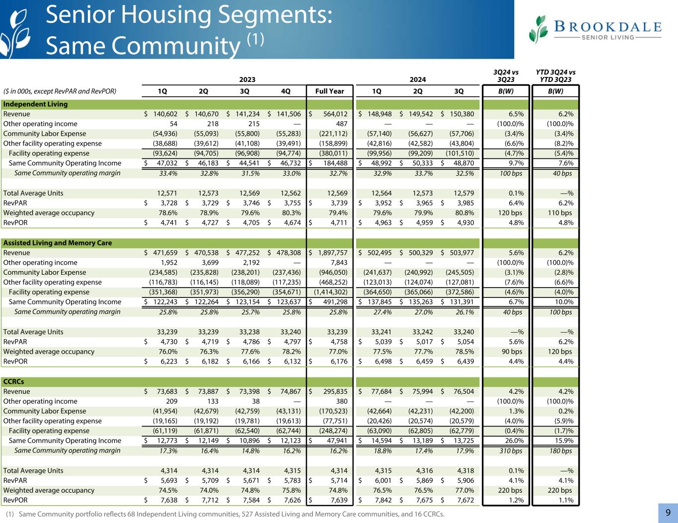 920232024 3Q24 vs 3Q23 YTD 3Q24 vs YTD 3Q23($ in 000s,RevPAR除外和RevPOR)1Q 2Q 3Q 4Q全年1Q 2Q Q3 B(W)B(W)独立生活收入$ 140,602 $ 140,670 $ 141,234 $ 141,506 $ 564,012 $ 148,948 $ 149,542 $ 150,3806.5% 6.2%其他营业收入54218215 — 487 ————(100.0)%(100.0)%社区劳务费(54,936)(55,093)(55,800)(55,283)(221,112)(57,140)(56,627)(57,706)(3.4)%(3.4)%其他设施运营费用(38,688)(39,612)(41,108)(39,491)(158,899)(42,816)(42,582)(43,收入$ 47,032 $ 46,183 $ 44,541 $ 46,732 $ 184,488 $ 48,992 $ 50,333 $ 48,8709.7% 7.6% Same Community Operating Margin 33.4% 32.8% 31.5% 33.0% 32.7% 32.9% 33.7% 32.5% 100 bps 40 bps平均单位总数12,57112,57312,56912,56212,56912,56412,57312,5790.1% — % RevPAR $ 3,728 $ 3,729 $ 3,746 $ 3,755 $ 3,739 $ 3,952 $ 3,965 $ 3,9856.4% 6.2%加权平均入住率78.6% 78.9% 79.6% 80.3% 79.4% 79.6% 79.9% 80.8% 120bps 110bps RevPOR $ 4,741 $ 4,727 $ 4,705 $ 4,674 $ 4,711 $ 4,963 $ 4,959 $ 4,9304.8% 辅助生活医疗和记忆护理收入$ 471,659 $ 470,538 $ 477,252 $ 478,308 $ 1,897,757 $ 502,495 $ 500,329 $ 503,9775.6% 6.2%其他营业收入1,9523,6992,192 — 7,843 ————(100.0)%(100.0)%社区人工费用(234,585)(235,828)(238,201)(237,436)(946,050)(241,637)(240,992)(245,505)(3.1)%(2.8)%其他设施运营费用(116,783)(116,145)(118,089)(117,235)(468,252)(123,013)(124,074)(127,081)(7.6)137,845 $ 135,263 $ 131,3916.7% 10.0% Same Community Operating Margin 25.8% 25.8% 25.7% 25.8% 25.8% 27.4% 27.0% 26.1% 40 bps 100 bps平均单位总数33,23933,23933,23833,24033,23933,24133,240 — %—% RevPAR $ 4,730 $ 4,719 $ 4,786 $ 4,797 $ 4,758 $ 5,039 $ 5,017 $ 5,0545.6% 6.2%加权平均入住率76.0% 76.3% 77.6% 78.2% 77.0% 77.5% 77.7% 78.5% 90 bps 120 bps RevPOR $ 6,223 $ 6,182 $ 6,166$ 6,132 $ 6,176 $ 6,498 $ 6,459 $ 6,4394.4% 4.4% CCRCs收入$ 73,683 $ 73,887 $ 73,398 $ 74,867 $ 295,835 $ 77,684 $ 75,994 $ 76,5044.2% 4.2%其他营业收入20913338 — 380 ————(100.0)%(100.0)%社区人工费用(41,954)(42,679)(42,759)(43,131)(170,523)(42,664)(42,231)(42,200)1.3% 0.2%其他设施运营费用(19,165)(19,192)(19,781)(19,613)(77,751)(20,426)(20,574)(20,579)(4.0)营业收入$ 12,773 $ 12,149 $ 10,896 $ 12,123 $ 47,941 $ 14,594 $ 13,189 $ 13,72526.0% 15.9% Same Community Operating Margin 17.3% 16.4% 14.8% 16.2% 16.2% 18.8% 17.4% 17.9% 310 bps 180 bps平均单位总数4,3144,3144,3154,3154,3154,3164,3180.1% —% RevPAR $ 5,693 $ 5,709 $ 5,671 $ 5,783 $ 5,714 $ 6,001 $ 5,869 $ 5,9064.1% 4.1%加权平均入住率74.5% 74.0% 74.8% 75.8% 74.8% 76.5% 76.5%77.0% 220个基点220个基点RevPOR 7,638美元7,712美元7,584美元7,626美元7,639美元7,842美元7,675美元7,6721.2% 1.1%老年住房部分:同一社区(1)(1)同一社区投资组合反映了68个独立生活社区、527个辅助生活医疗和记忆关怀社区,以及16个CCRC。