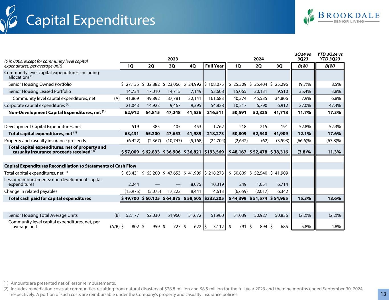 13(000美元,社区一级资本支出除外,每平均单位)20232024 3Q24 vs 3Q23 YTD 3Q24 vs YTD 3Q23 Q1 2Q Q3 4Q全年Q1 2Q Q3 B(W)B(W)社区一级资本支出,包括分配(1)高级住房自有投资组合27,135美元32,882美元23,066美元24,992美元108,075美元25,309美元25,404美元25,296美元(9.7)% 8.5%高级住房租赁投资组合14,73417,0 1014,7157,14953,60815,06520,1319,51035.4% 3.8%社区一级资本支出,净额(a)41,86949,89237,78132,141161,68340,37445,53534,8067.9% 6.8%企业资本支出(2)21,04314,9239,4679,39554,82810,2176,7906,91227.0% 47.4%非开发性资本支出净额(1)62,91264,81547,24841,536216,51150,59152,32541,71811.7% 17.3%开发资本支出净额5193854054531,76221821519152.8% 52.3%资本支出总额,净额(1)63,43165,20047,65341,989218,27350,80952,54041,90912.1% 17.6%财产和意外险收益(6,422)(2,367)(10,747)(5,168)(24,704)(2,642)(62)(3,593)(66.6)%(67.8)%资本支出总额,扣除收到的财产和意外险收益(1)57,009美元62,833美元36,906美元36,821美元193,569美元48,167美元52,478美元38,316美元(3.8)% 11.3%资本支出与现金流量表的对账资本支出总额,净额(1)63,431美元65,200美元47,653美元41,989美元218,273美元50,809美元52,540美元41,909美元出租人偿还:非开发性资本支出2,244 —— 8,07510,3192491,0516,714相关应付款项变动(15,975)(5,075)17,2228,4414,613(6,659)(2,017)6,342资本支出支付的现金总额49,700美元60,125美元64,875美元58,505美元233,205美元44,399美元51,574美元54,96515.3% 13.6%高级住房平均单位总数(b)52,17752,03051,96051,67251,96051,03950,92750,8每平均单位(A/B)$ 802 $ 959 $ 727 $ 622 $ 3,112 $ 791 $ 894 $ 6855.8% 4.8%资本支出(1)列报金额扣除出租人补偿。(2)包括2023年全年和截至2024年9月30日止九个月的自然灾害导致的社区补救费用分别为2880万美元和850万美元。根据公司的财产和意外伤害保险政策,此类费用的一部分可以报销。