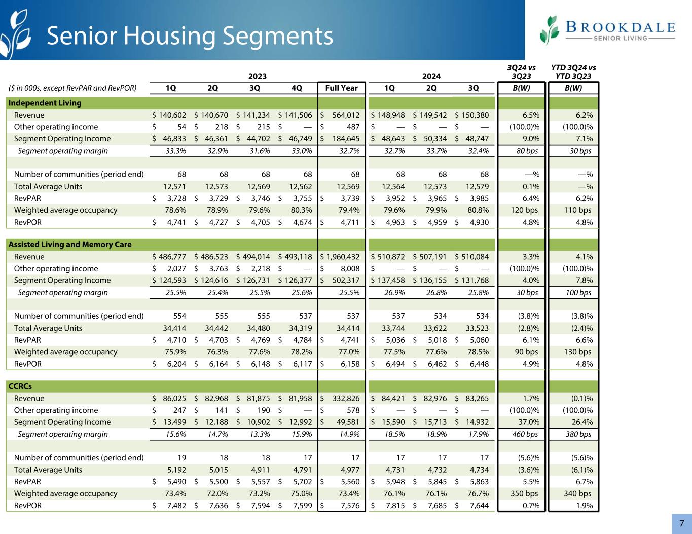 720232024 3Q24 vs 3Q23 YTD 3Q24 vs YTD 3Q23($ in 000s,RevPAR除外和RevPOR)第一季度第二季度第三季度第四季度全年第一季度第二季度第三季度B(W)B(W)独立生活收入$ 140,602 $ 140,670 $ 141,234 $ 141,506 $ 564,012 $ 148,948 $ 149,542 $ 150,3806.5% 6.2%其他营业收入$ 54 $ 218 $ 215 $ — $ 487 $ — $ — $ —(100.0)%(100.0)%分部营业收入$ 46,833 $ 46,361 $ 44,702 $ 46,749 $ 184,645 $ 48,643 $ 50,334 $ 48,7479.0% 7.1%分部营业利润率33.3% 32.9% 31.6% 33.0% 32.7% 33.7% 32.7% 32.7% 32.7% 32.4% 32.4% 32.4% 32.4% 32.4% 32.4% 32.7% 32.7% 32.7% 32.7% 32.7% 32.7% 32.7%% 80bps 30bps社区数量(期末)68686868686868 —% —%平均单位总数12,57112,57312,56912,56212,56912,56412,57312,5790.1% —% RevPAR $ 3,728 $ 3,729 $ 3,746 $ 3,755 $ 3,739 $ 3,952 $ 3,965 $ 3,9856.4% 6.2%加权平均入住率78.6% 78.9% 79.6% 80.3% 79.4% 79.6% 80.8% 120 bps 110bps RevPOR $ 4,741 $ 4,727 $ 4,705 $ 4,674 $ 4,711 $ 4,963 $ 4,959 $ 4,9304.8% 4.8% 辅助生活医疗和记忆护理收入$ 486,777 $ 486,523 $ 494,014 $ 493,118 $ 1,960,432 $ 510,872 $ 507,191 $ 510,0843.3% 4.1%其他营业收入$ 2,027 $ 3,763 $ 2,218 $ — $ 8,008 $ — $ — $ —(100.0)%分部营业收入$ 124,593 $ 124,616 $ 126,731 $ 126,377 $ 502,317 $ 137,458 $ 136,155 $ 131,7684.0% 7.8%分部营业利润率25.5% 25.4% 25.5% 25.6% 25.5% 26.9% 26.8% 25.8% 30bps 100bps社区数量(期末)554555555537537537534534(3.8)%(3.8)%平均单位总数34,41434,44234,48034,31934,41433,74433,62233,523(2.8)%(2.4)% RevPAR $ 4,710 $ 4,703 $ 4,769 $ 4,784 $ 4,741 $ 5,036 $ 5,018 $ 5,0606.1% 6.6%加权平均入住率75.9% 76.3% 77.6% 78.2% 77.0% 77.5% 77.6% 78.5% 90 bps 130 bps RevPOR $ 6,204 $ 6,164 $ 6,148 $ 6,117 $ 6,158 $ 6,494 $ 6,462 $ 6,4484.9% 4.8% CCRC收入$ 86,025 $ 82,968 $ 81,875 $81,958 $ 332,826 $ 84,421 $ 82,976 $ 83,2651.7%(0.1)%其他营业收入$ 247 $ 141 $ 190 $ — $ 578 $ — $ — $ —(100.0)%(100.0)%分部营业收入$ 13,499 $ 12,188 $ 10,902 $ 12,992 $ 49,581 $ 15,590 $ 15,713 $ 14,93237.0% 26.4%分部营业利润率15.6% 14.7% 13.3% 15.9% 14.9% 18.5% 17.9% 460 bps 380 bps社区数量(期末)19181817171717(5.6)%(5.6)%平均单位总数5,1925,0154,9114,7914,9774,7314,7324,734(3.6)%(6.1)% RevPAR $ 5,490 $ 5,500 $ 5,557 $ 5,702 $ 5,560 $ 5,948 $ 5,845 $ 5,8635.5% 6.7%加权平均入住率73.4% 72.0% 73.2% 75.0% 73.4% 76.1% 76.1% 76.7% 350 bps 340 bps RevPOR $ 7,482 $ 7,636 $ 7,594 $ 7,599 $ 7,576 $ 7,815 $ 7,685 $ 7,6440.7% 1.9%高级住房部门
