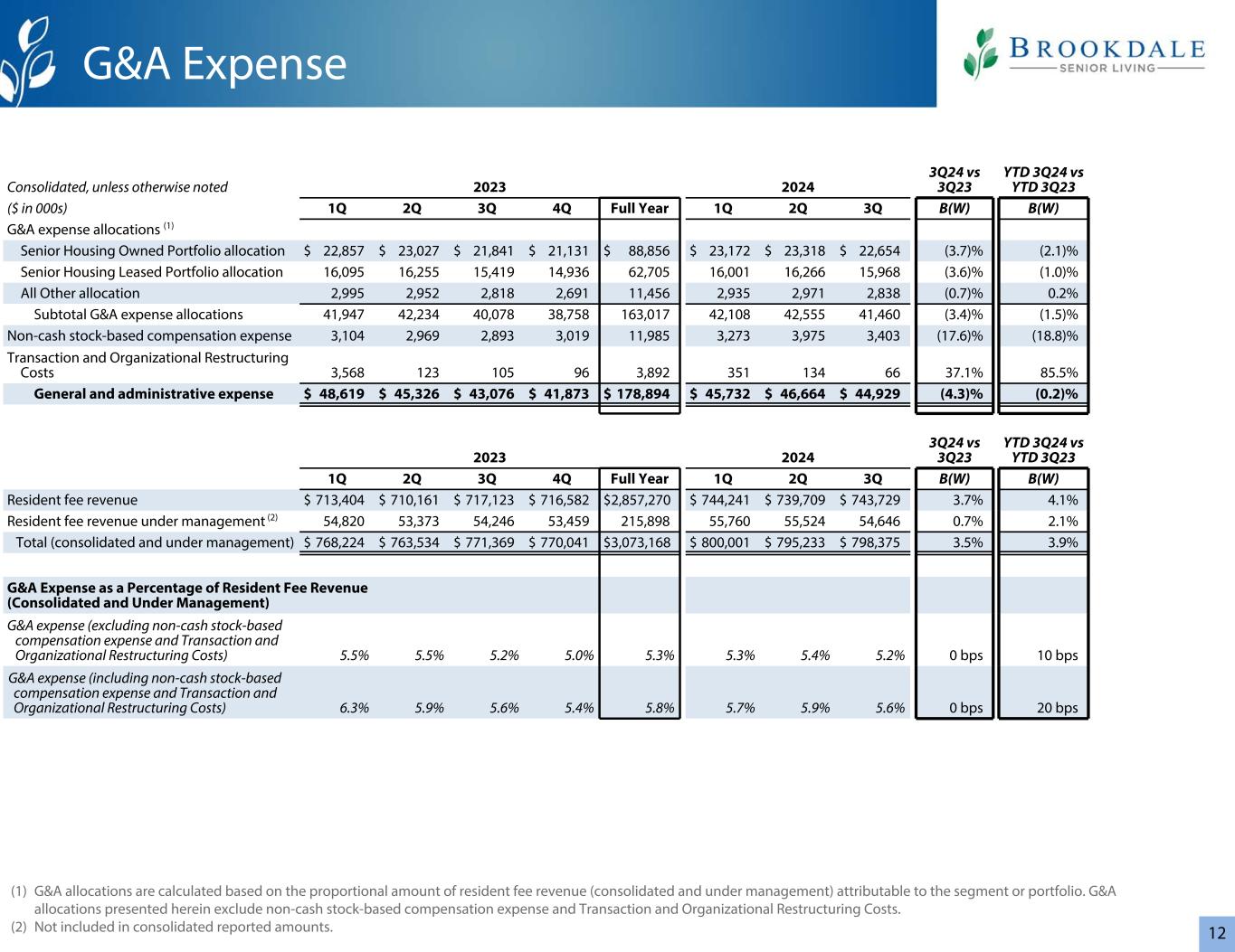 12(1)G & A分配是根据归属于分部或投资组合的居民费用收入(合并和管理下)的比例金额计算的。此处介绍的G & A分配不包括基于非现金股票的补偿费用以及交易和组织重组成本。(2)未纳入合并报告金额。合并,除非另有说明20232024 3Q24 vs 3Q23 YTD 3Q24 vs YTD 3Q23($ in 000s)1Q 2Q Q3 4Q全年1Q 2Q Q3 B(W)B(W)G & A费用分配(1)高级住房自有投资组合分配22,857美元23,027美元21,841美元21,131美元88,856美元23,172美元23,318美元22,654美元(3.7)%(2.1)%高级住房租赁投资组合分配16,09516,25515,41914,93662,70516,00116,26615,968(3.6)%(1.0)%所有其他分配2,9952,9522,8182,69111,4562,9352,9712,838(0.7)%0.2% G & A费用分配小计41%(1.5)%非现金股票补偿费用3,1042,9692,8933,01911,9853,2733,9753,403(17.6)%(18.8)%交易和组织重组费用3,568123105963,892351136637.1% 85.5%一般和管理费用$ 48,619 $ 45,326 $ 43,076 $ 41,873 $ 178,894 $ 45,732 $ 46,664 $ 44,929(4.3)%(0.2)% 20232024 3Q24 vs 3Q23 YTD 3Q24 vs YTD 3Q23 1Q2Q Q3 4Q Full Year Q1 2Q Q3 B(W)B(W)Resident Fee Revenue $ 713,404 $ 710,161 $ 717,123 $ 716,582 $ 2,857,270 $ 744,241 $ 739,709 $ 743,7293.7% 4.1% Resident Fee Revenue under Management(2)54,82053,37354,24653,459215,89855,76055,52454,6460.7% Total(和管理下)768,224美元763,534美元771,369美元770,041美元3,073,168美元800,001美元795,233美元798,3753.5% 3.9% G & A费用占居民费用收入的百分比(合并和管理下)G & A费用(不包括非现金股票补偿费用以及交易和组织重组成本)5.5% 5.5% 5.2% 5.0% 5.3% 5.4% 5.2% 0bps 10bps G & A费用(包括非现金股票补偿费用以及交易和组织重组成本)6.3% 5.9% 5.6% 5.4% 5.8% 5.7% 5.6% 0bps 20 bps G & A费用