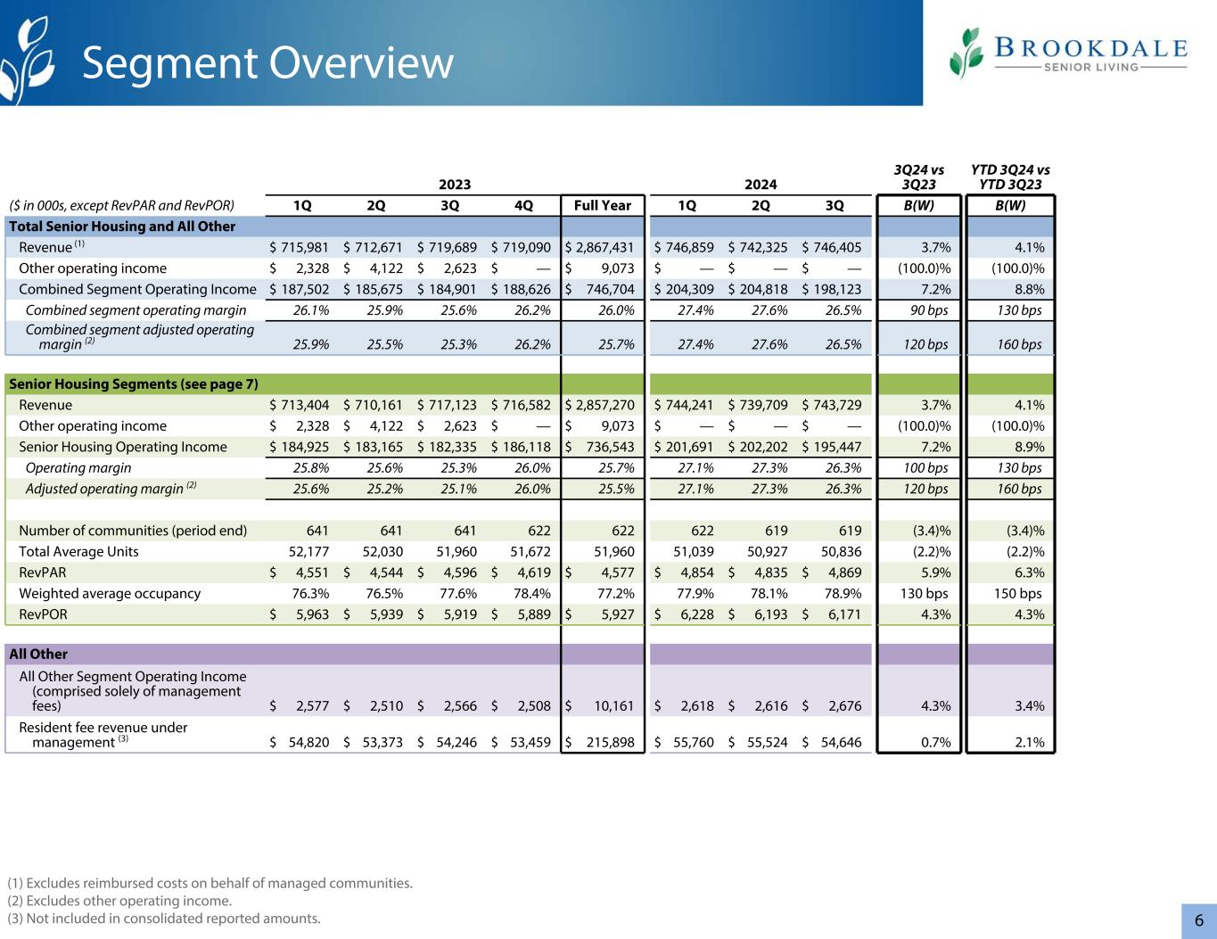 620232024 3Q24 vs 3Q23 YTD 3Q24 vs YTD 3Q23($ in 000s,RevPAR和RevPOR除外)1Q 2Q 3Q 4Q全年1Q 2Q 3Q B(W)B(W)高级住宅总额和所有其他收入(1)$ 715,981 $ 712,671 $ 719,689 $ 719,090 $ 2,867,431 $ 746,859 $ 742,325 $ 746,4053.7% 4.1%其他营业收入$ 2,328 $ 4,122 $ 2,623 $ — $ 9,073 $ — $ —(100.0)%合并分部营业收入$ 187,502 $ 185,675 $ 184,901 $ 188,626 $ 746,704 $ 204,309 $ 204,818 $ 198,1237.2% 8.8%合并分部营业利润率26.1% 25.9% 25.6% 26.2% 26.0% 27.4% 27.6% 26.5% 90 bps 130 bps合并分部调整后营业利润率(2)25.9% 25.5% 25.3% 26.2% 25.7% 27.4% 27.6% 26.5% 120 bps 160 bps高级住房部门(见第7页)收入$ 713,404 $ 710,161 $ 717,123 $ 716,582 $ 2,857,270 $ 744,241 $ 739,709 $ 743,7293.7% 4.1%其他营业收入$ 2,328 $ 4,122 $ 2,623 $ — $ 9,073 $ — $ — $ —(100.0)%(100.0)%高级住房营业收入$ 184,925 $ 183,165 $ 182,335 $ 186,118 $ 736,543 $ 201,691 $ 202 $ 195,4477.2% 8.9%营业利润率25.8% 25.6% 25.3% 26.0% 25.7% 27.1% 27.3% 26.3% 100基点130基点调整后营业利润率(2)25.6% 25.2% 25.1% 26.0% 25.5% 27.1% 27.3% 26.3% 120基点160基点社区数量(期末)641641622622622622619(3.4)%(3.4)%平均单位总数52,17752,03051,96051,67251,96051,03950,92750,836(2.2)%(2.2)% RevPAR $ 4,551 $ 4,544 $ 4,596 $ 4,619 $ 4,577 $ 4,854 $ 4,835 $ 4,8695.9%加权平均入住率76.3% 76.5% 77.6% 78.4% 77.2% 77.9% 78.1% 78.9% 130个基点150个基点RevPOR $ 5,963 $ 5,939 $ 5,919 $ 5,889 $ 5,927 $ 6,228 $ 6,193 $ 6,1714.3% 4.3%所有其他所有其他分部营业收入(仅包括管理费)$ 2,577 $ 2,510 $ 2,566 $ 2,508 $ 10,161 $ 2,618 $ 2,616 $ 2,6764.3% 3.4%居民管理费用收入(3)$ 54,820 $ 53,373 $ 54,246 $ 53,459 $ 215,898 $ 55,760 $ 55,524 $ 54,6460.7% 2.1%分部概览(1)不包括代表管理社区的报销费用。(2)不包括其他营业收入。(3)未纳入合并报告金额。