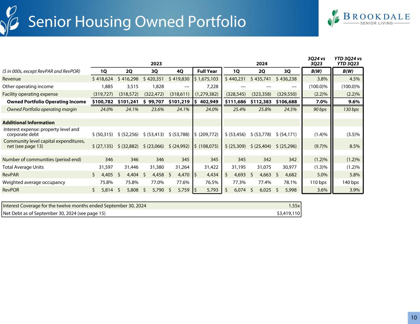1020232024 3Q24 vs 3Q23 YTD 3Q24 vs YTD 3Q23($ in 000s,RevPAR除外和RevPOR)Q1 2Q Q3 4Q全年Q1 2Q Q3 B(W)B(W)收入$ 418,624 $ 416,298 $ 420,351 $ 419,830 $ 1,675,103 $ 440,231 $ 435,741 $ 436,2383.8%其他营业收入1,8853,5151,828 — 7,228 ————(100.0)%(100.0)%设施营业费用(319,727)(318,572)(322,472)(318,611)(1,279,382)(328,545)(323,358)(329,550)(2.2)%(2.2)%自有投资组合营业收入$ 100,782 $ 101,241 $ 99,707 $ 101,219 $ 40224.0% 25.4% 25.8% 24.5% 90bps 130bps额外信息利息支出:物业水平和公司债务$(50,315)$(52,256)$(53,413)$(53,788)$(209,772)$(53,456)$(53,778)$(54,171)(1.4)%(3.5)%社区一级资本支出,净额(见第13页)$(27,135)$(32,882)$(23,066)$(24,992)$(108,075)$(25,309)$(25,404)$(25,296)(9.7)% 8.5%社区数量(期末)346346345345345342342(1.2)%(1.2)%平均单位总数31,59731,44631,38031,26431,42231,19531,07530,977(1.3)%(1.2)% RevPAR $ 4,405 $ 4,404 $ 4,458 $ 4,470 $ 4,434 $ 4,693 $ 4,663 $ 4,68 25.0% 5.8%加权平均入住率75.8% 75.8% 77.0% 77.6% 76.5% 77.3%RevPOR5,814美元5,808美元5,790美元5,759美元5,793美元6,074美元6,025美元5,9983.6% 3.9%截至2024年9月30日的十二个月高级住房自有投资组合利息覆盖率1.55x截至2024年9月30日的净债务(见第15页)3,419,110美元