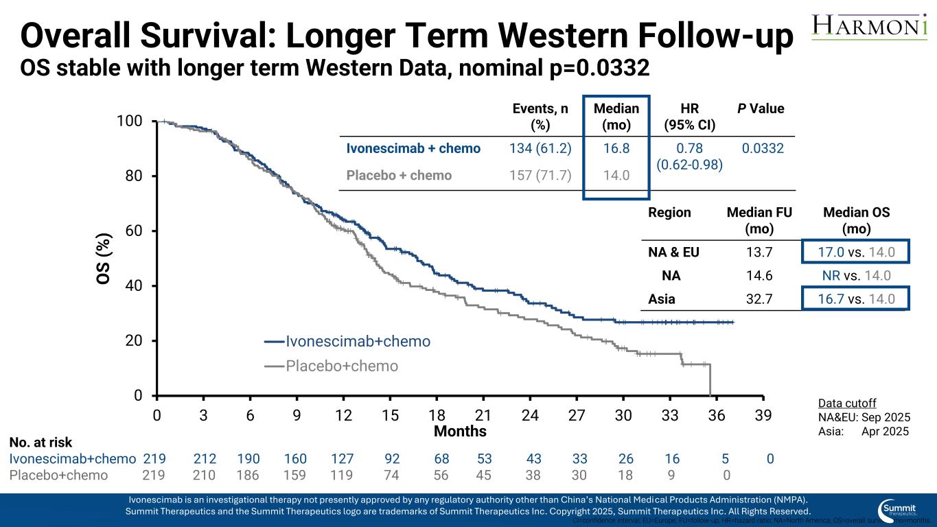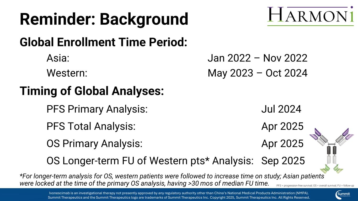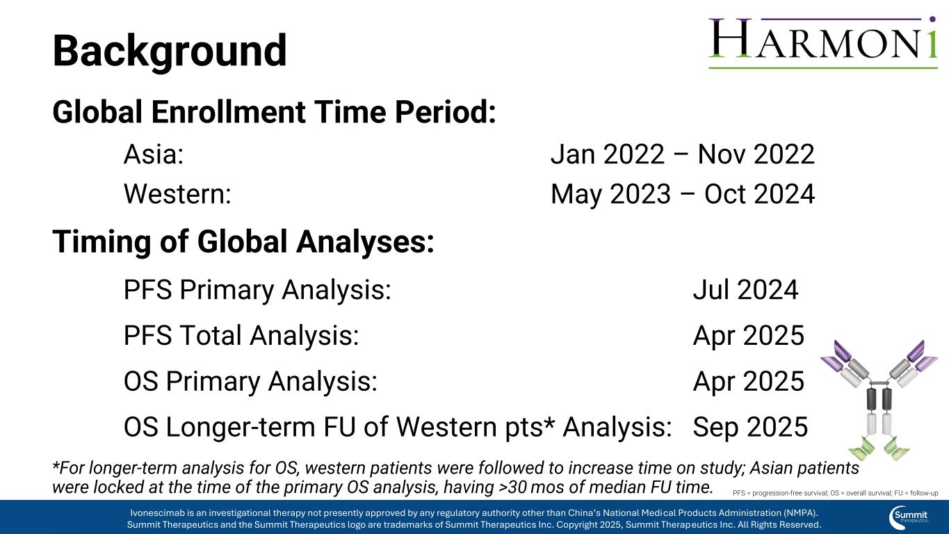 背景全球招生时间段:亚洲:2022年1月– 2022年11月西部:2023年5月– 2024年10月全球分析的时间:PFS主要分析:2024年7月PFS总分析:2025年4月OS主要分析:2025年4月OS西方pts的长期FU*分析:2025年9月*对于OS的长期分析,对西方患者进行随访以增加研究时间;亚洲患者被锁定在主要OS分析时,有> 30个月的中位FU时间。PFS =无进展生存期;OS =总生存期;FU =后续依沃奈西单抗是一种在研疗法,目前尚未获得中国国家药品监督管理局(NMPA)以外的任何监管机构的批准。Summit Therapeutics及Summit Therapeutics标识为Summit Therapeutics Inc. 2025版权所有的商标,Summit Therapeutics Inc.保留所有权利。