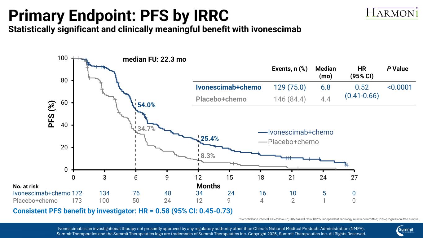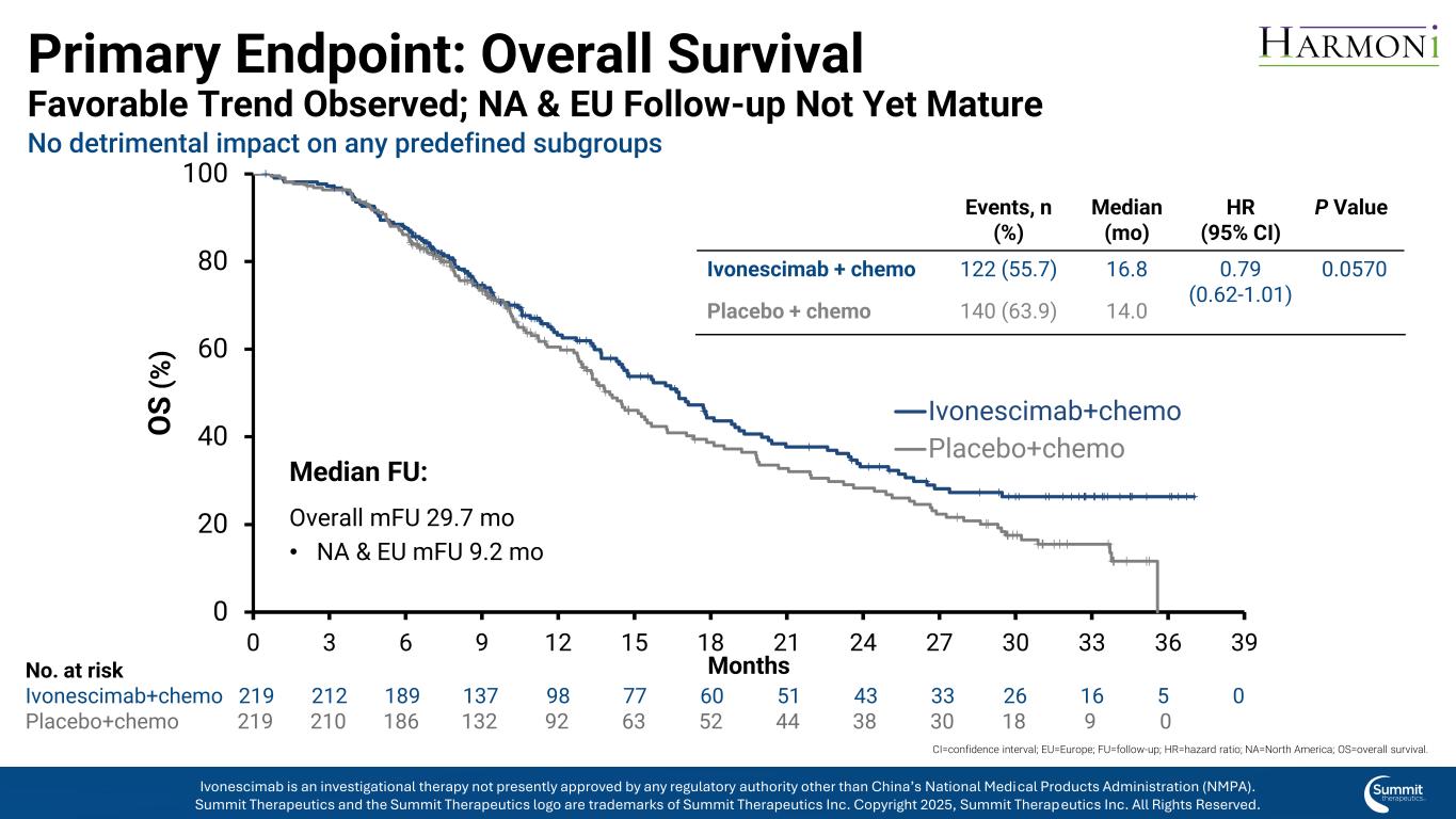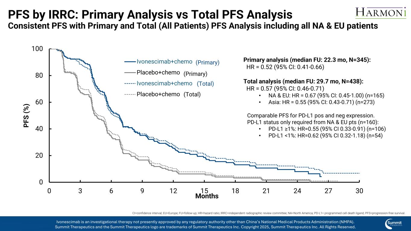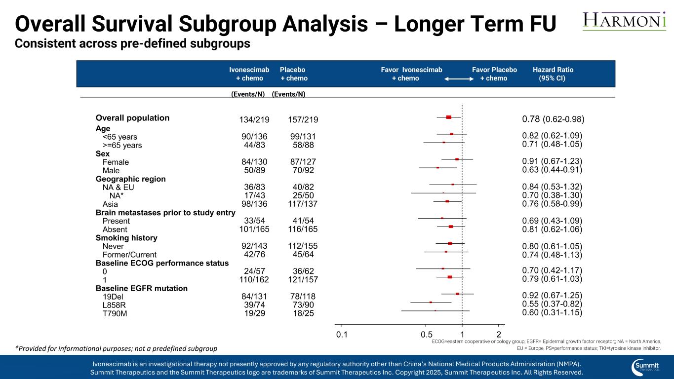 背景全球招生时间段:亚洲:2022年1月– 2022年11月西部:2023年5月– 2024年10月全球分析的时间:PFS主要分析:2024年7月PFS总分析:2025年4月OS主要分析:2025年4月OS西方pts的长期FU*分析:2025年9月*对于OS的长期分析,对西方患者进行随访以增加研究时间;亚洲患者被锁定在主要OS分析时,有> 30个月的中位FU时间。PFS =无进展生存期;OS =总生存期;FU =后续依沃奈西单抗是一种在研疗法,目前尚未获得中国国家药品监督管理局(NMPA)以外的任何监管机构的批准。Summit Therapeutics及Summit Therapeutics标识为Summit Therapeutics Inc. 2025版权所有的商标,Summit Therapeutics Inc.保留所有权利。