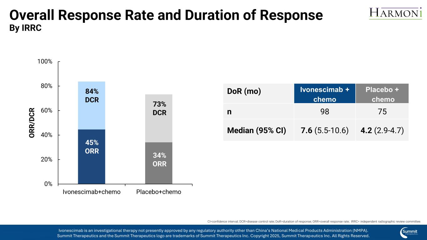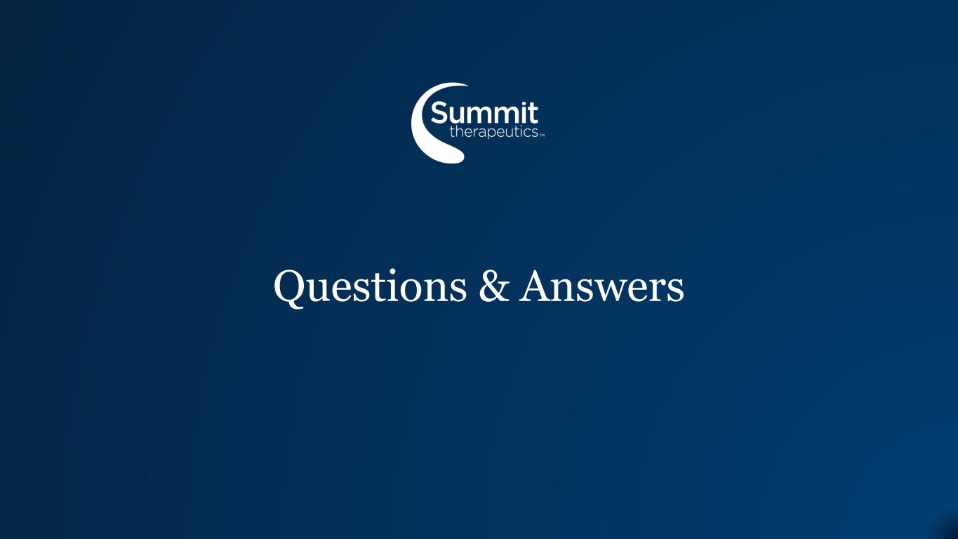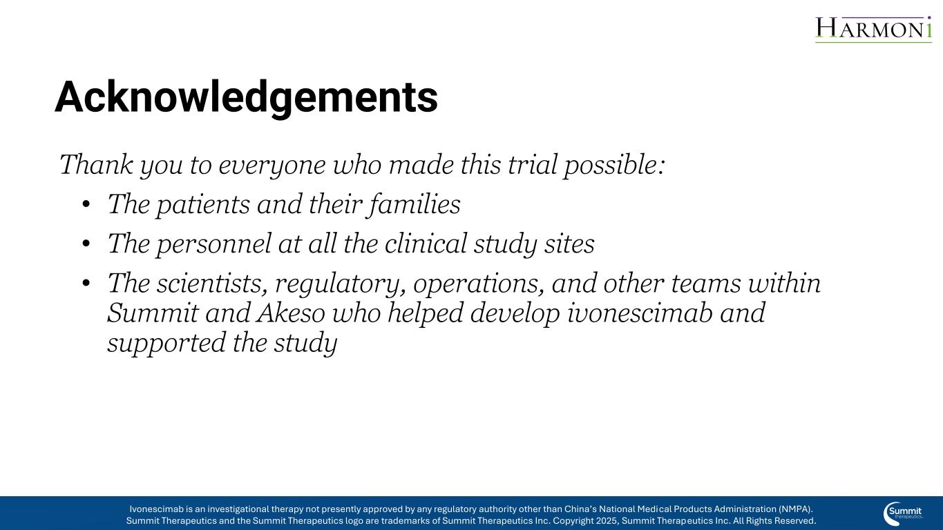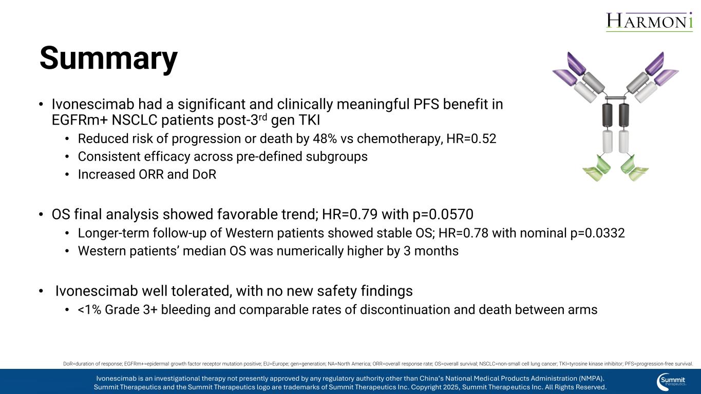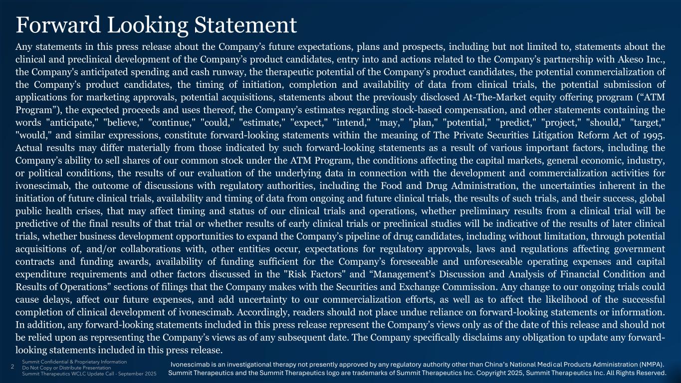 前瞻性声明本新闻稿中有关公司未来预期、计划和前景的任何声明,包括但不限于有关公司候选产品的临床和临床前开发、公司与Akeso Inc.合作的进入和相关行动的声明、公司的预期支出和现金跑道、公司候选产品的治疗潜力、公司候选产品的潜在商业化、临床试验数据的启动、完成和可用性的时间、上市许可申请的潜在提交、潜在收购,关于先前披露的市场股票发行计划(“ATM计划”)、预期收益及其用途、公司对基于股票的薪酬的估计,以及包含“预期”、“相信”、“继续”、“可能”、“估计”、“预期”、“打算”、“可能”、“计划”、“潜力”、“预测”、“项目”、“应该”、“目标”、“将”和类似表述的其他陈述,构成1995年《私人证券诉讼改革法案》含义内的前瞻性陈述。由于各种重要因素,实际结果可能与此类前瞻性陈述所表明的结果存在重大差异,包括公司根据ATM计划出售我们普通股的能力、影响资本市场的条件、总体经济、行业或政治状况、我们对与ivonescimab的开发和商业化活动相关的基础数据的评估结果、与包括美国食品药品监督管理局在内的监管机构讨论的结果、未来临床试验启动所固有的不确定性,来自正在进行和未来临床试验的数据的可用性和时间、此类试验的结果及其成功、全球公共卫生危机,这可能会影响我们临床试验和运营的时间和状态,临床试验的初步结果是否会预测该试验的最终结果,或者早期临床试验或临床前研究的结果是否会指示后期临床试验的结果,是否会出现扩大公司候选药物管道的商业发展机会,包括但不限于通过潜在收购和/或与其他实体合作,对监管批准的预期、影响政府合同和资金奖励的法律法规、足以满足公司可预见和不可预见的运营费用和资本支出要求的资金的可用性以及公司向美国证券交易委员会提交的文件的“风险因素”和“管理层对财务状况和运营结果的讨论和分析”部分中讨论的其他因素。我们正在进行的试验的任何变化都可能导致延误,影响我们未来的开支,并为我们的商业化努力增加不确定性,以及影响成功完成ivonescimab临床开发的可能性。因此,读者不应过分依赖前瞻性陈述或信息。此外,本新闻稿中包含的任何前瞻性陈述仅代表公司截至本新闻稿发布之日的观点,不应被视为代表公司截至任何后续日期的观点。该公司明确表示不承担更新本新闻稿中包含的任何前瞻性陈述的任何义务。Summit机密&专有信息不复制或分发演示文稿Summit Therapeutics WCLC更新电话-2025年9月2伊沃奈西单抗是一种研究性疗法,目前未获得中国国家药品监督管理局(NMPA)以外的任何监管机构的批准。Summit Therapeutics及Summit Therapeutics标识为Summit Therapeutics Inc. 2025版权所有的商标,Summit Therapeutics Inc.保留所有权利。