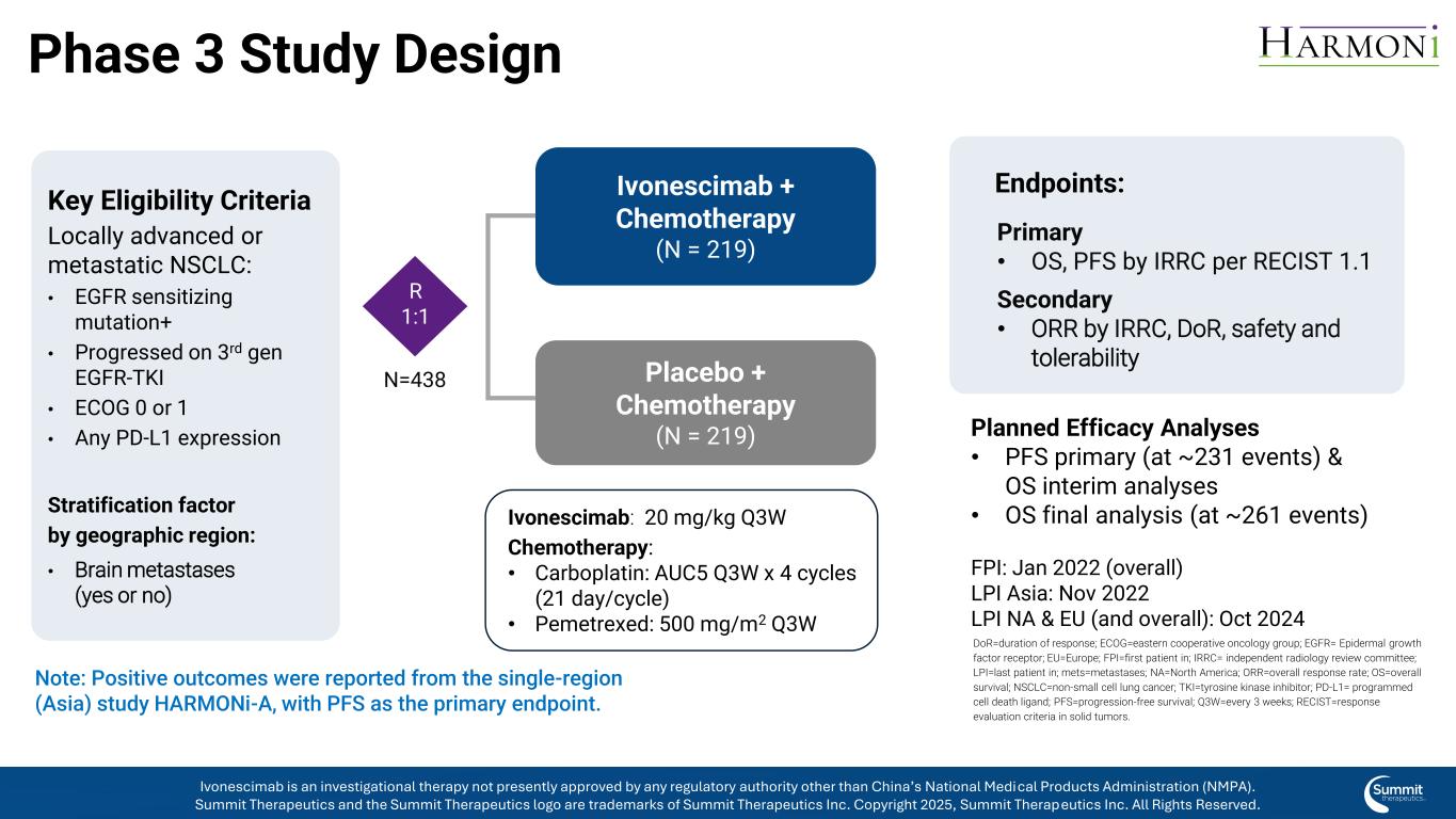 3期研究设计关键资格标准局部晚期或转移性NSCLC:• EGFR致敏突变+ •第3代EGFR-TKI进展• ECOG 0或1 •按地理区域划分的任何PD-L1表达分层因子:•脑转移(是或否)ivonescimab +化疗(N = 219)安慰剂+化疗(N = 219)原发性• OS,PFS由IRRC根据RECIST 1.1继发性• ORR由IRRC、DOR、安全性和耐受性终点:计划疗效分析• PFS主要(在~231个事件时)& OS中期分析• OS最终分析(在~261个事件时)FPI:2022年1月(总体)LPI亚洲:2022年11月LPI NA & EU(以及总体):2024年10月伊沃奈西单抗:20mg/kg Q3W化疗:•卡铂:AUC5 Q3W x4个周期(21天/周期)•培美曲塞:500mg/m2 Q3W注:单区域(亚洲)研究HarMONi-A报告了阳性结果,以PFS为主要终点。R1:1 N = 438 DOR =应答持续时间;ECOG =东部合作肿瘤学组;EGFR =表皮生长因子受体;EU =欧洲;FPI = first patient in;IRRC =独立放射学审查委员会;LPI = last patient in;mets =转移;NA =北美;ORR =总应答率;OS =总生存期;NSCLC =非小细胞肺癌;TKI =酪氨酸激酶抑制剂;PD-L1 =程序性细胞死亡配体;PFS =无进展生存期;Q3W =每3周;RECIST =实体瘤的应答评估标准。Ivonescimab是一种研究性疗法,目前未获得除中国国家药品监督管理局(NMPA)以外的任何监管机构的批准。Summit Therapeutics及Summit Therapeutics标识为Summit Therapeutics Inc. 2025版权所有的商标,Summit Therapeutics Inc.保留所有权利。