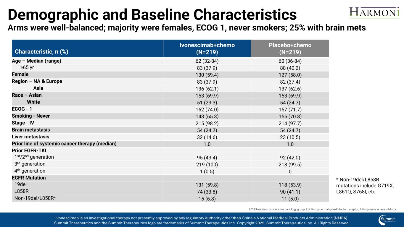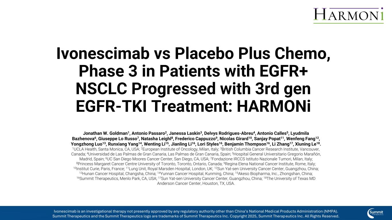 Ivonescimab vs Placebo Plus Chemo,3期EGFR + NSCLC患者3代EGFR-TKI治疗进展:Harmoni Jonathan W. Goldman1,Antonio Passaro2,Janessa Laskin3,Delvys Rodrigues-Abreu4,Antonio Calles5,Lyudmila Bazhenova6,Giuseppe Lo Russo7,Natasha Leighl8,Frederico Cappuzzo9,Nicolas Girard10,Sanjay Popat11,文峰Fang12,Yongzhong Luo13,Runxiang Yang14,Wenting Li15,Jianning Li16,Lori Styles16,Benjamin Thompson16,Li Zhang17,Xiuning Le18。1UCLA Health,美国加利福尼亚州圣莫尼卡;2European Institute of Oncology,意大利米兰;3British Columbia Cancer Research Institute,加拿大温哥华;4Universidad de Las Palmas de Gran Canaria,西班牙Las Palmas de Gran Canaria;5Hospital General Universitario Gregorio Mara ñ ó n,西班牙马德里;6UC San Diego Moores Cancer Center,San Diego,加利福尼亚州,美国米兰;7Fondazione IRCCS Istituto Nazionale Tumori,意大利米兰;8Princess Margaret Cancer Centre University,Toronto,Ontario,Canada,Canada;9Regina Elena National Cancer Institute,Rome,Italy;10Institut Curie,Paris,Fran中国;14中国昆明市云南省肿瘤医院;15中国中山Akeso Biopharma,Inc.;16 Summit Therapeutics,美国加利福尼亚州门洛帕克;17中国广州中山大学癌症中心;18美国德克萨斯州休斯顿德克萨斯大学MD安德森癌症中心。Ivonescimab是一种研究性疗法,目前未获得除中国国家药品监督管理局(NMPA)以外的任何监管机构的批准。Summit Therapeutics及Summit Therapeutics标识为Summit Therapeutics Inc. 2025版权所有的商标,Summit Therapeutics Inc.保留所有权利。
