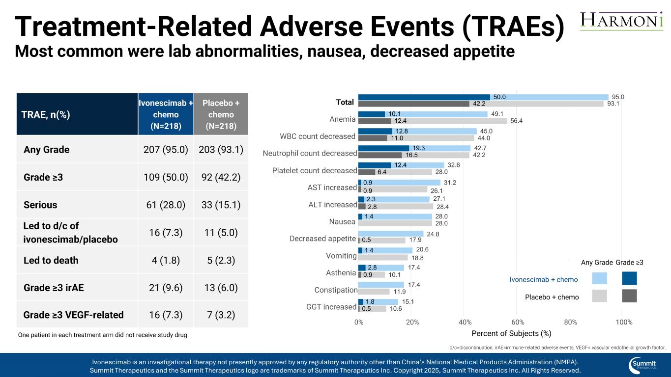 2.3 0.9 10.12.8 1.8 1.4 19.31 2.4 1.41 2.8 2.8 0.91 2.4 0.9 0.5 0.5 16.56.41 1.05 0.04 2.227.13 1.24 9.11 7.41 7.41 7.424.81 5.128.04 2.73 2.62 0.64 5.028.4 26.15 6.4 10.11 1.9 17.9 10.628.04 2.228.0 18.84 4.095.09 3.1 GGT增加便秘乏力呕吐食欲下降恶心ALT增加AST增加血小板计数减少中性粒细胞计数减少贫血总数0% 20% 40% 60% 80% 100%受试者百分比(%)治疗相关不良事件(TRAE)最常见的是实验室异常、恶心、食欲下降≥ 3级ivonescimab +化疗安慰剂+化疗每个治疗组的任何一级患者均未接受研究药物TRAE,n(%)ivonescimab +化疗(N = 218)安慰剂+化疗(N = 218)任何207级(95.0)203(93.1)≥ 3109(50.0)92(42.2)严重61(28.0)33(15.1)导致ivonescimab/安慰剂的d/c 16(7.3)11(5.0)导致死亡4(1.8)5(2.3)3级≥ iRAE 21(9.6)13(6.0)3级≥ VEGF相关16(7.3)7(3.2)d/c =停药;iRAE =免疫相关不良事件;VEGF =血管Ivonescimab是一种研究性疗法,目前未获得中国国家药品监督管理局(NMPA)以外的任何监管机构的批准。Summit Therapeutics及Summit Therapeutics标识为Summit Therapeutics Inc. 2025版权所有的商标,Summit Therapeutics Inc.保留所有权利。