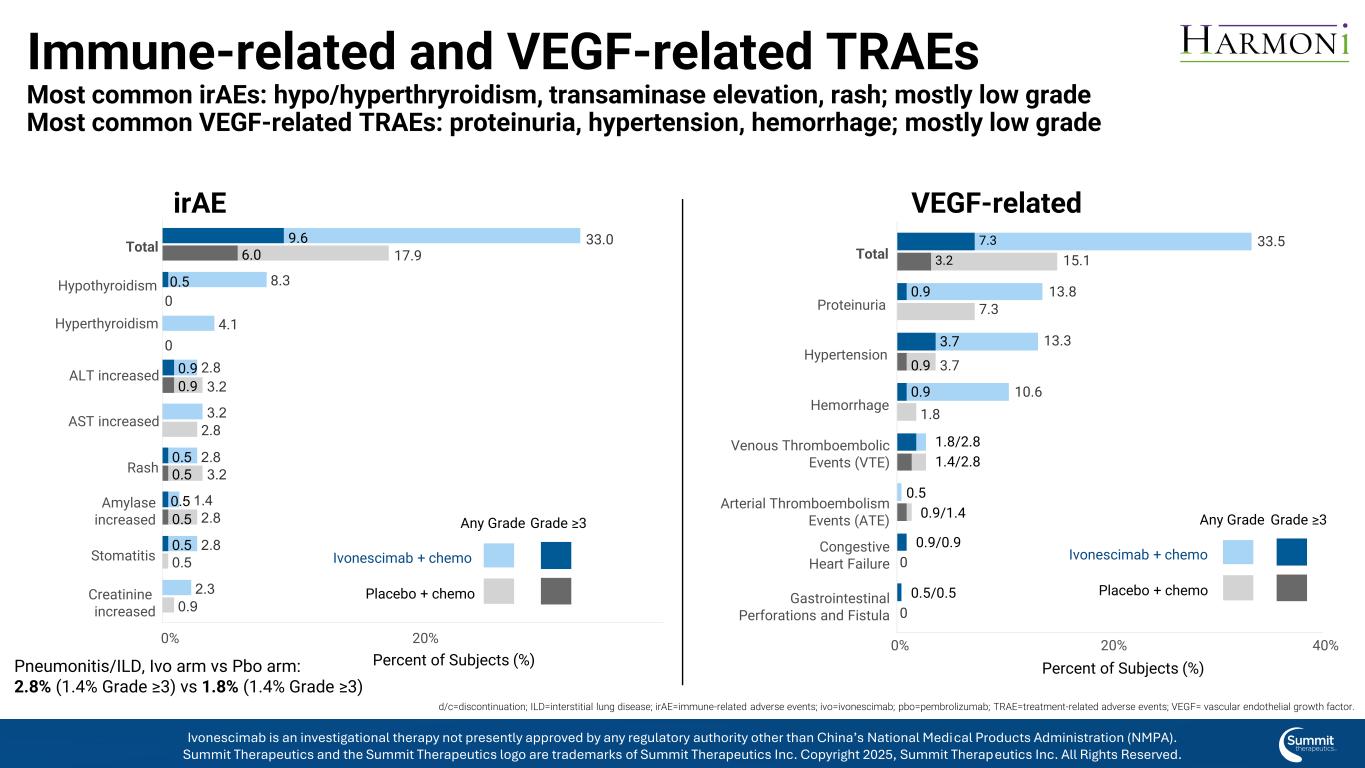0.9 0.9 0.5 0.5 0.5 0.5 0.5 0.5 0.59.66.0 2.8 3.2 1.4 2.8 3.2 2.8 2.3 0.9 4.18.3 2.8 3.2 2.8 0.53 3.01 7.900肌酐增高的口腔炎淀粉酶增高的皮疹AST增高的ALT增高的甲亢甲状腺功能减退症合计0.5 0.9/1.4 0.9/0.9 0.5/0.5 1.8/2.8 1.4/2.8 0.9 3.7 0.9 7.3 3.2 10.6 1.81 3.3 3.71 3.87.33 3.5 15.100胃肠穿孔和瘘管性充血性心力衰竭动脉血栓栓塞事件(ATE)静脉血栓栓塞事件(VTE)出血性高血压蛋白尿合计0% 20% 40%受试者百分比(%)免疫相关和VEGF相关TRAEs最常见的IRAEs:hypo/hyperthyroyrotheryrotherrotherog/hyperthyrotherothero皮疹;多为低级别最常见VEGF相关TRAEs:蛋白尿、高血压、出血;多为低级别VEGF相关IRAES肺炎/ILD、ivo arm vs Pbo arm:2.8%(1.4% ≥ 3级)vs 1.8%(1.4% ≥ 3级)≥ 3级ivonescimab +化疗安慰剂+化疗任意0级20%受试者百分比(%)≥ 3级ivonescimab +化疗安慰剂+化疗任意级d/c =停药;ILD =间质性肺病;IRAEE =免疫相关不良事件;ivo = ivonescimab;pbo = pembrolizumab;TRAEE =治疗相关不良事件;VEGF =血管内皮Ivonescimab是一种研究性疗法,目前未获得除中国国家药品监督管理局(NMPA)以外的任何监管机构的批准。Summit Therapeutics及Summit Therapeutics标识为Summit Therapeutics Inc. 2025版权所有的商标,Summit Therapeutics Inc.保留所有权利。