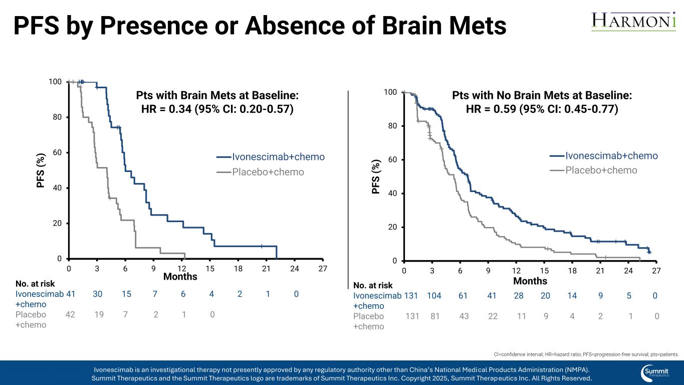 出席的PFS或无脑MET0204060801000369121518212427 P F S(%)ivonescimab +化疗安慰剂+化疗PTS,基线有脑METs:HR = 0.34(95% CI:0.20-0.57)0204060801000369121518212427 P F S(%)月ivonescimab +化疗安慰剂+化疗PTS,基线无脑METs:HR = 0.59(95% CI:0.45-0.77)月风险数ivonescimab 413015764210 +化疗安慰剂42197210 +化疗风险号ivonescimab 1311046141282014950 +化疗安慰剂1318143221194210 +化疗CI =置信区间;HR =风险比;PFS =无进展生存期;pts =患者。伊沃奈西单抗是一种研究性疗法,目前未获得除中国国家药品监督管理局(NMPA)以外的任何监管机构的批准。Summit Therapeutics及Summit Therapeutics标识为Summit Therapeutics Inc.的商标,TERM2版权所有2025,Summit Therapeutics Inc.保留所有权利。