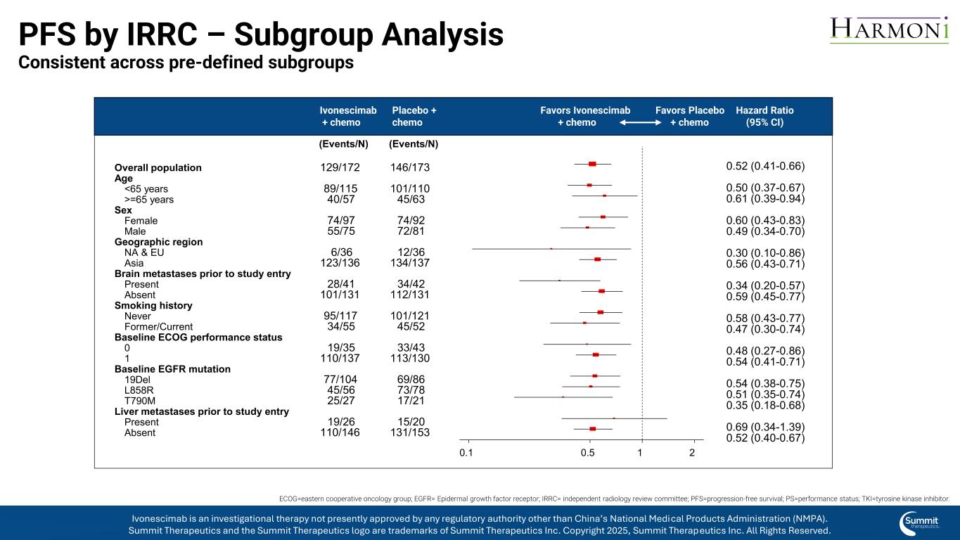 IRRC的PFS –跨预定义亚组一致的亚组分析(events/n)(events/n)HRPbo + chemoIvo + chemo0.52(0.41-0.66)0.50(0.37-0.67)0.61(0.39-0.94)0.60(0.43-0.83)0.49(0.34-0.70)0.30(0.10-0.86)0.56(0.43-0.71)0.34(0.20-0.57)0.59(0.45-0.77)0.58(0.43-0.77)0.47(0.30-0.74)0.48(0.27-0.86)0.54(0.41-0.71)0.54(0.38-0.75)0.51(0.35-0.74)0.35(0.18-0.68)0.69(0.34-1.39)0.52(0.40-0.67)0.10.5 12146/研究前进入吸烟史基线ECOG表现状态基线EGFR突变研究前进入肝转移< 65年> = 65年女性男性NA &欧盟亚洲目前缺席从未前任/当前01 19del L858R T790M目前缺席ivonescimab +化疗安慰剂+化疗风险比(95% CI)倾向于ivonescimab +化疗倾向于安慰剂+化疗倾向于ECOG =东部合作肿瘤学组;EGFR =表皮生长因子受体;IRRC =独立放射学审评委员会;PFS =无进展生存期;PS =表现状态;TKI =酪氨酸激酶抑制剂。Ivonescimab是一种研究性疗法,目前未获得除中国国家药品监督管理局(NMPA)以外的任何监管机构的批准。Summit Therapeutics及Summit Therapeutics标识为Summit Therapeutics Inc. 2025版权所有的商标,Summit Therapeutics Inc.保留所有权利。