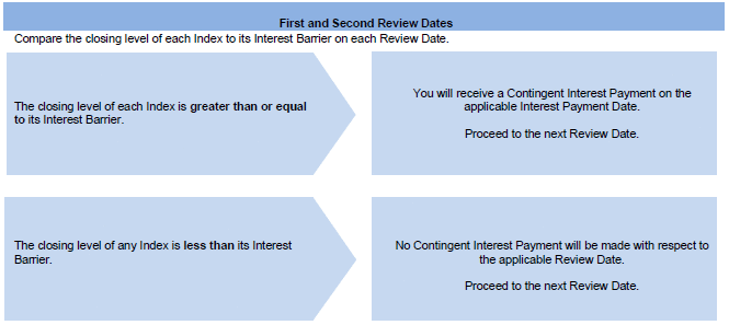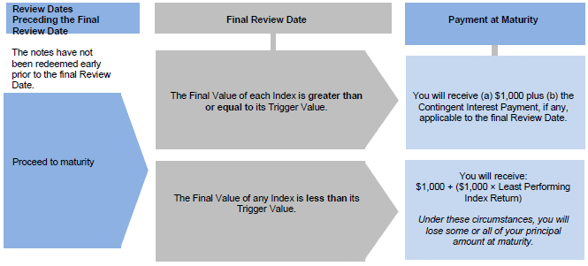 提前赎回: 我们可自行选择在任何利息支付日(第一、第二和最后利息支付日除外)提前赎回票据,价格为每张1,000美元本金金额的票据,等于(a)1,000美元加上(b)适用于紧接前一个审查日期的或有利息支付(如有)。如果我们打算提前赎回您的票据,我们将在提前赎回票据的适用的付息日至少三个工作日前向存托信托公司或DTC送达通知。 到期付款: 如果票据未被提前赎回,且每个指数的最终价值大于或等于其触发值,您将在到期时收到现金付款,每张本金金额为1,000美元的票据,等于(a)1,000美元加上(b)适用于最终审查日期的或有利息付款(如有)。 如果票据未被提前赎回,且任何指数的最终价值低于其触发值,则每张1,000美元本金票据的到期付款将按以下方式计算: $ 1,000 +($ 1,000 ×表现最差指数回报) 如果票据没有被提前赎回,任何指数的最终价值低于其触发值,你将在到期时损失超过本金金额的40.00%,并可能在到期时损失全部本金金额。 表现最差指数:指数回报率表现最差的指数 表现最差的指数收益:各指数的指数收益最低 指数回报: 关于每一个指数, (终值–初值) 初始值:就各指数而言,该指数在定价日的收盘水平 终值:就各指数而言,该指数于最后审查日的收市水平