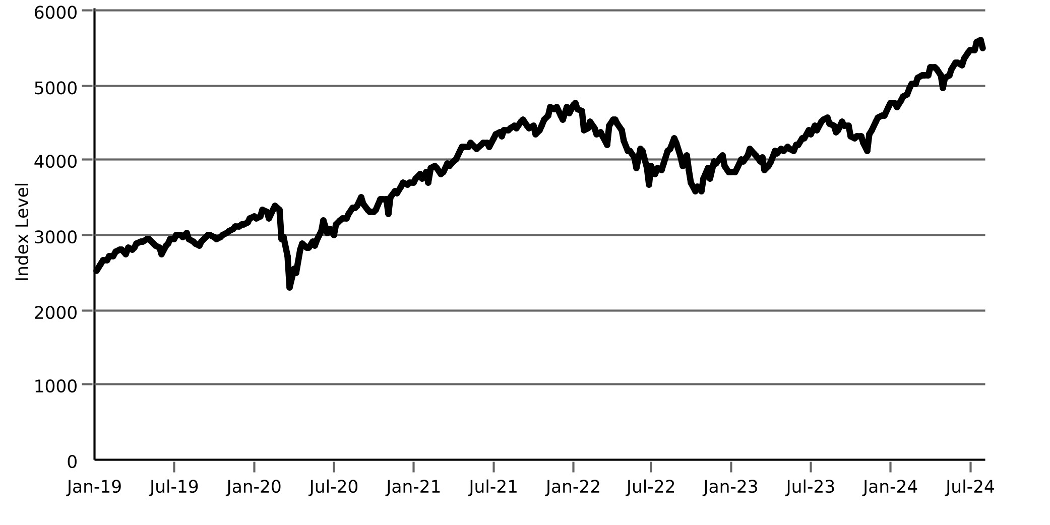 以下图表列出了基于2019年1月4日至2024年7月19日的每周历史收盘水平的各指数的历史表现。纳斯达克-100 ®科技板块指数SM2024年7月24日收盘水平为10,172.30。罗素2000 ®指数2024年7月24日收盘水平为2,195.373。标普 500 ®指数2024年7月24日收盘水平为5427.13。我们从Bloomberg Professional ® service(“彭博”)获得了高于和低于收盘水平,未经独立核实。