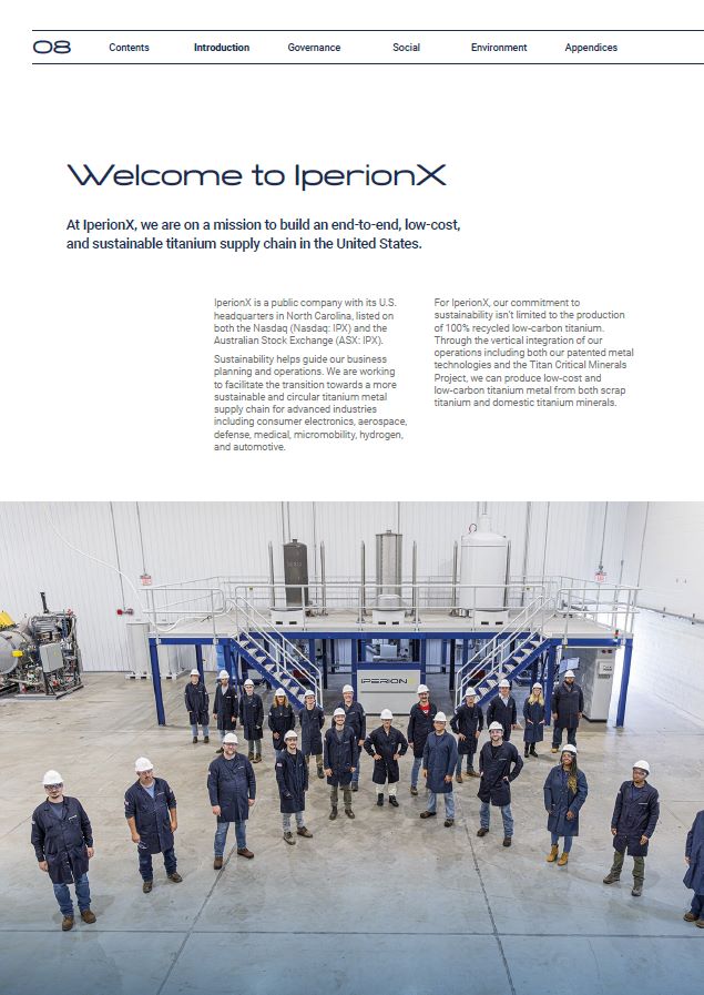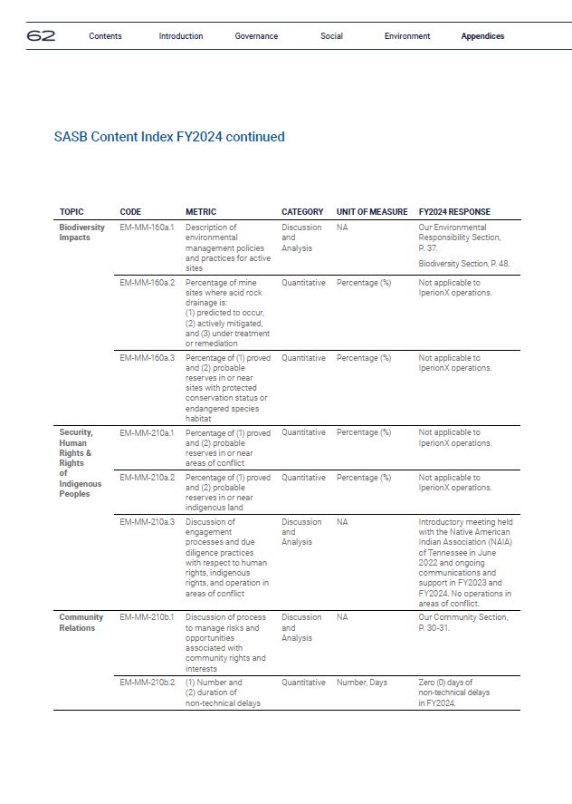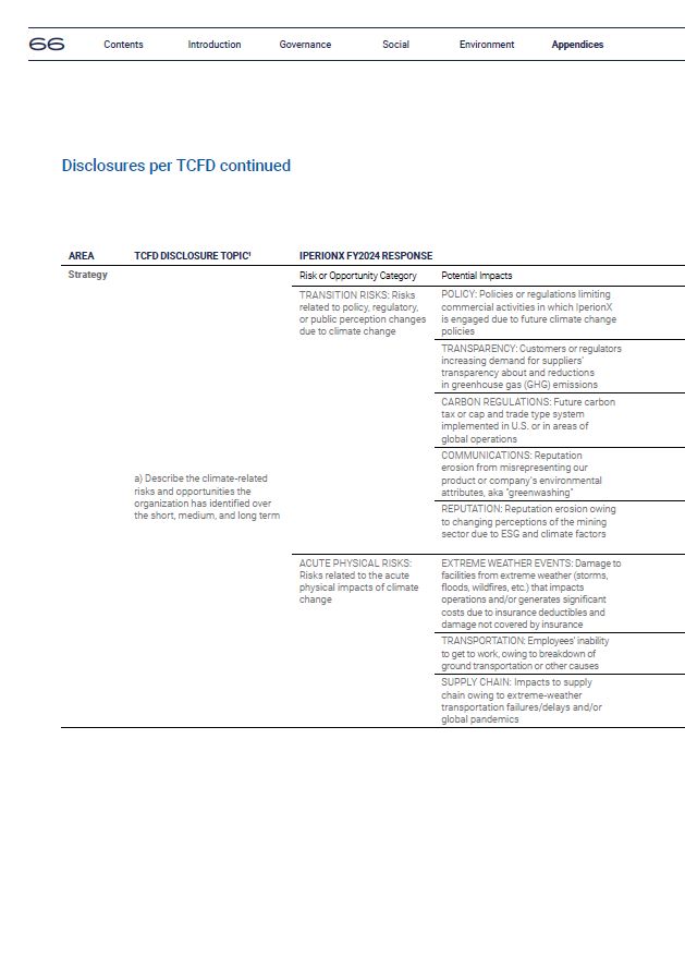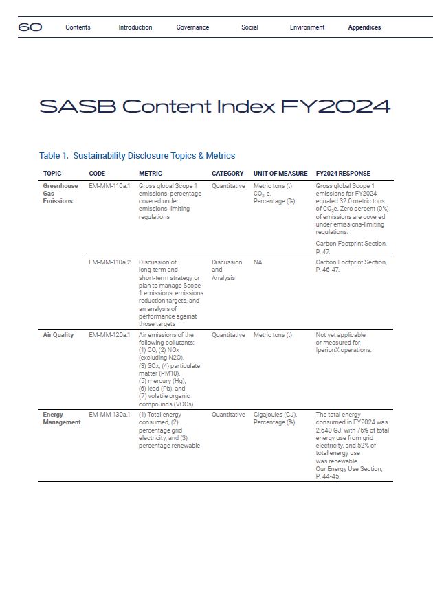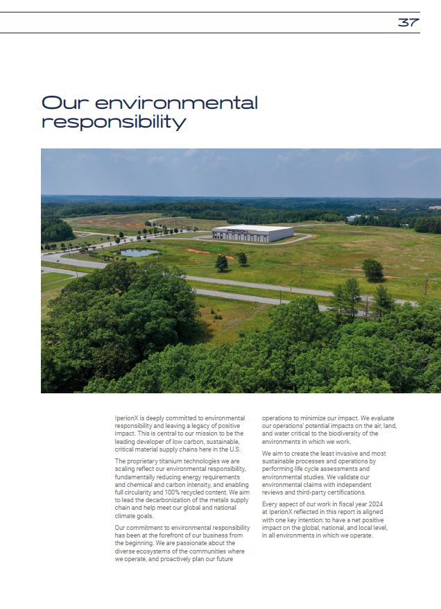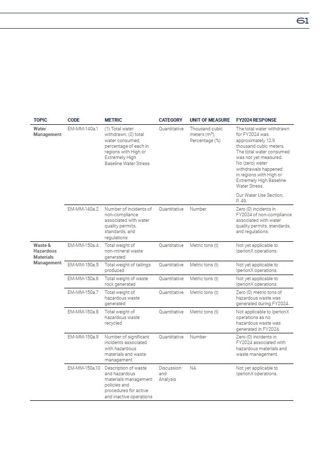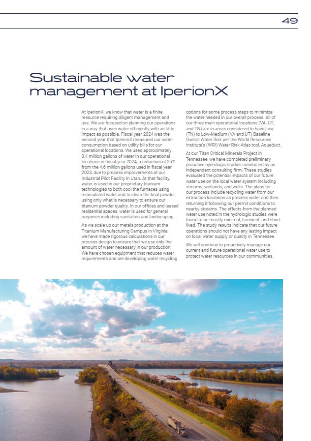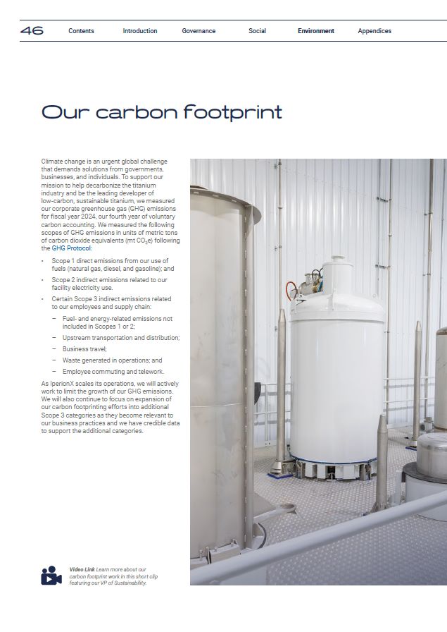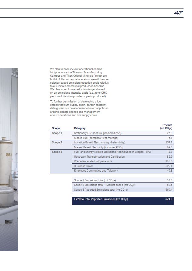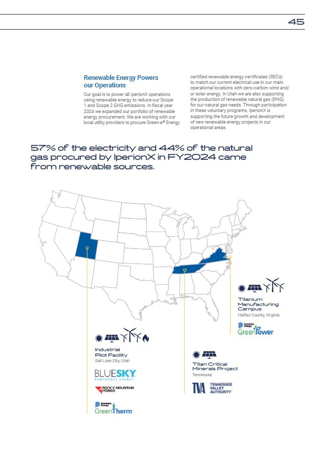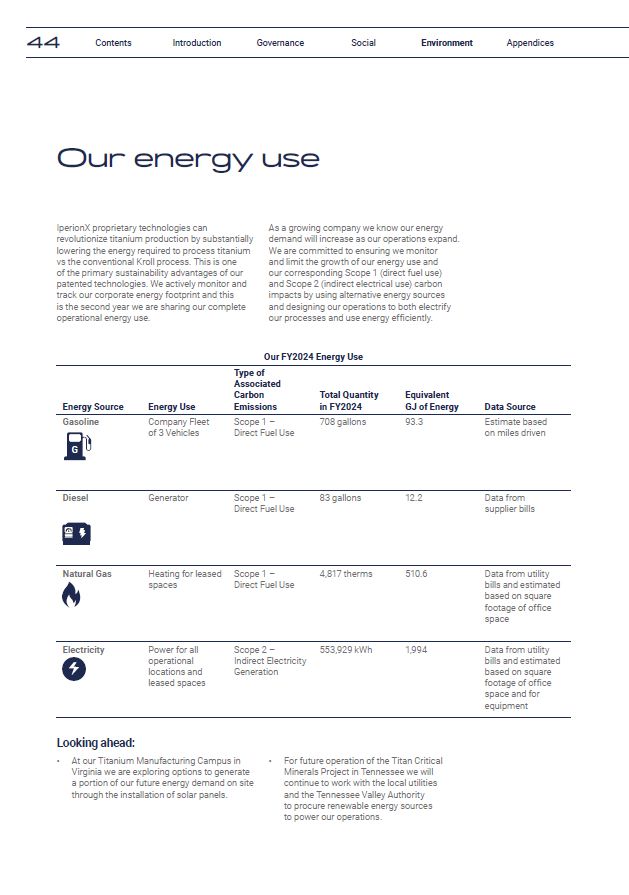 我们的能源使用IperionX专有技术可以作为一家成长中的公司,我们知道,随着我们业务的扩张,我们的能源革命性地提高了钛生产的需求,需求量将会大幅增加。降低加工钛所需的能源我们致力于确保与传统的Kroll工艺相比,我们对其进行监测。这是一个限制我们能源使用的增长和我们相应的范围1(直接燃料使用)专利技术的主要可持续性优势。我们积极监测和范围2(间接电力使用)碳跟踪我们的企业能源足迹,通过使用替代能源产生的这种影响是我们第二年分享我们的完整和设计我们的运营,以实现运营能源使用的电气化。我们的流程和高效使用能源。租赁空间的天然气供暖范围1 –直接燃料使用4,817热510.6数据来自水电费并根据办公空间的平方英尺估算所有运营地点和租赁空间的电力范围2 –间接发电量553,929 kWh 1,994数据来自水电费并根据办公空间的平方英尺估算对于设备,我们的2024财年能源使用柴油发电机范围1 –直接燃料使用83加仑12.2来自供应商账单的数据能源能源使用类型相关碳排放总量2024财年能源数据来源汽油公司车队3辆车范围1 –直接燃料使用708加仑93.3基于行驶里程的估计G展望未来:在我们位于弗吉尼亚州的钛金属制造园区,我们正在探索通过安装太阳能电池板在现场产生一部分未来能源需求的选项。为了田纳西州Titan Critical Minerals项目的未来运营,我们将继续与当地公用事业公司和田纳西河谷管理局合作,采购可再生能源来为我们的运营提供动力。44目录简介治理社会附录环境