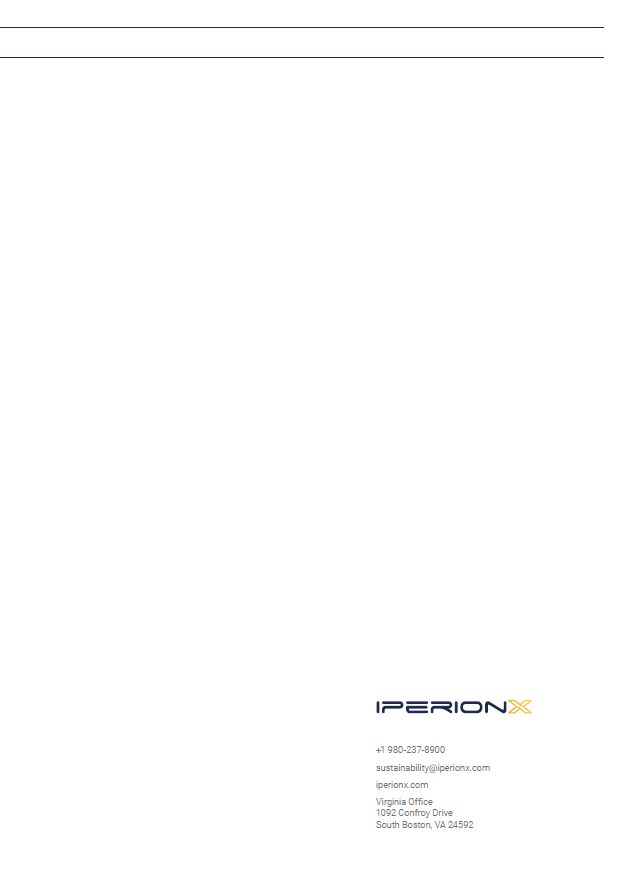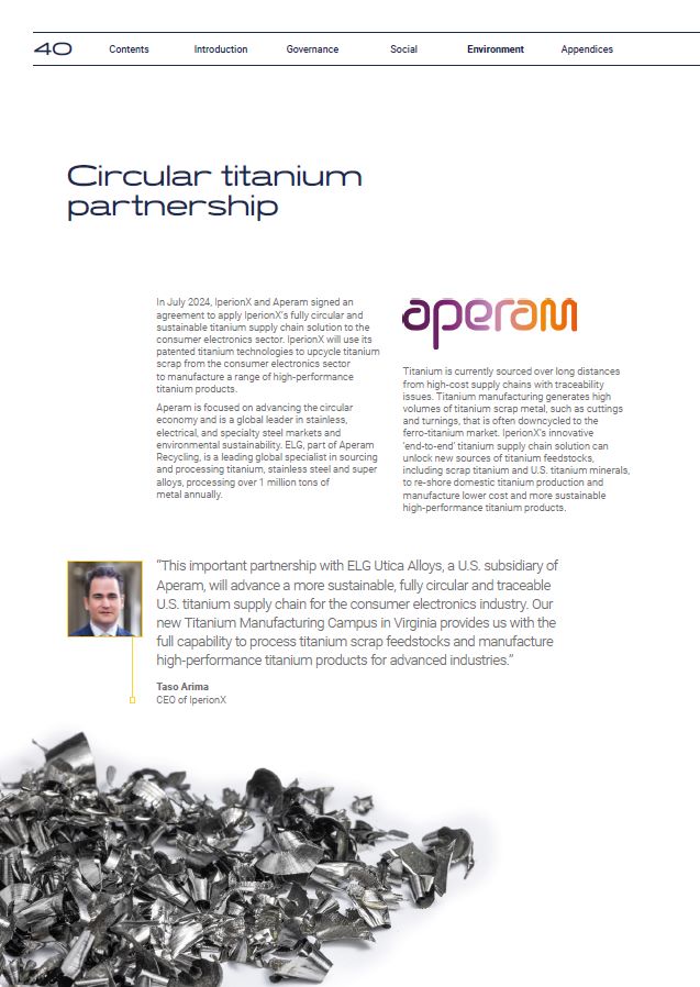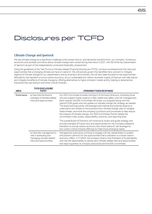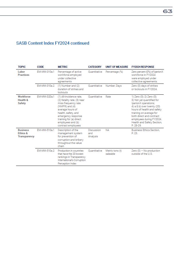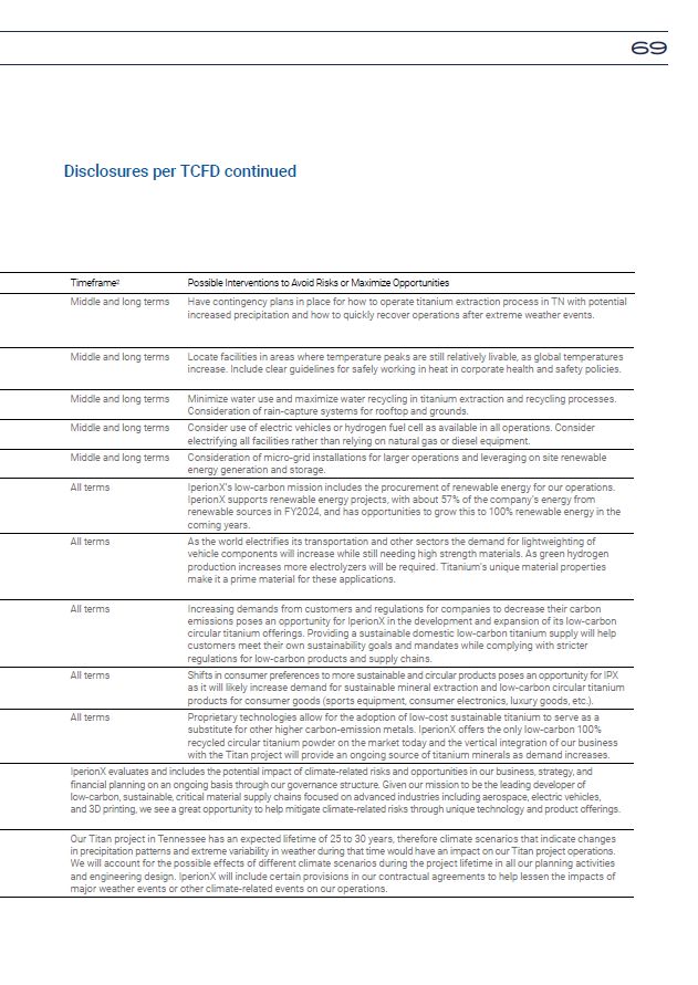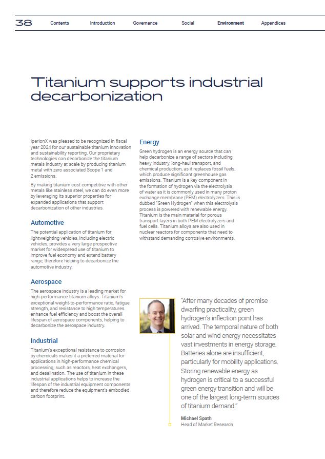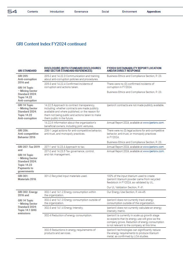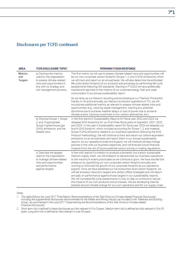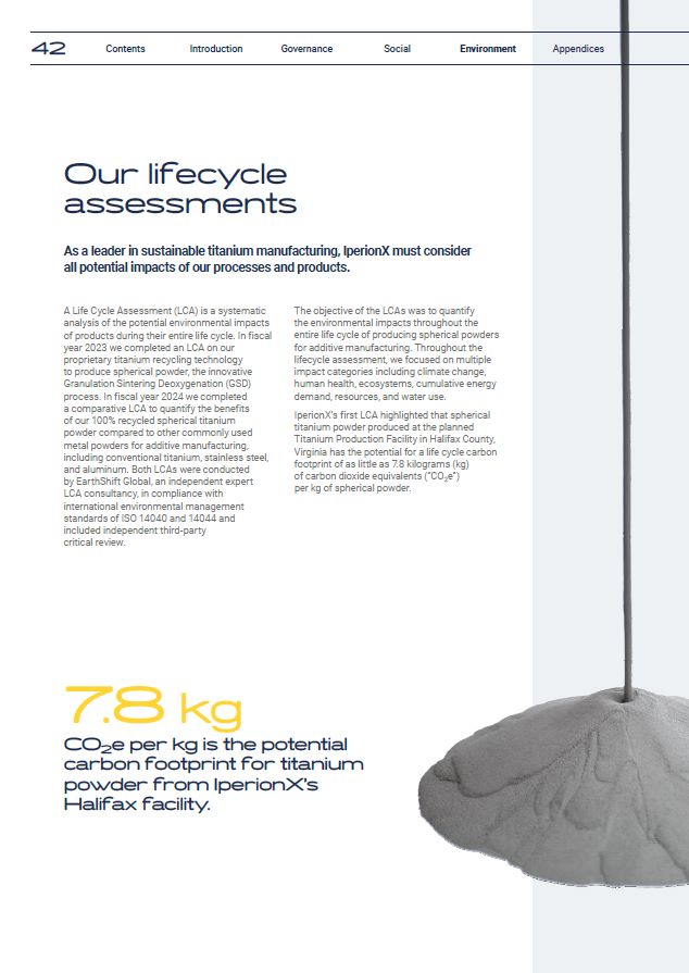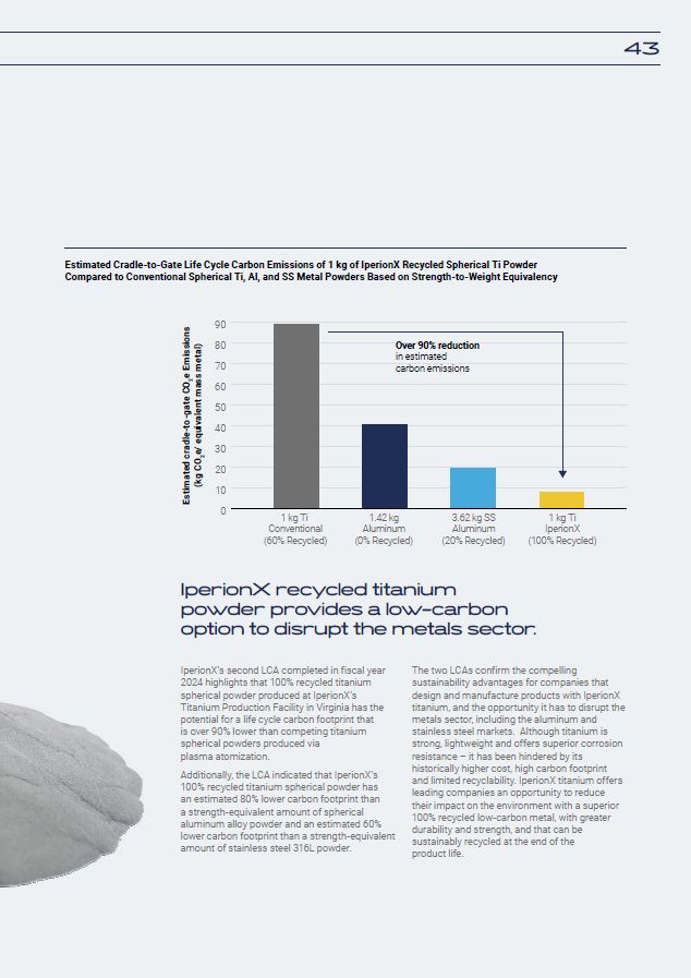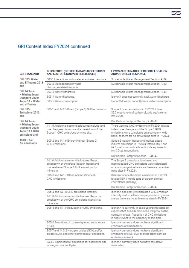 我们的能源使用IperionX专有技术可以作为一家成长中的公司,我们知道,随着我们业务的扩张,我们的能源革命性地提高了钛生产的需求,需求量将会大幅增加。降低加工钛所需的能源我们致力于确保与传统的Kroll工艺相比,我们对其进行监测。这是一个限制我们能源使用的增长和我们相应的范围1(直接燃料使用)专利技术的主要可持续性优势。我们积极监测和范围2(间接电力使用)碳跟踪我们的企业能源足迹,通过使用替代能源产生的这种影响是我们第二年分享我们的完整和设计我们的运营,以实现运营能源使用的电气化。我们的流程和高效使用能源。租赁空间的天然气供暖范围1 –直接燃料使用4,817热510.6数据来自水电费并根据办公空间的平方英尺估算所有运营地点和租赁空间的电力范围2 –间接发电量553,929 kWh 1,994数据来自水电费并根据办公空间的平方英尺估算对于设备,我们的2024财年能源使用柴油发电机范围1 –直接燃料使用83加仑12.2来自供应商账单的数据能源能源使用类型相关碳排放总量2024财年能源数据来源汽油公司车队3辆车范围1 –直接燃料使用708加仑93.3基于行驶里程的估计G展望未来:在我们位于弗吉尼亚州的钛金属制造园区,我们正在探索通过安装太阳能电池板在现场产生一部分未来能源需求的选项。为了田纳西州Titan Critical Minerals项目的未来运营,我们将继续与当地公用事业公司和田纳西河谷管理局合作,采购可再生能源来为我们的运营提供动力。44目录简介治理社会附录环境