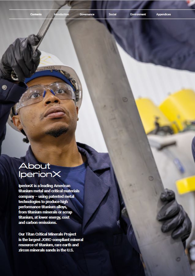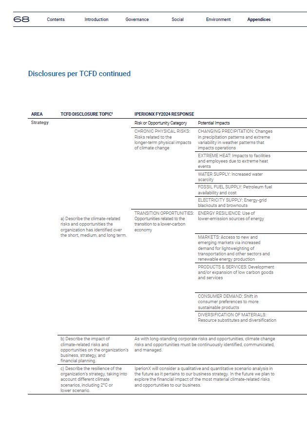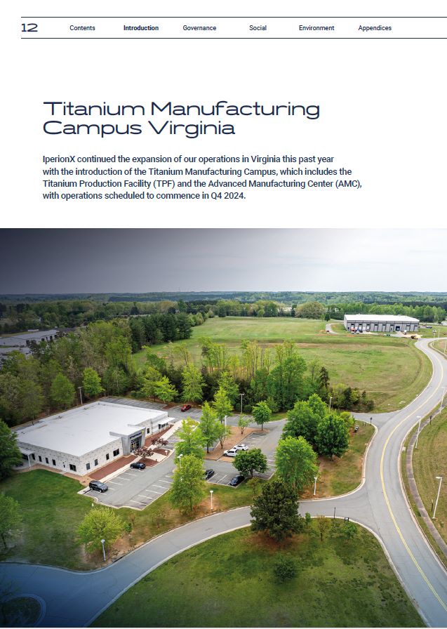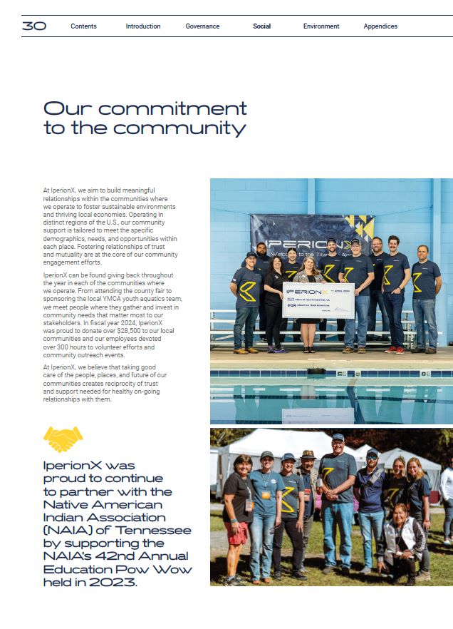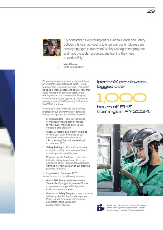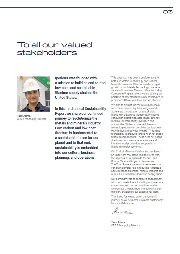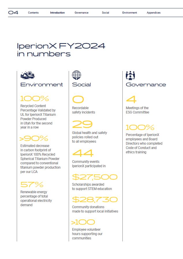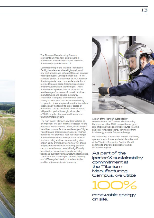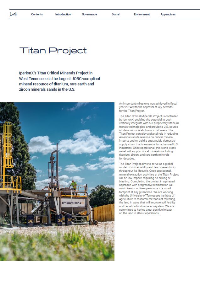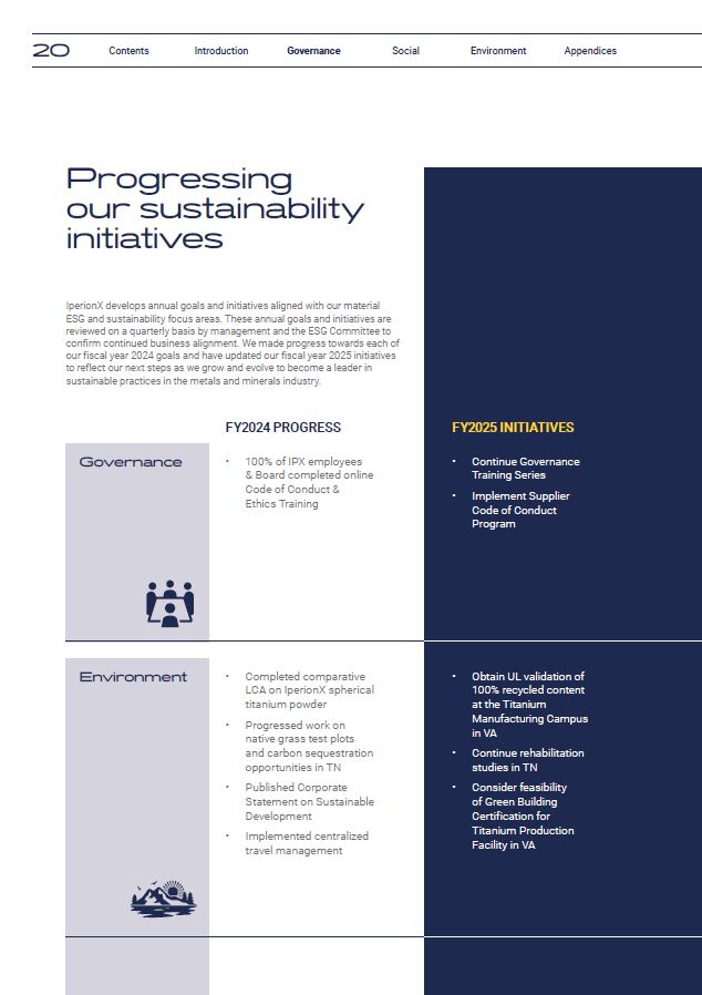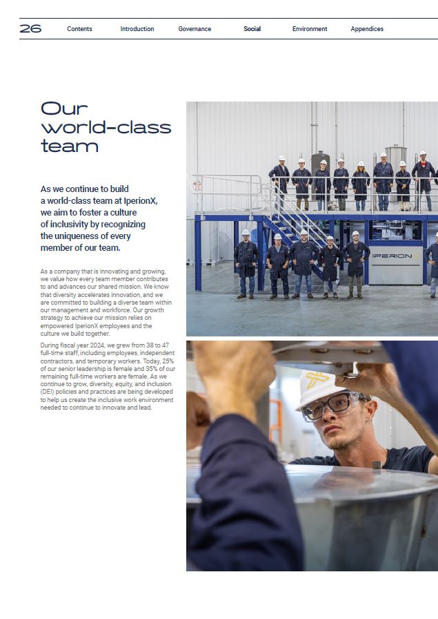 我们的能源使用IperionX专有技术可以作为一家成长中的公司,我们知道,随着我们业务的扩张,我们的能源革命性地提高了钛生产的需求,需求量将会大幅增加。降低加工钛所需的能源我们致力于确保与传统的Kroll工艺相比,我们对其进行监测。这是一个限制我们能源使用的增长和我们相应的范围1(直接燃料使用)专利技术的主要可持续性优势。我们积极监测和范围2(间接电力使用)碳跟踪我们的企业能源足迹,通过使用替代能源产生的这种影响是我们第二年分享我们的完整和设计我们的运营,以实现运营能源使用的电气化。我们的流程和高效使用能源。租赁空间的天然气供暖范围1 –直接燃料使用4,817热510.6数据来自水电费并根据办公空间的平方英尺估算所有运营地点和租赁空间的电力范围2 –间接发电量553,929 kWh 1,994数据来自水电费并根据办公空间的平方英尺估算对于设备,我们的2024财年能源使用柴油发电机范围1 –直接燃料使用83加仑12.2来自供应商账单的数据能源能源使用类型相关碳排放总量2024财年能源数据来源汽油公司车队3辆车范围1 –直接燃料使用708加仑93.3基于行驶里程的估计G展望未来:在我们位于弗吉尼亚州的钛金属制造园区,我们正在探索通过安装太阳能电池板在现场产生一部分未来能源需求的选项。为了田纳西州Titan Critical Minerals项目的未来运营,我们将继续与当地公用事业公司和田纳西河谷管理局合作,采购可再生能源来为我们的运营提供动力。44目录简介治理社会附录环境