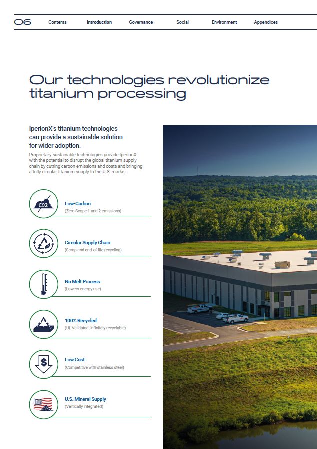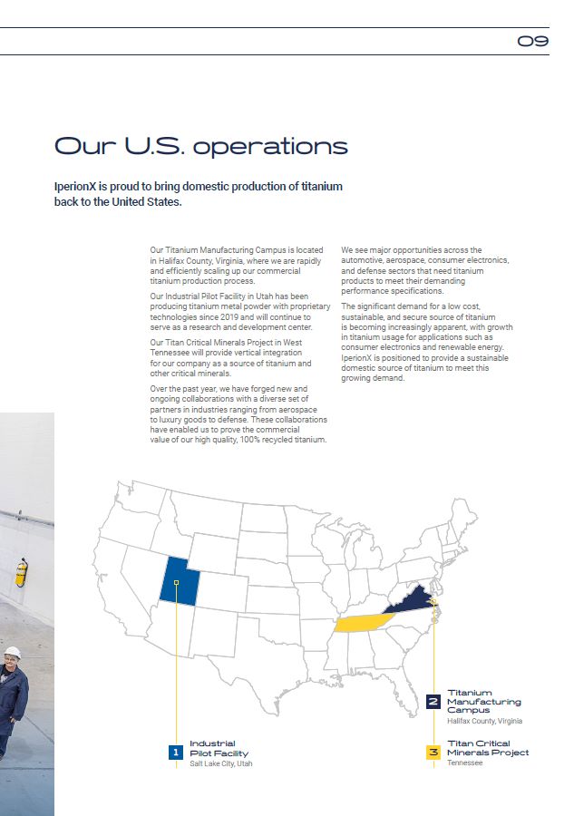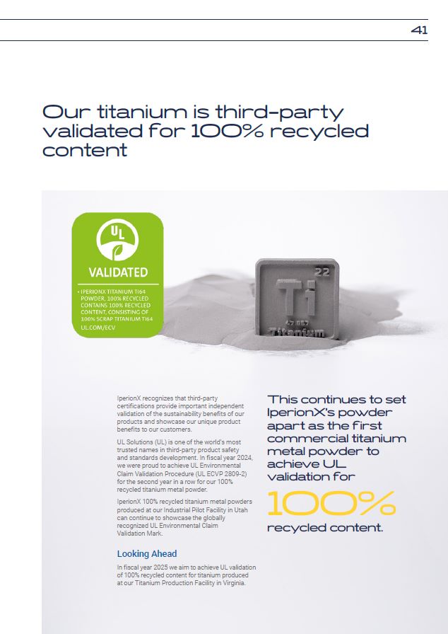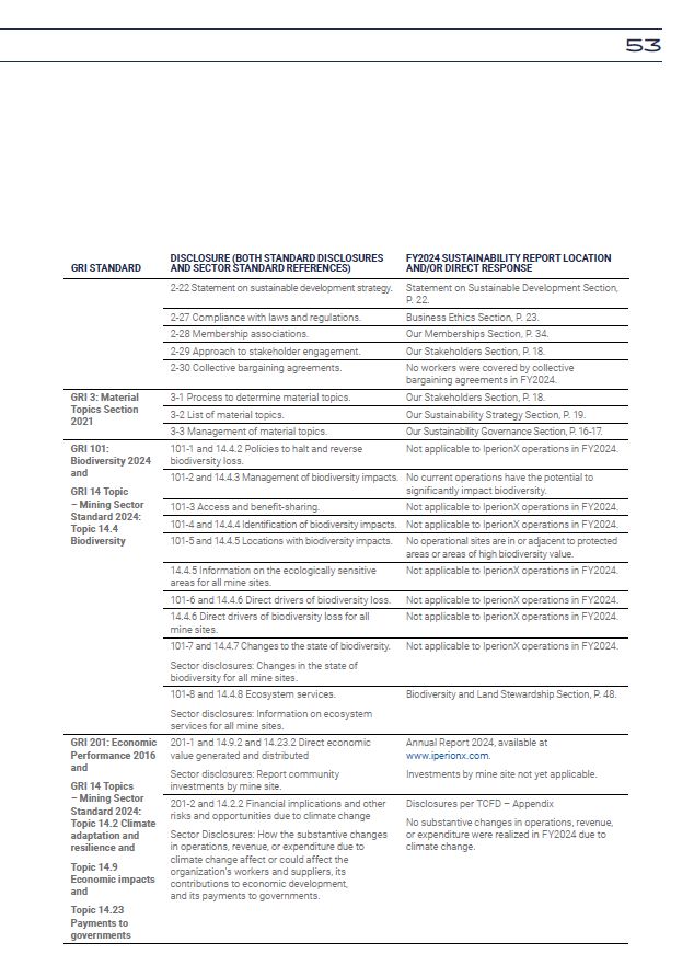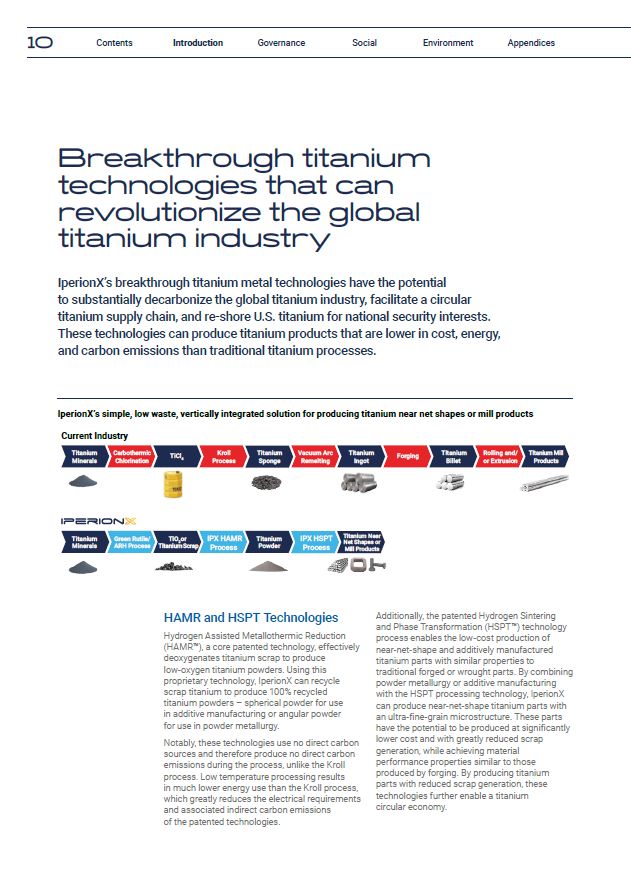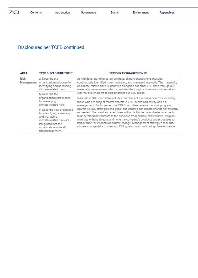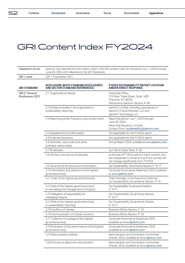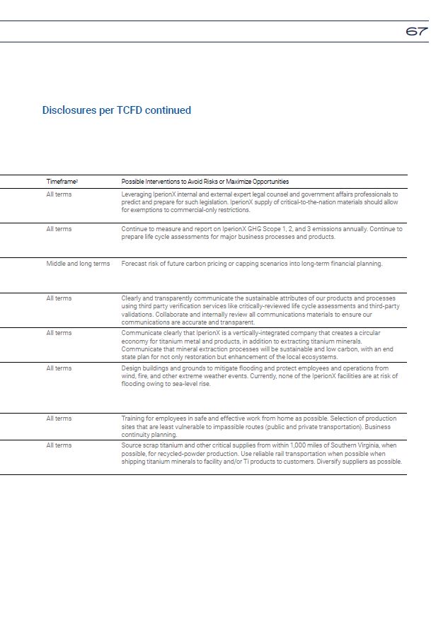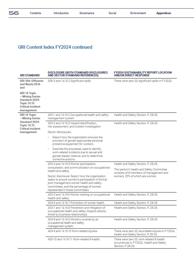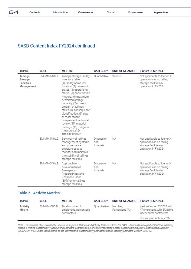 我们的能源使用IperionX专有技术可以作为一家成长中的公司,我们知道,随着我们业务的扩张,我们的能源革命性地提高了钛生产的需求,需求量将会大幅增加。降低加工钛所需的能源我们致力于确保与传统的Kroll工艺相比,我们对其进行监测。这是一个限制我们能源使用的增长和我们相应的范围1(直接燃料使用)专利技术的主要可持续性优势。我们积极监测和范围2(间接电力使用)碳跟踪我们的企业能源足迹,通过使用替代能源产生的这种影响是我们第二年分享我们的完整和设计我们的运营,以实现运营能源使用的电气化。我们的流程和高效使用能源。租赁空间的天然气供暖范围1 –直接燃料使用4,817热510.6数据来自水电费并根据办公空间的平方英尺估算所有运营地点和租赁空间的电力范围2 –间接发电量553,929 kWh 1,994数据来自水电费并根据办公空间的平方英尺估算对于设备,我们的2024财年能源使用柴油发电机范围1 –直接燃料使用83加仑12.2来自供应商账单的数据能源能源使用类型相关碳排放总量2024财年能源数据来源汽油公司车队3辆车范围1 –直接燃料使用708加仑93.3基于行驶里程的估计G展望未来:在我们位于弗吉尼亚州的钛金属制造园区,我们正在探索通过安装太阳能电池板在现场产生一部分未来能源需求的选项。为了田纳西州Titan Critical Minerals项目的未来运营,我们将继续与当地公用事业公司和田纳西河谷管理局合作,采购可再生能源来为我们的运营提供动力。44目录简介治理社会附录环境