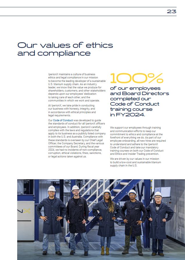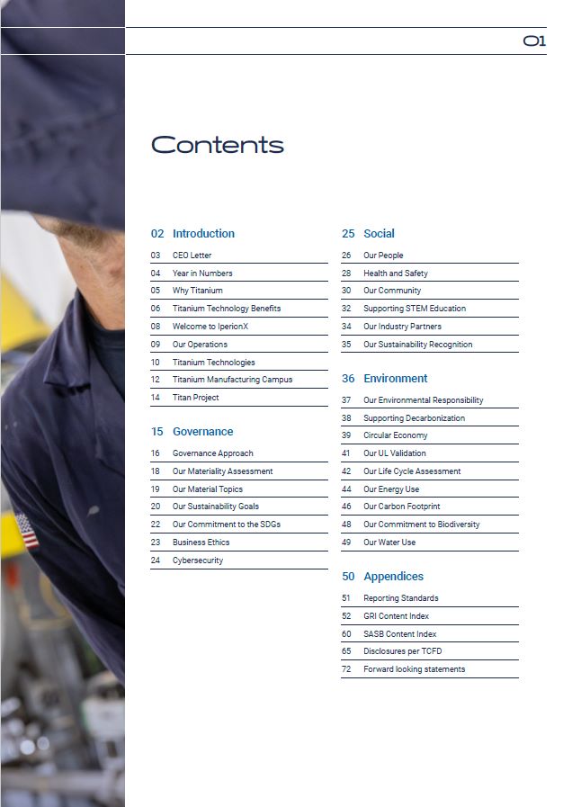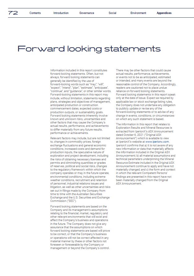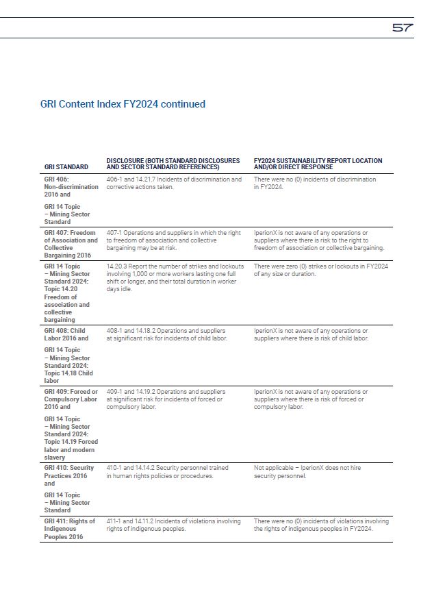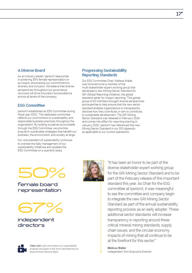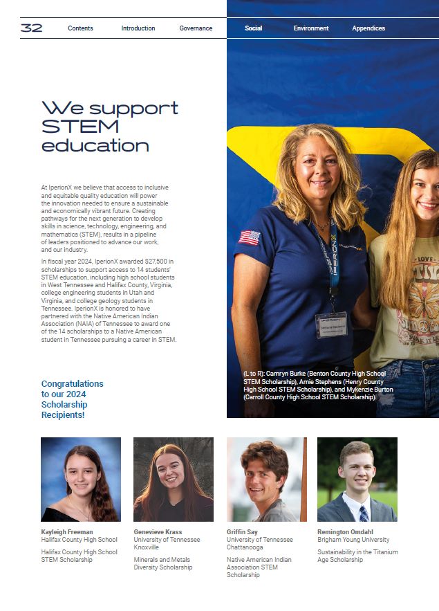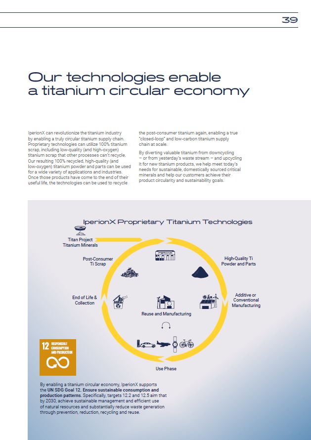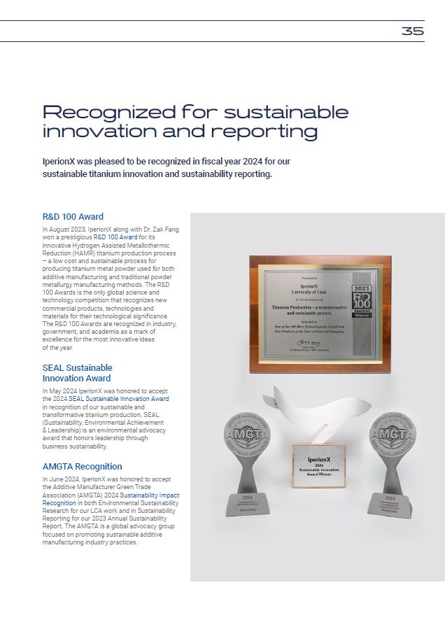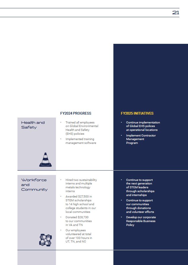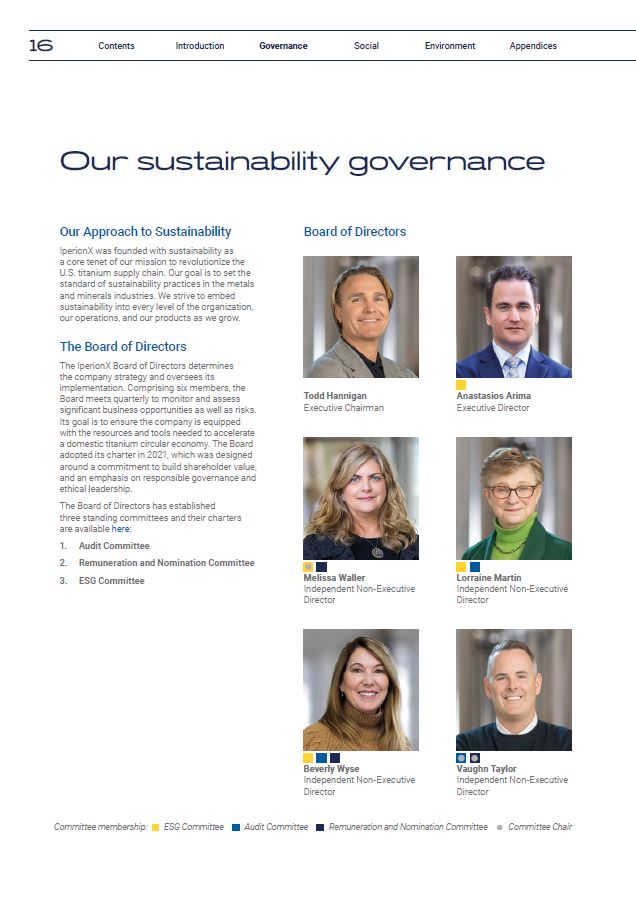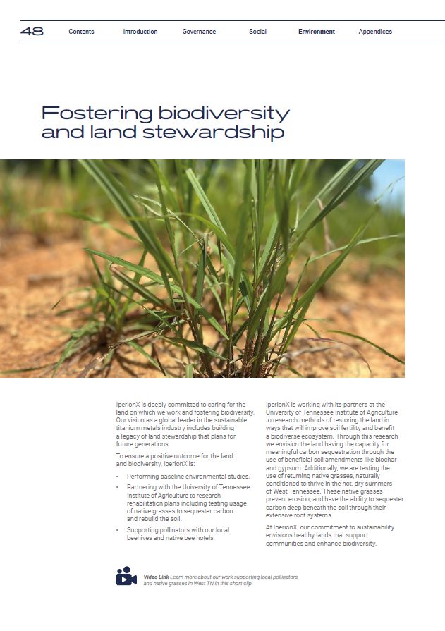 我们的能源使用IperionX专有技术可以作为一家成长中的公司,我们知道,随着我们业务的扩张,我们的能源革命性地提高了钛生产的需求,需求量将会大幅增加。降低加工钛所需的能源我们致力于确保与传统的Kroll工艺相比,我们对其进行监测。这是一个限制我们能源使用的增长和我们相应的范围1(直接燃料使用)专利技术的主要可持续性优势。我们积极监测和范围2(间接电力使用)碳跟踪我们的企业能源足迹,通过使用替代能源产生的这种影响是我们第二年分享我们的完整和设计我们的运营,以实现运营能源使用的电气化。我们的流程和高效使用能源。租赁空间的天然气供暖范围1 –直接燃料使用4,817热510.6数据来自水电费并根据办公空间的平方英尺估算所有运营地点和租赁空间的电力范围2 –间接发电量553,929 kWh 1,994数据来自水电费并根据办公空间的平方英尺估算对于设备,我们的2024财年能源使用柴油发电机范围1 –直接燃料使用83加仑12.2来自供应商账单的数据能源能源使用类型相关碳排放总量2024财年能源数据来源汽油公司车队3辆车范围1 –直接燃料使用708加仑93.3基于行驶里程的估计G展望未来:在我们位于弗吉尼亚州的钛金属制造园区,我们正在探索通过安装太阳能电池板在现场产生一部分未来能源需求的选项。为了田纳西州Titan Critical Minerals项目的未来运营,我们将继续与当地公用事业公司和田纳西河谷管理局合作,采购可再生能源来为我们的运营提供动力。44目录简介治理社会附录环境