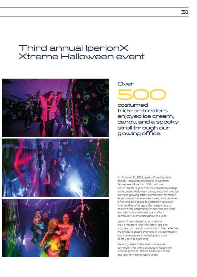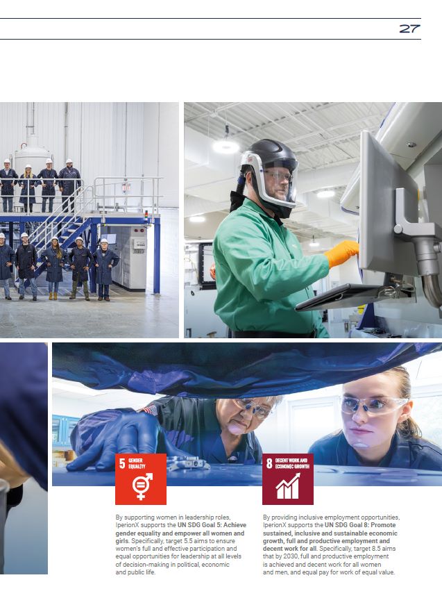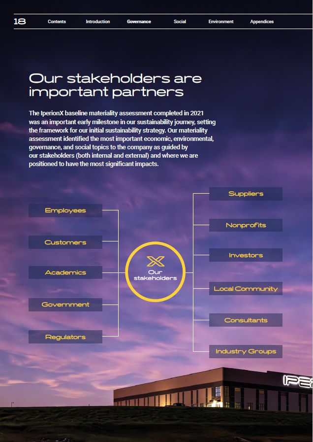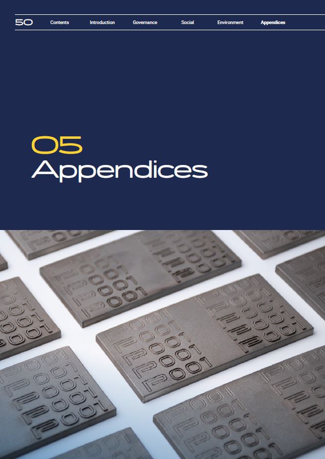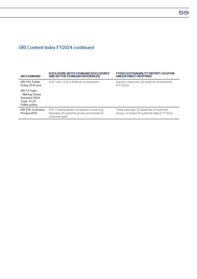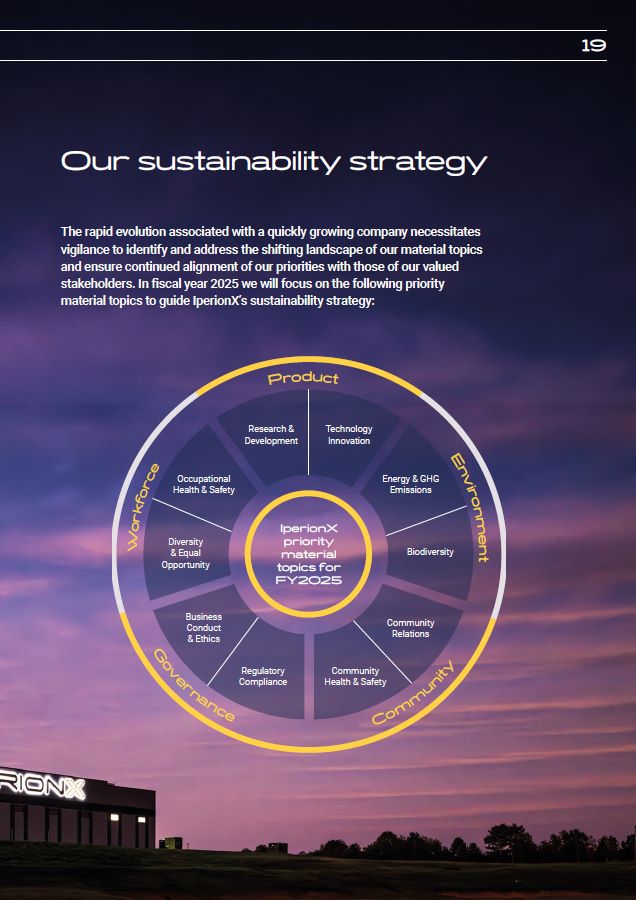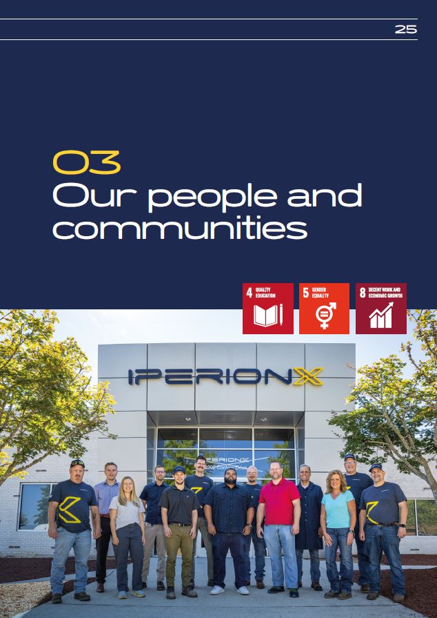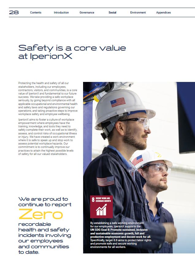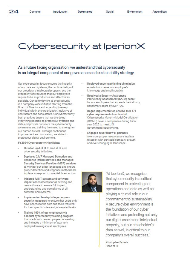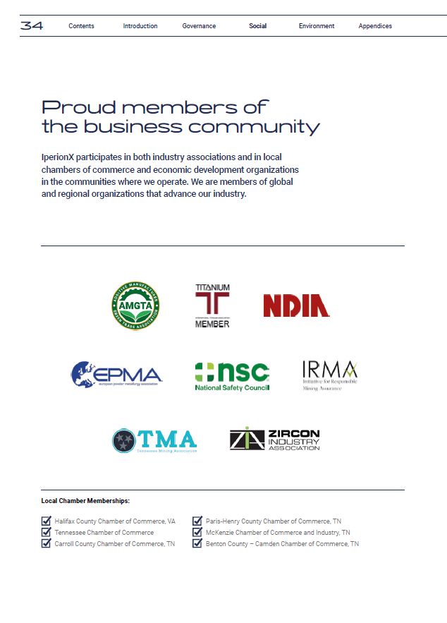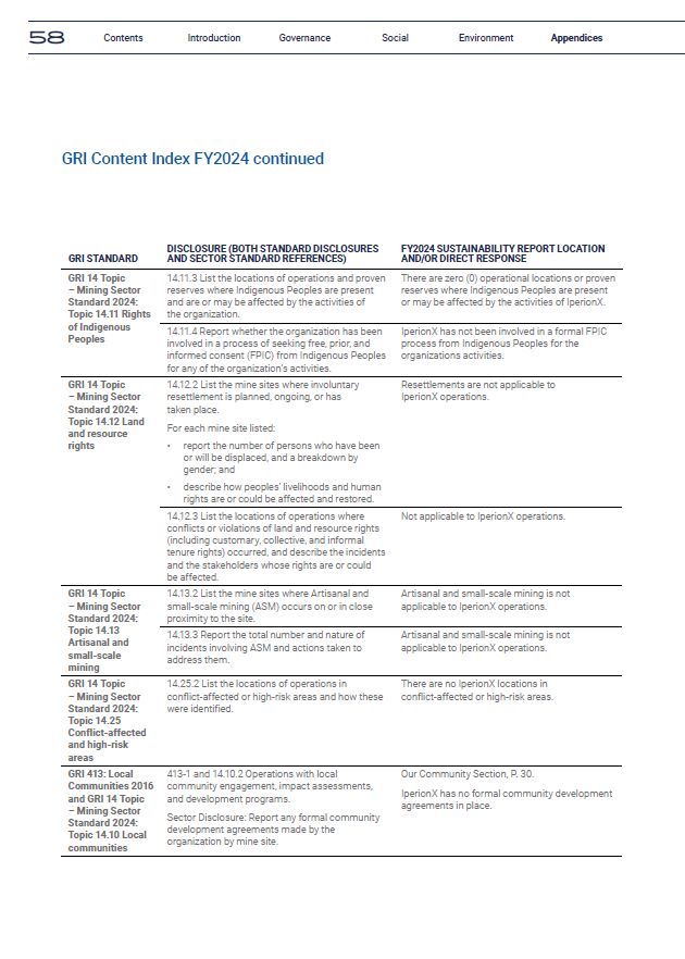 我们的能源使用IperionX专有技术可以作为一家成长中的公司,我们知道,随着我们业务的扩张,我们的能源革命性地提高了钛生产的需求,需求量将会大幅增加。降低加工钛所需的能源我们致力于确保与传统的Kroll工艺相比,我们对其进行监测。这是一个限制我们能源使用的增长和我们相应的范围1(直接燃料使用)专利技术的主要可持续性优势。我们积极监测和范围2(间接电力使用)碳跟踪我们的企业能源足迹,通过使用替代能源产生的这种影响是我们第二年分享我们的完整和设计我们的运营,以实现运营能源使用的电气化。我们的流程和高效使用能源。租赁空间的天然气供暖范围1 –直接燃料使用4,817热510.6数据来自水电费并根据办公空间的平方英尺估算所有运营地点和租赁空间的电力范围2 –间接发电量553,929 kWh 1,994数据来自水电费并根据办公空间的平方英尺估算对于设备,我们的2024财年能源使用柴油发电机范围1 –直接燃料使用83加仑12.2来自供应商账单的数据能源能源使用类型相关碳排放总量2024财年能源数据来源汽油公司车队3辆车范围1 –直接燃料使用708加仑93.3基于行驶里程的估计G展望未来:在我们位于弗吉尼亚州的钛金属制造园区,我们正在探索通过安装太阳能电池板在现场产生一部分未来能源需求的选项。为了田纳西州Titan Critical Minerals项目的未来运营,我们将继续与当地公用事业公司和田纳西河谷管理局合作,采购可再生能源来为我们的运营提供动力。44目录简介治理社会附录环境