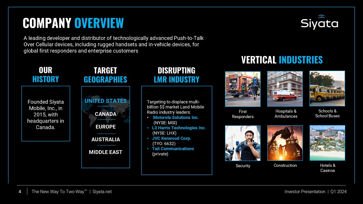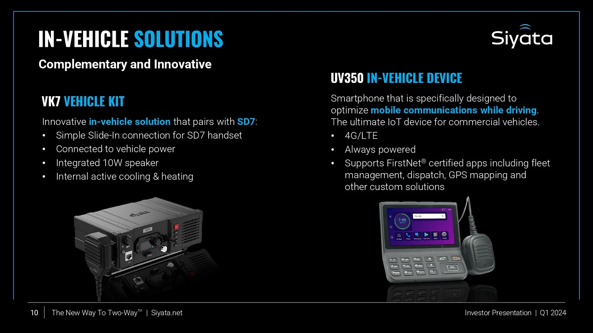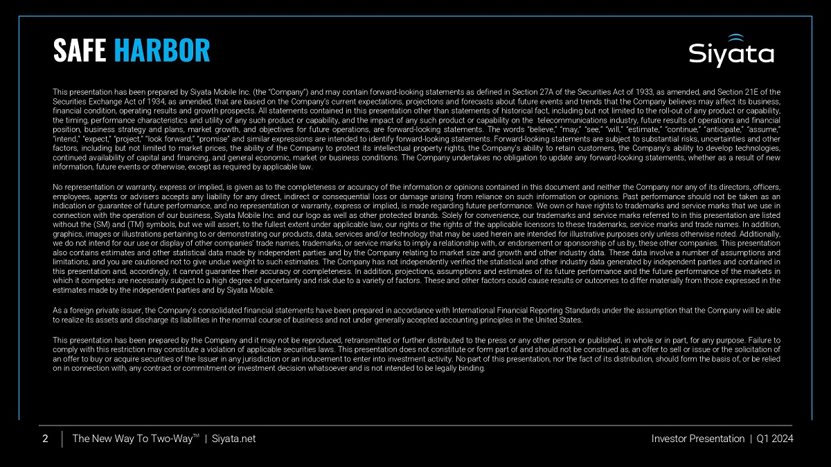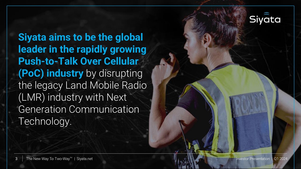 SAFE HARBOR本演示文稿由Siyata Mobile Inc.(“公司”)编制,可能包含经修订的1933年证券法第27A条和经修订的1934年证券交易法第21E条定义的前瞻性陈述,这些陈述基于公司当前对公司认为可能影响其业务、财务状况、经营业绩和增长前景的未来事件和趋势的预期、预测和预测。除历史事实陈述外,本演示文稿中包含的所有陈述,包括但不限于任何产品或能力的推出、任何此类产品或能力的时机、性能特征和效用,以及任何此类产品或能力对电信行业、未来运营结果和财务状况、业务战略和计划、市场增长以及未来运营目标的影响,均为前瞻性陈述。“相信”、“可能”、“看到”、“将”、“估计”、“继续”、“预期”、“假设”、“打算”、“预期”、“项目”、“展望”、“承诺”等类似表述旨在识别前瞻性陈述。前瞻性陈述受到重大风险、不确定性和其他因素的影响,包括但不限于市场价格、公司保护其知识产权的能力、公司留住客户的能力、公司开发技术的能力、资本和融资的持续可用性以及总体经济、市场或商业状况。公司不承担更新任何前瞻性陈述的义务,无论是由于新信息、未来事件或其他原因,除非适用法律要求。对本文件所载信息或意见的完整性或准确性不作任何明示或暗示的陈述或保证,公司或其任何董事、高级职员、雇员、代理人或顾问均不对因依赖此类信息或意见而引起的任何直接、间接或后果性损失或损害承担任何责任。过去的业绩不应被视为未来业绩的指示或保证,也不对未来业绩作出任何明示或暗示的陈述或保证。我们拥有或拥有我们在经营业务时使用的商标和服务标志、Siyata Mobile Inc.和我们的徽标以及其他受保护品牌的权利。仅为方便起见,本演示文稿中提及的我们的商标和服务标记没有列出(SM)和(TM)符号,但我们将根据适用法律在最大程度上主张我们的权利或适用许可人对这些商标、服务标记和商品名称的权利。此外,除非另有说明,与或演示我们可能在此使用的产品、数据、服务和/或技术有关的图形、图像或插图仅用于说明目的。此外,我们不打算为我们使用或展示其他公司的商号、商标或服务标记而暗示与这些其他公司的关系,或由我们背书或赞助。本演示文稿还包含独立方和公司做出的与市场规模和增长相关的估计和其他统计数据以及其他行业数据。这些数据涉及许多假设和限制,请注意不要对这些估计给予不应有的权重。本公司未对独立各方产生并包含在本演示文稿中的统计数据和其他行业数据进行独立验证,因此无法保证其准确性或完整性。此外,对其未来业绩的预测、假设和估计以及其所竞争市场的未来业绩必然受到多种因素的高度不确定性和风险的影响。这些因素和其他因素可能导致结果或结果与独立方和Siyata Mobile作出的估计中表达的结果或结果存在重大差异。作为一家外国私人发行人,公司的合并财务报表是根据国际财务报告准则编制的,假设公司将能够在正常业务过程中变现其资产并清偿其负债,而不是根据美国公认会计原则。本演示文稿由本公司编制,不得为任何目的复制、转发或进一步分发给新闻界或任何其他人士或全部或部分出版。不遵守这一限制可能构成违反适用的证券法。本演示文稿不构成或构成也不应被解释为, 在任何司法管辖区出售或发行要约或征求购买或收购发行人证券的要约或进行投资活动的诱因。本演示文稿的任何部分,或其分配的事实,均不应构成任何合同或承诺或投资决定的基础,或与之相关而被依赖,且无意具有法律约束力。2投资者宣讲会| 2024年Q1双向新方式TM |思雅达网