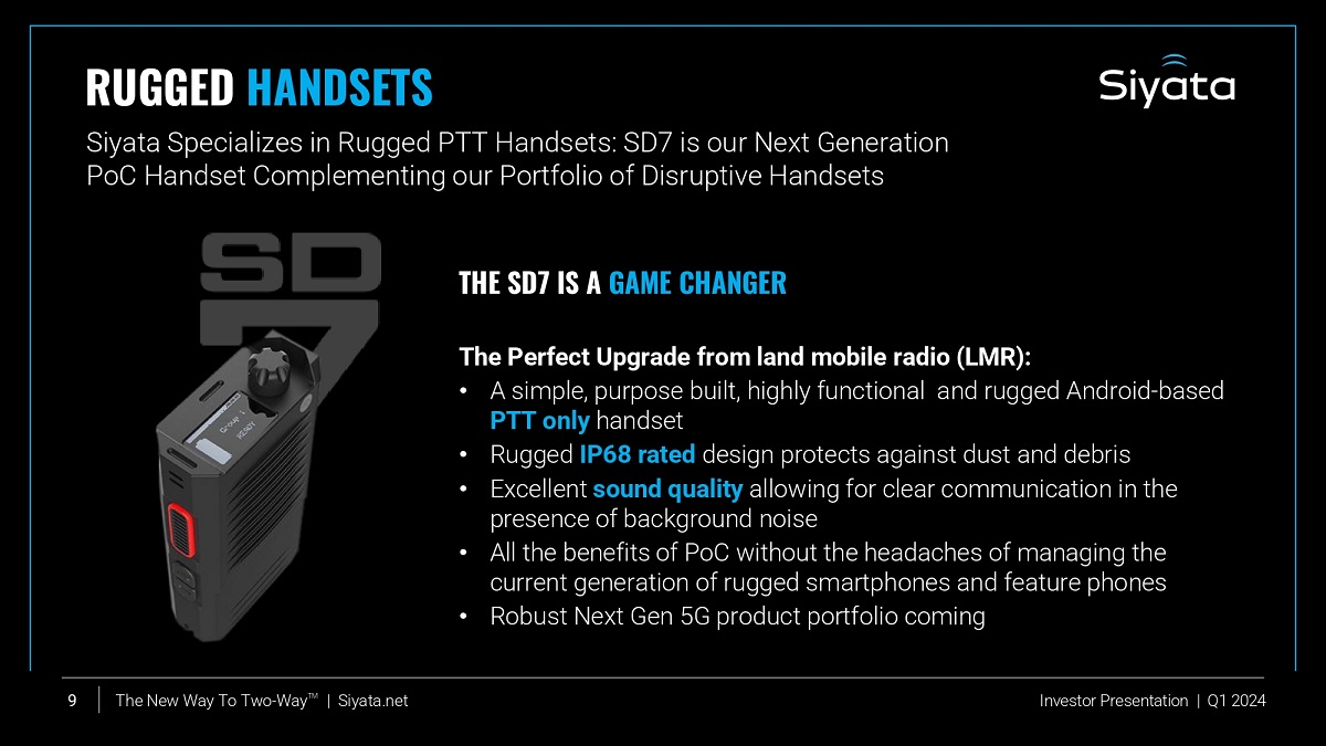 9款Rugged HandSets Siyata专攻Rugged PTT手机:SD7是我们的下一代POC手机,补充了我们的颠覆性手机产品组合SD7是一款游戏改变者从陆地移动无线电(LMR)的完美升级:•一个简单、有目的的构建,功能强大且坚固耐用的基于Android的PTT only手机•坚固耐用的IP68级设计可防止灰尘和碎片•出色的音质允许在存在背景噪音的情况下进行清晰的通信• POC的所有好处,而无需为管理当前这一代坚固耐用的智能手机和功能手机而头疼•稳健的下一代5G产品组合即将到来投资者介绍| 2024年第一季度通往双向的新方式TM | Siyata.net