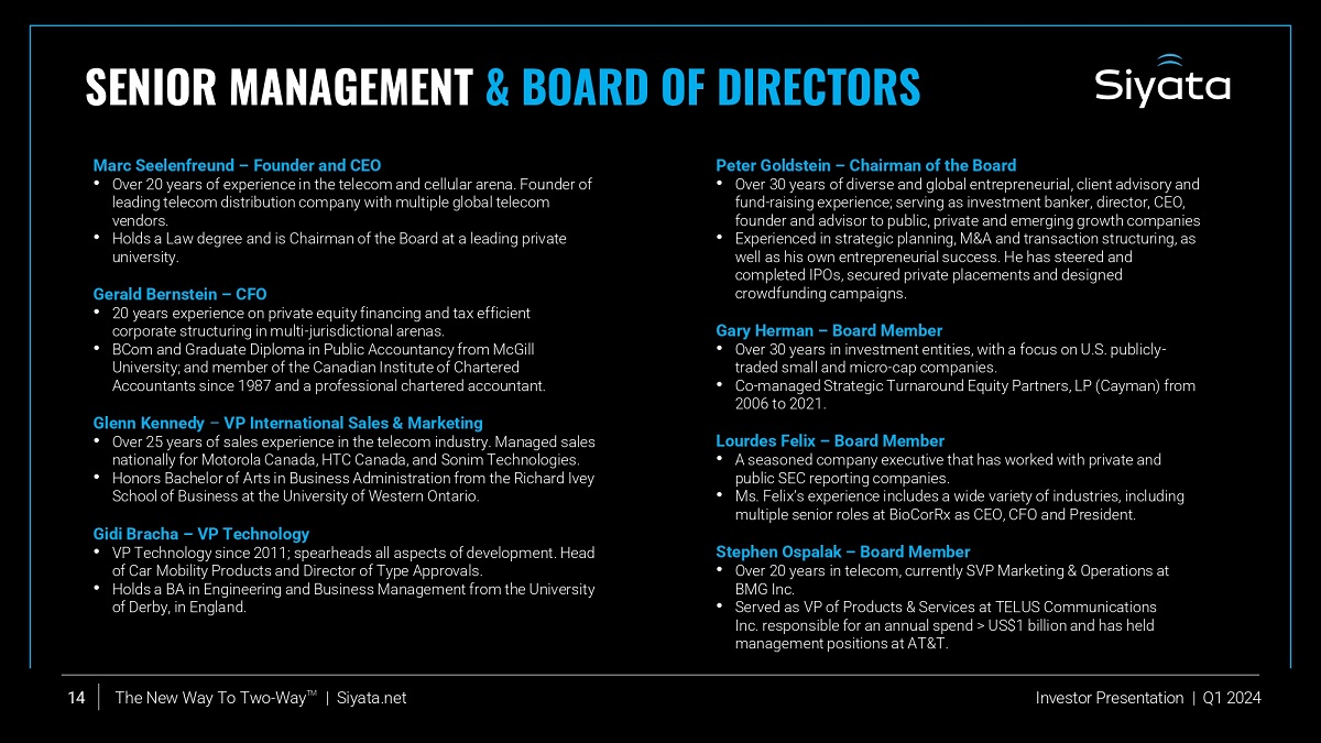 13资本化表1。备考纳入37,023只预筹认股权证,报0.07美元。2.不包括在770美元及以上的22,171份期权和认股权证。截至2024年2月5日NASDAQ:SYTA 607,485股已发行普通股14,390股限制性股票单位17,143份期权@5.01629,018美元完全稀释后已发行2股投资者介绍| 2024年第一季度通往双向的新方式TM | Siyata.net